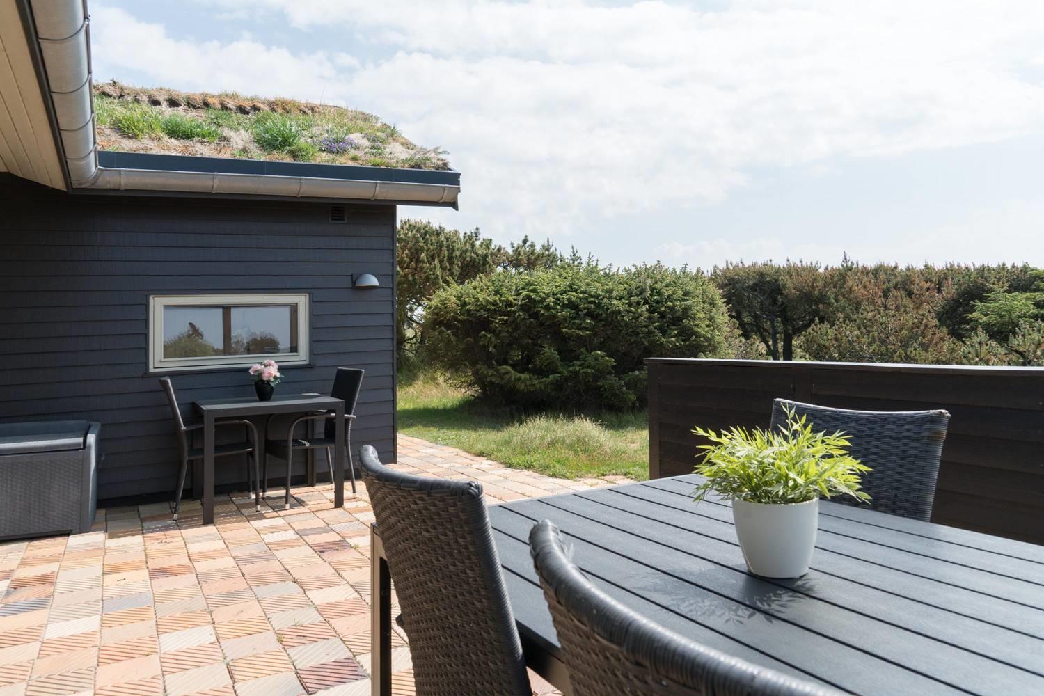 Udendørs kan du nyde to skønne terrasser, hvoraf den ene har en lukket og ugenert gårdhave. Der er tre gode soverum med dobbeltsenge, hvilket gør huset ideelt til både familier og venner.