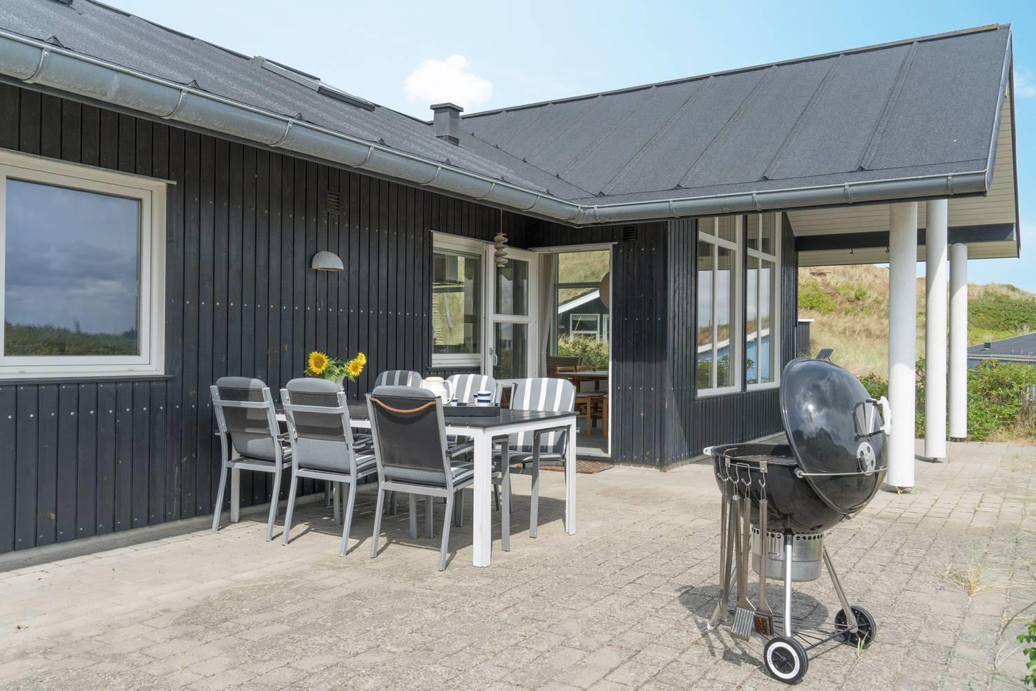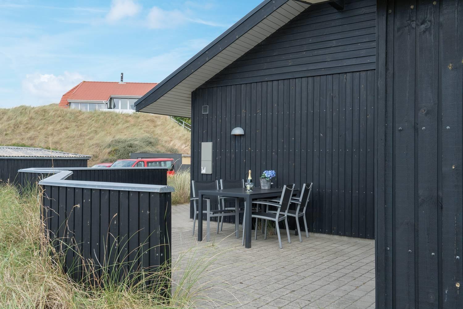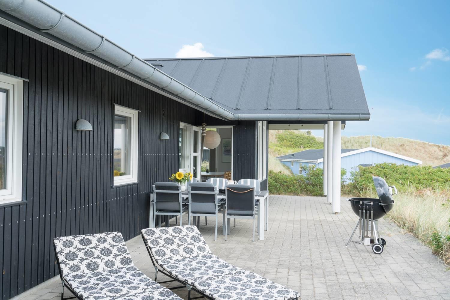 Charmerende feriehus i Henne Strand med udsigt over klitter og tæt på Vesterhavet, moderne faciliteter og to terrasser.