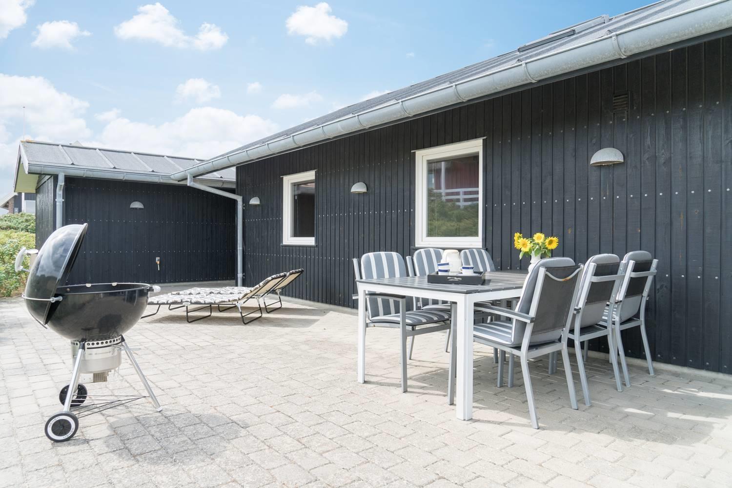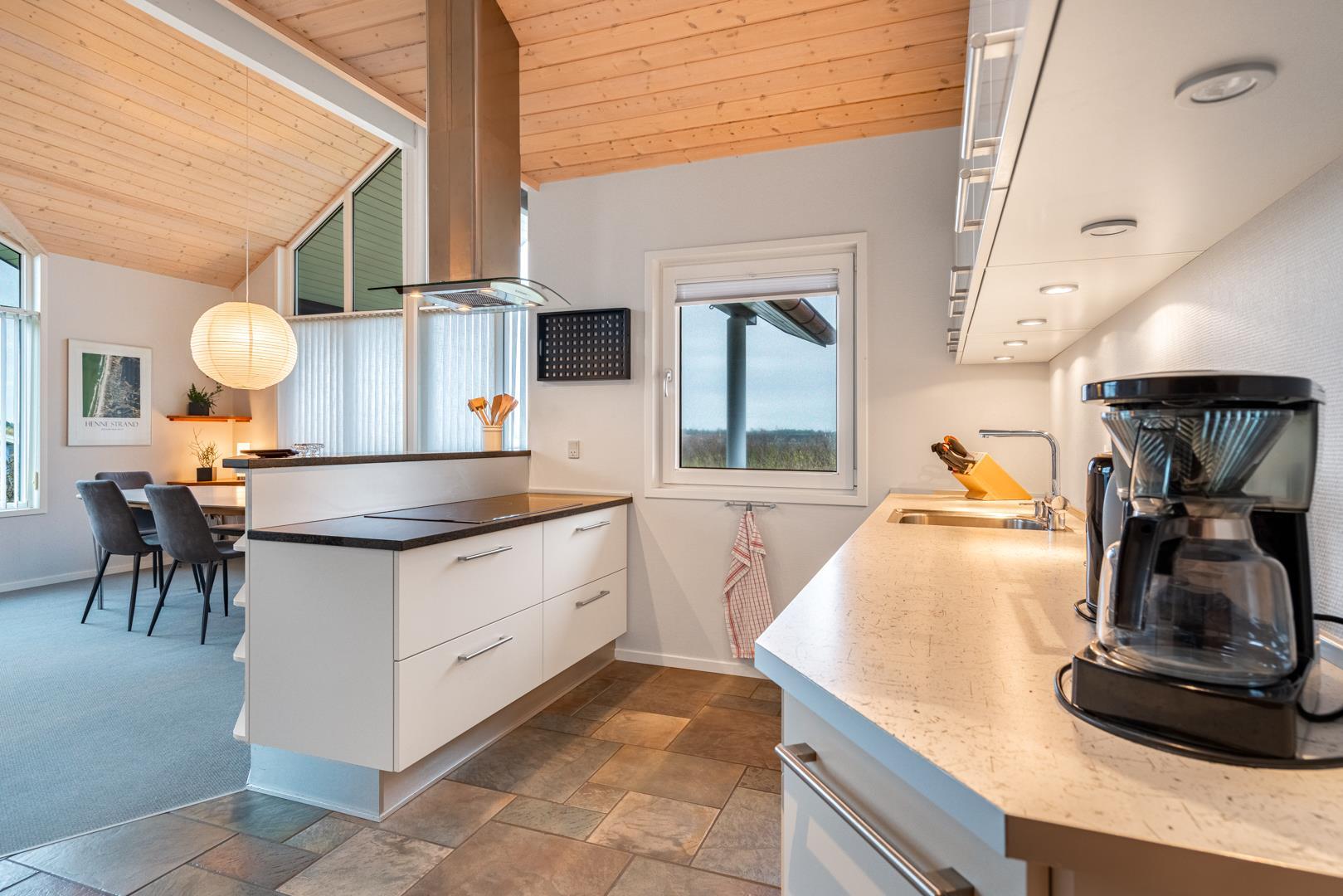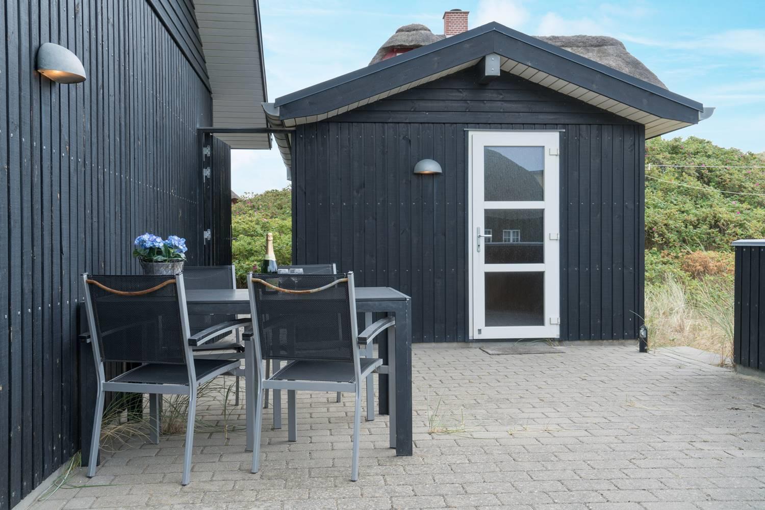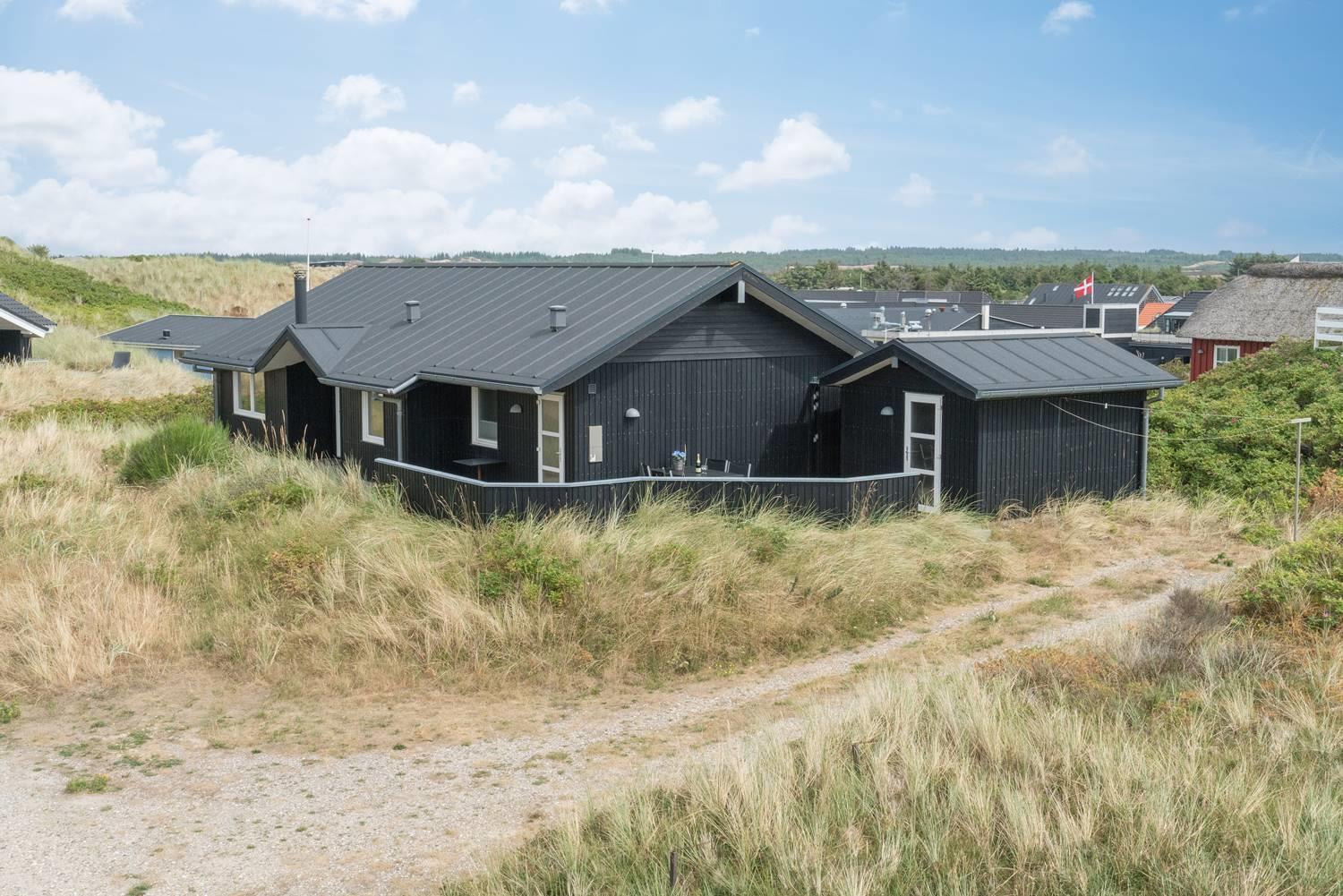 Charmerende feriehus i Henne Strand med udsigt over klitter og tæt på Vesterhavet, moderne faciliteter og to terrasser.