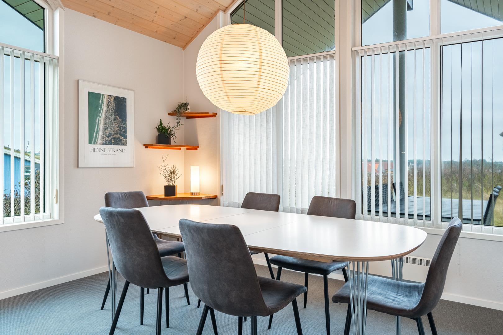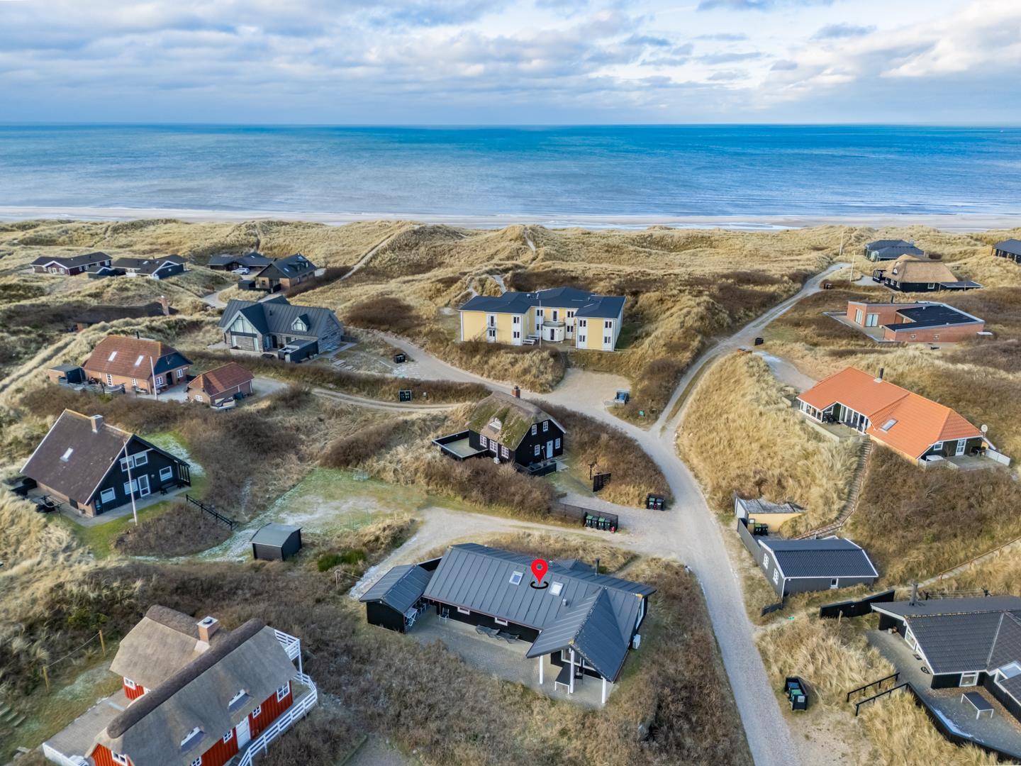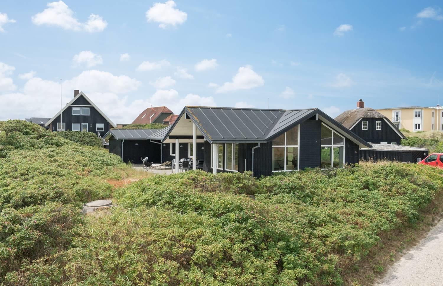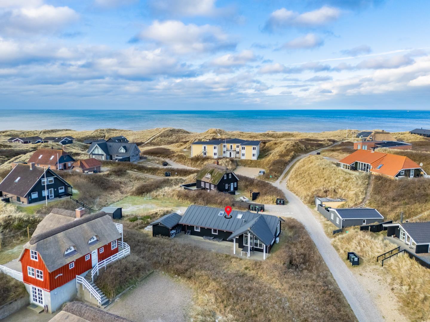 Roligt hævet, på en klitgrund i hjertet af Henne Strand og få minutters gang fra Vesterhavet, findes dette yderst velholdte og charmerende feriehus. Huset har en pragtfuld udsigt over byen og klitlandskabet. Huset er indrettet med gulvvarme, klimaanlæg samt brændeovn og har 2 badeværelser med bruser. Fra stuen er der udgang til en læfyldt østvendt terrasse, ligesom huset har en terrasse mod sydvest. Det veludstyrede køkken er i åben forbindelse med opholdsstuen, som er indrettet med gode og komfortable møbler. 3 soveværelser med plads til babyseng alle udstyret med gode senge. Der er 2 depotrum, det ene med ekstra køleskab og fryser.