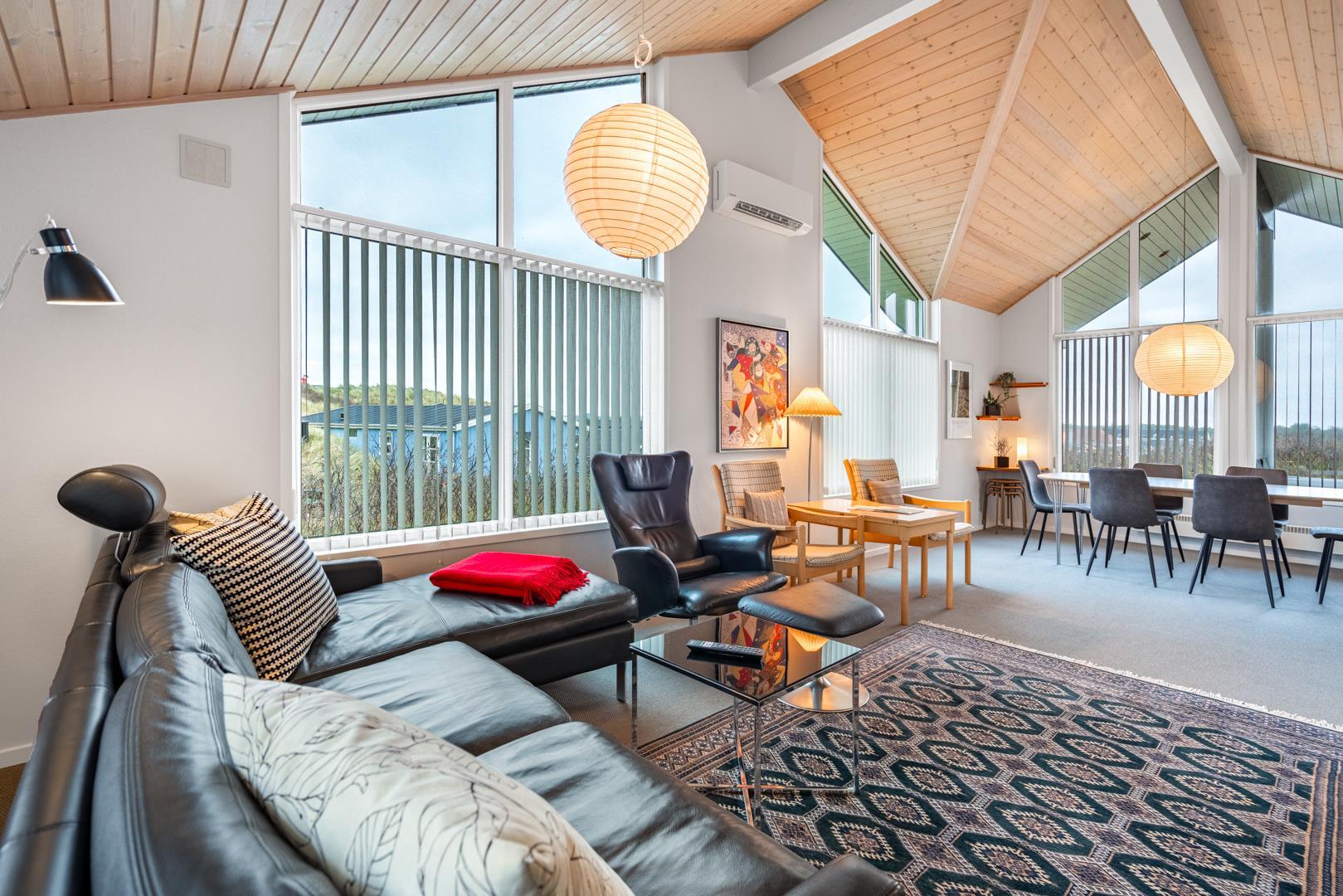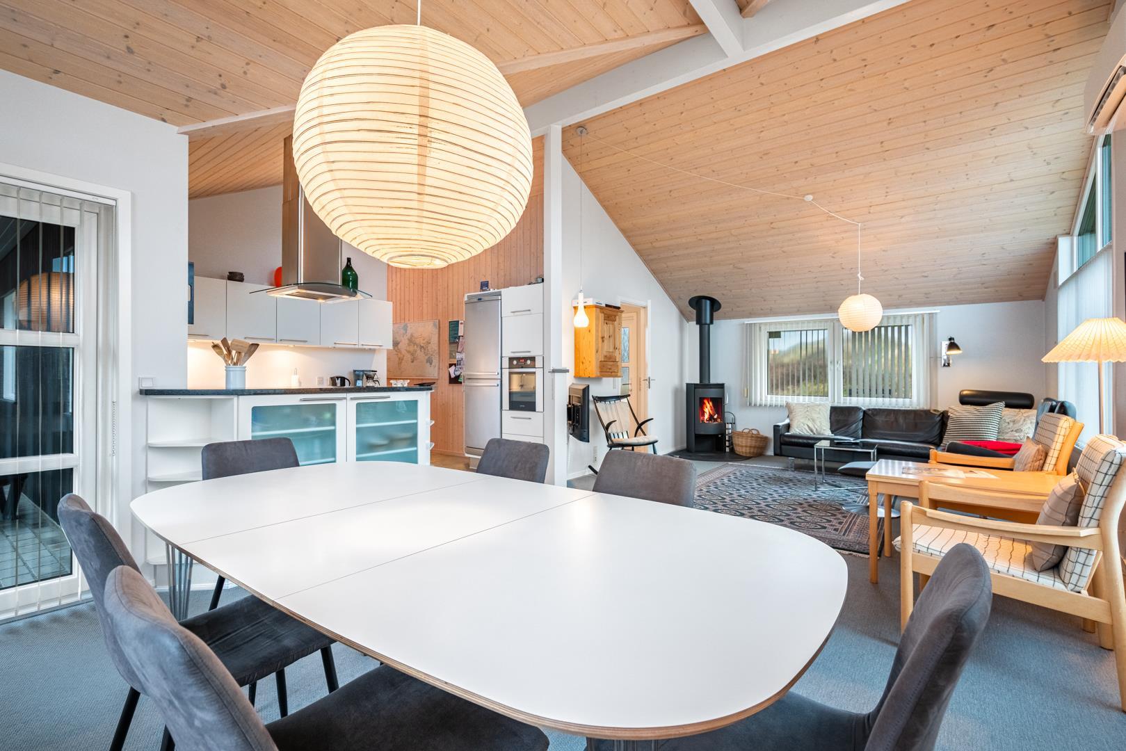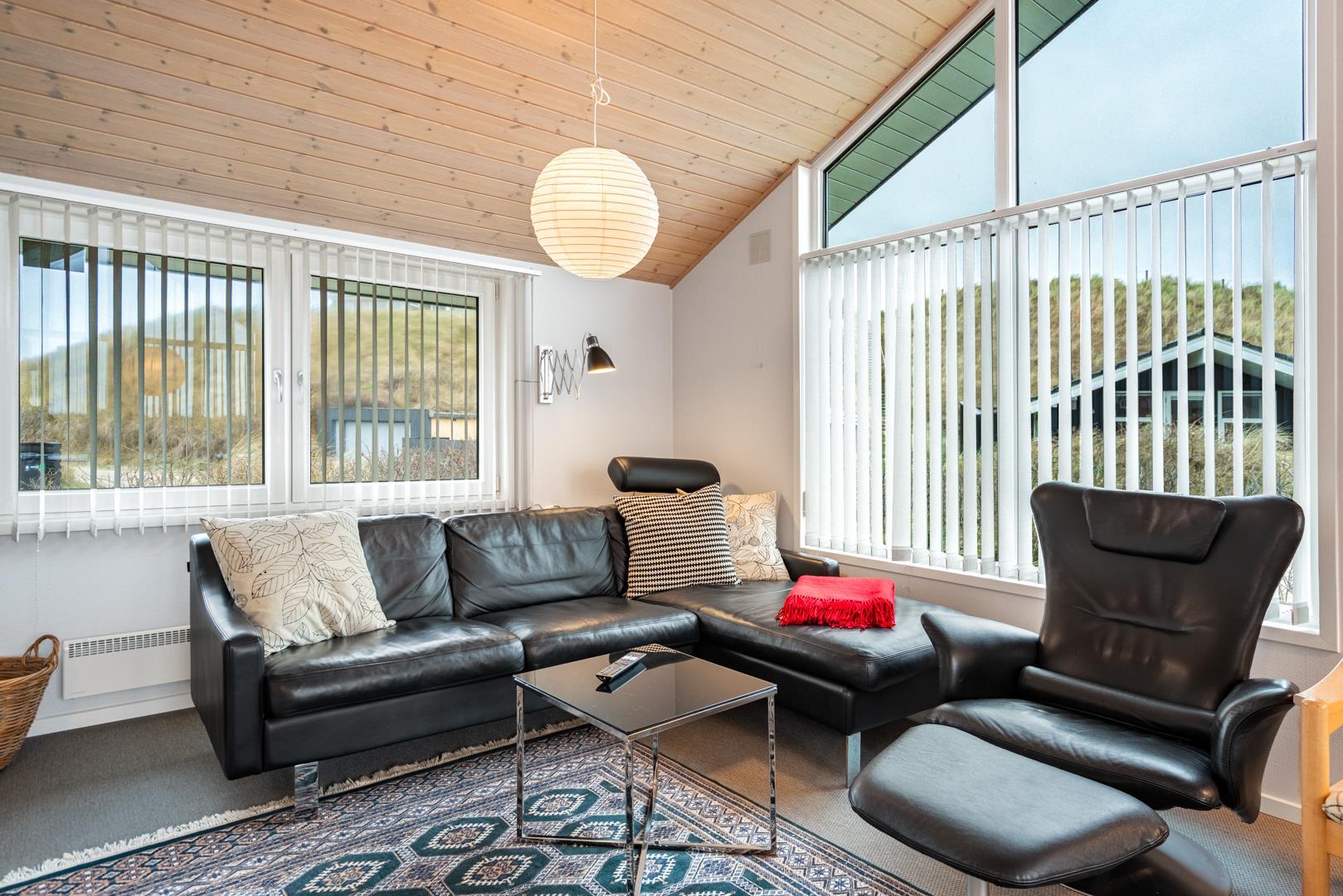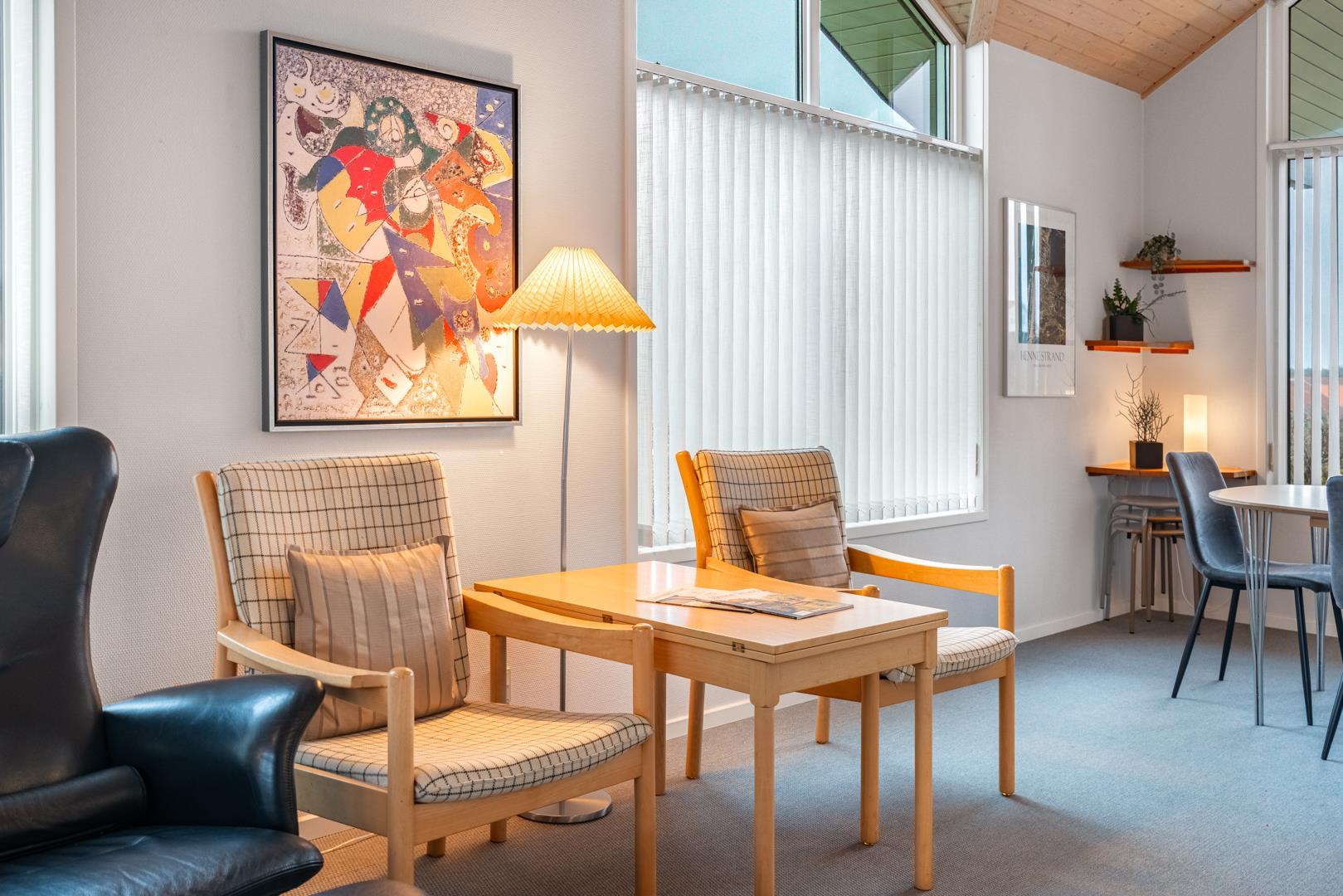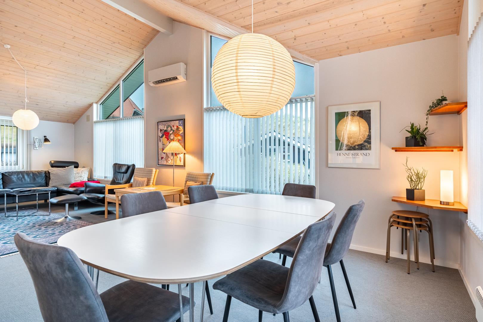 Roligt hævet, på en klitgrund i hjertet af Henne Strand og få minutters gang fra Vesterhavet, findes dette yderst velholdte og charmerende feriehus. Huset har en pragtfuld udsigt over byen og klitlandskabet. Huset er indrettet med gulvvarme, klimaanlæg samt brændeovn og har 2 badeværelser med bruser. Fra stuen er der udgang til en læfyldt østvendt terrasse, ligesom huset har en terrasse mod sydvest. Det veludstyrede køkken er i åben forbindelse med opholdsstuen, som er indrettet med gode og komfortable møbler. 3 soveværelser med plads til babyseng alle udstyret med gode senge. Der er 2 depotrum, det ene med ekstra køleskab og fryser.