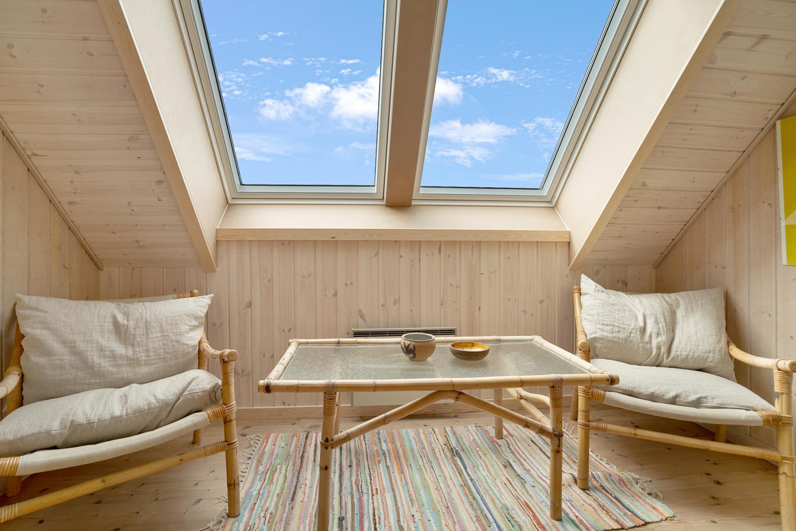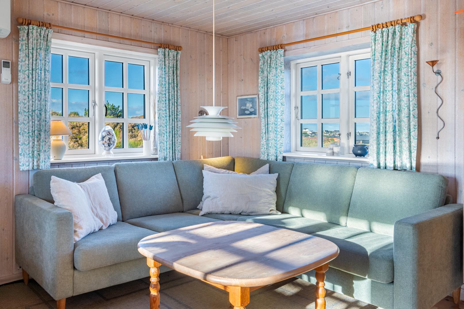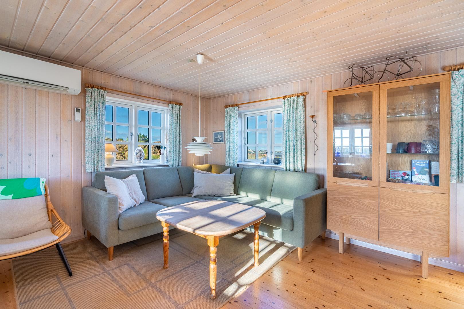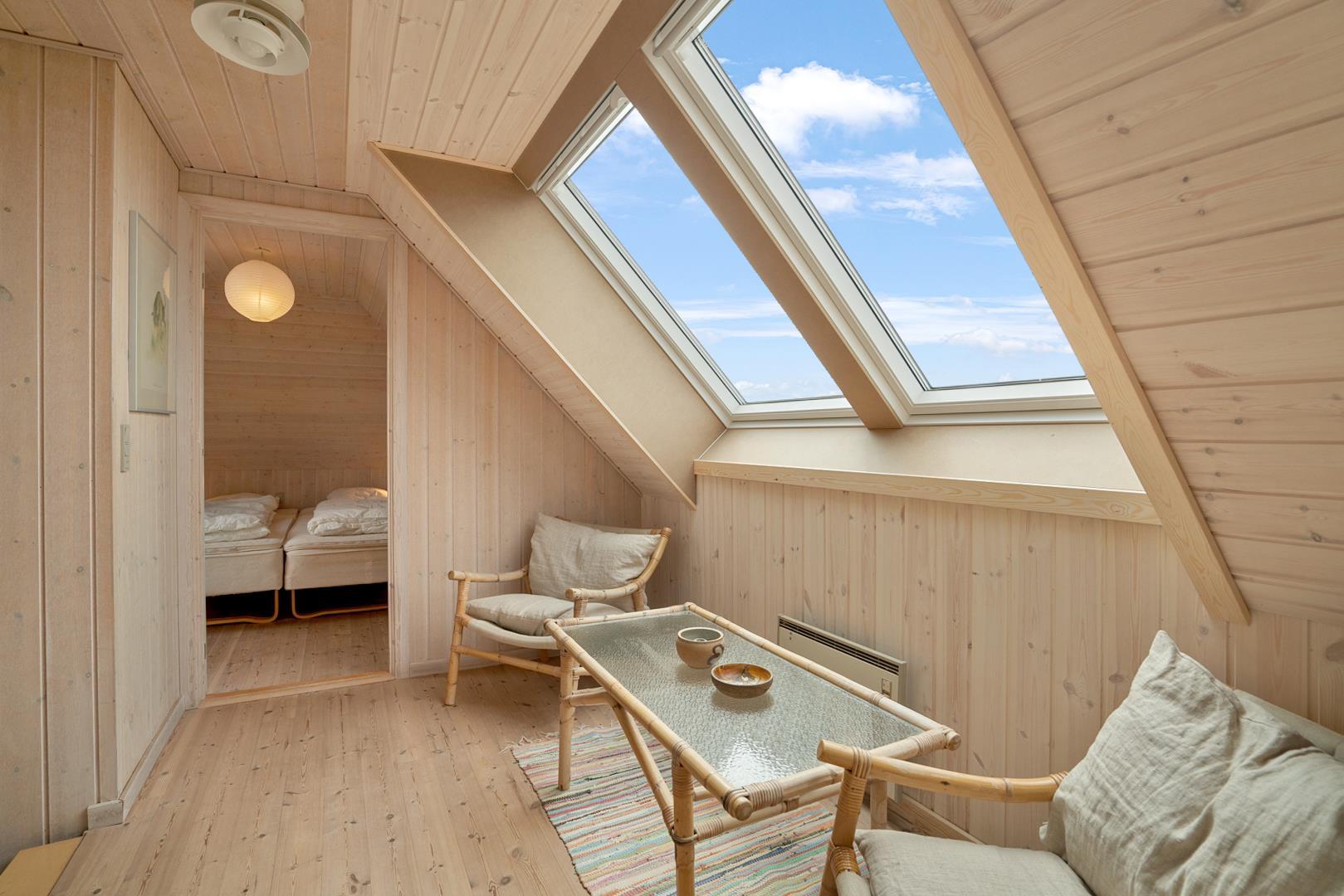 Den hyggelige stue, er lagt sammen med køkkenet. Når brændeovnen tændes op, breder varmen sig til hele huset. På 1. etage er der 2 lyse og dejlige soverum, og et lille læse hjørne ved vinduet hvorfra man kan se havet. I badeværelset er der også en sauna.