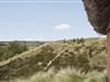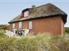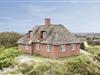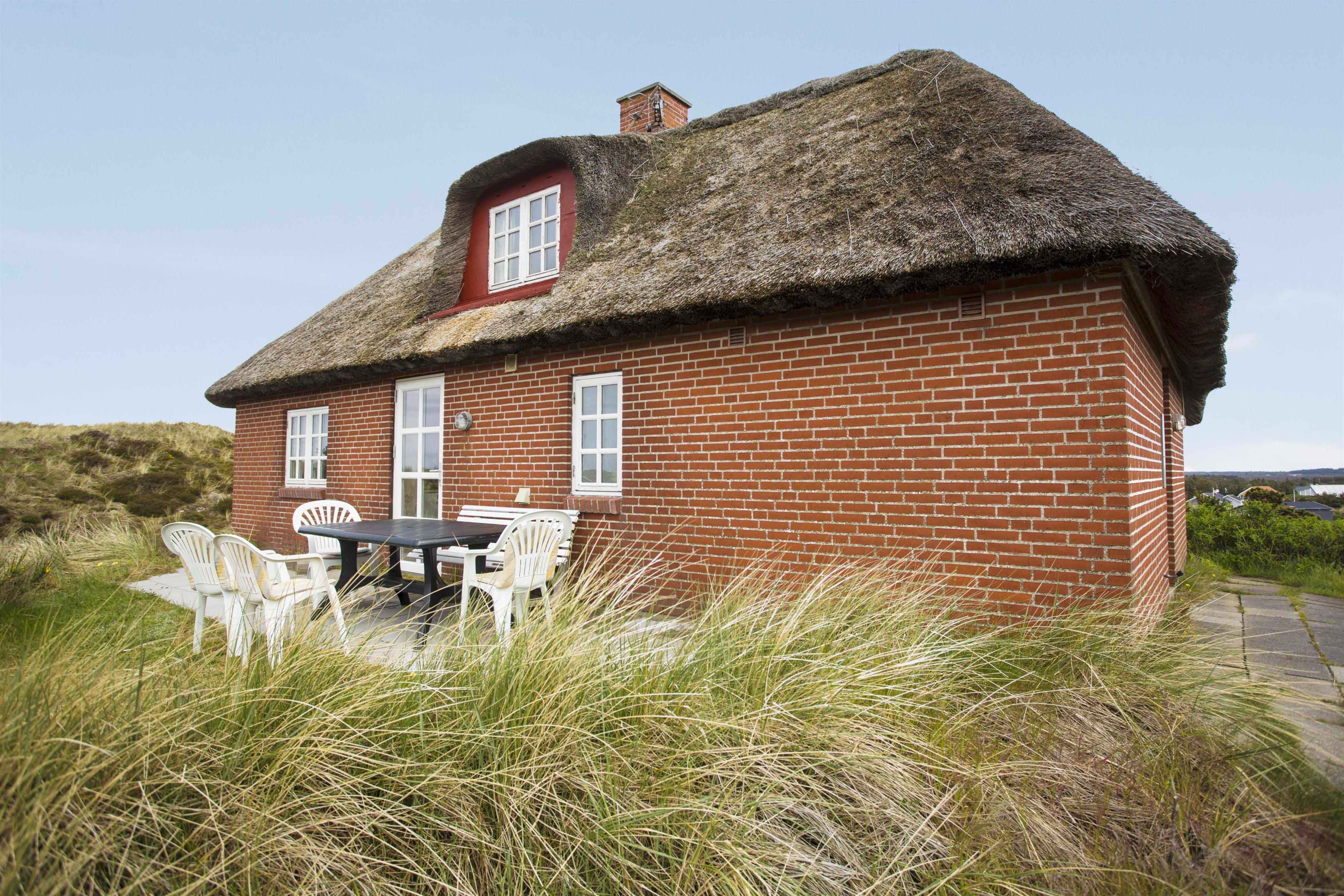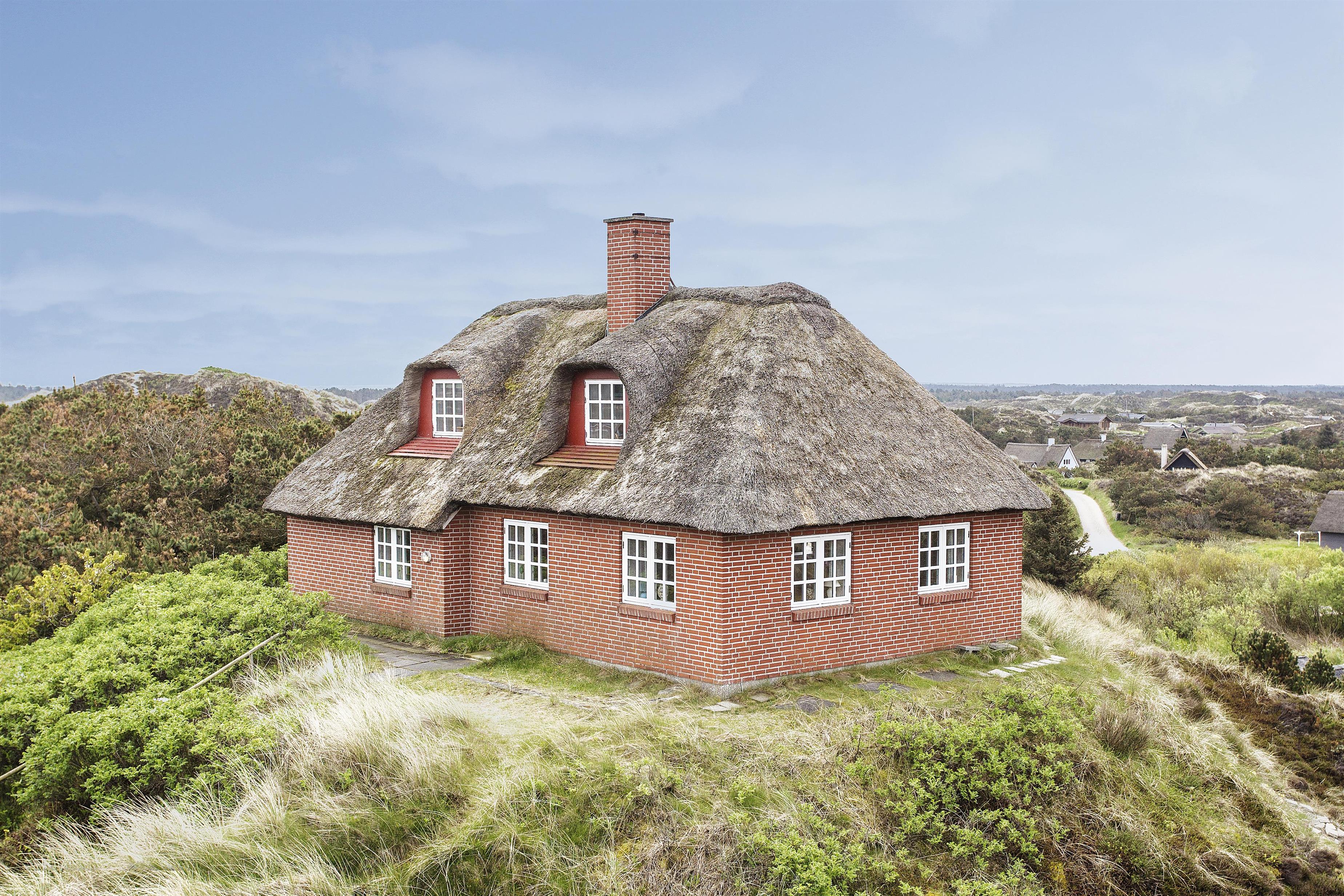 Dette sommerhus med stråtag ligger smukt på toppen af en klit med udsigt over hede og klitlandskab.