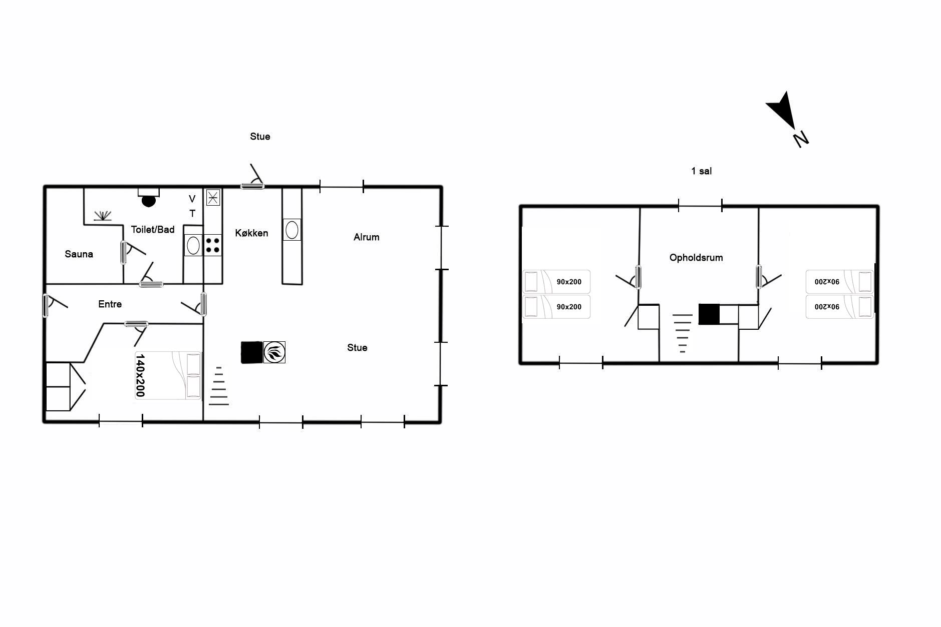 Sengestørrelse: 2 dobbeltsenge med 2 madrasser 90 x 200 cm + 1 dobbeltseng 140 x 200 cm.