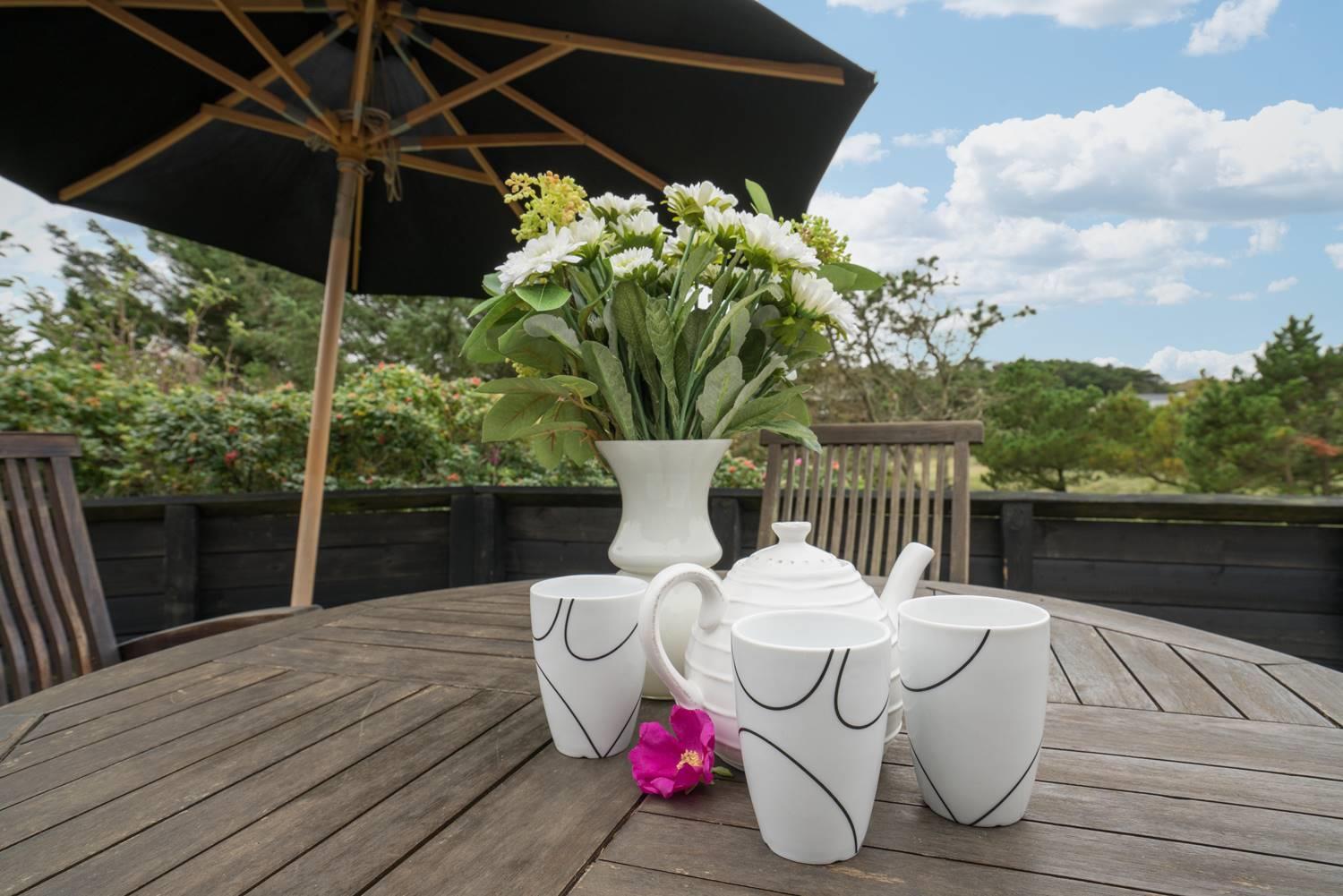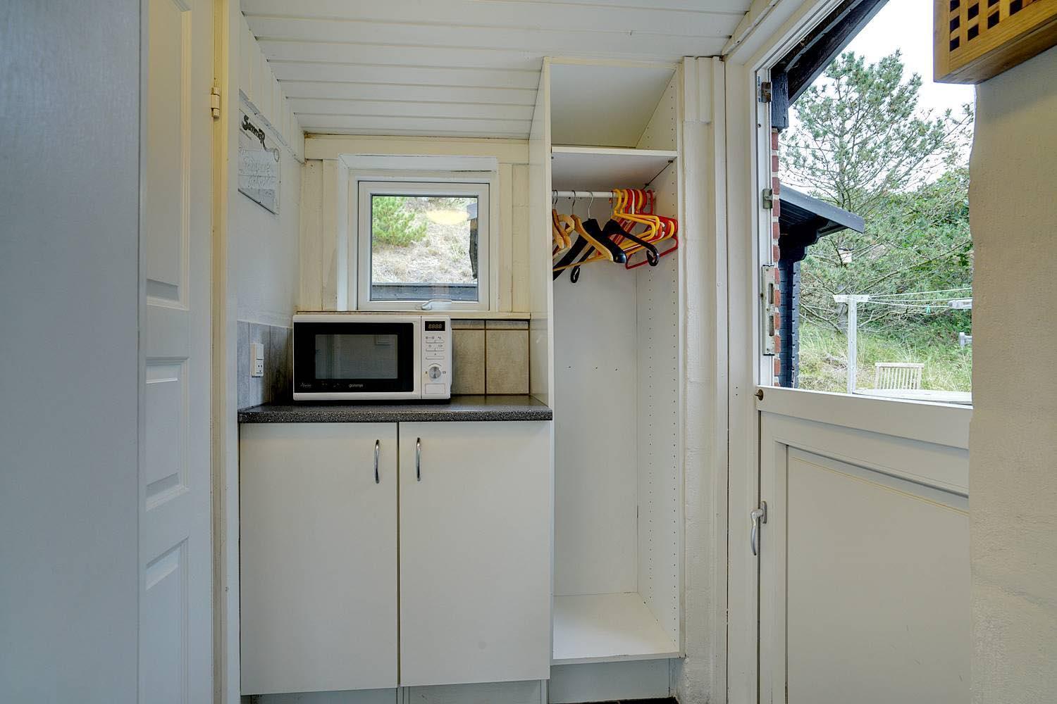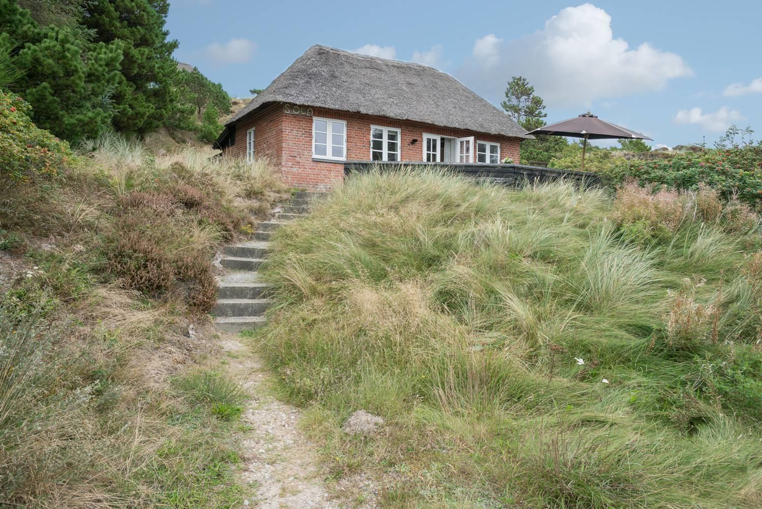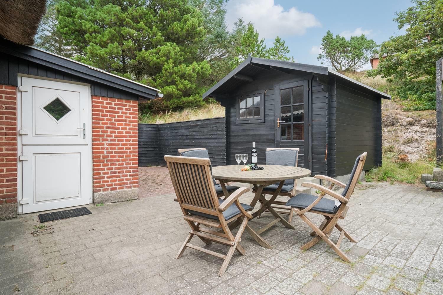 Huset er højt beliggende og fra syd terrassen hat man et dejligt kig over sommerhus området. Bag huset er der ugeneret og læfuld terrasse samt skur til opbevaring. Huset ligge på naturskøn grund og med trapper op til huset.