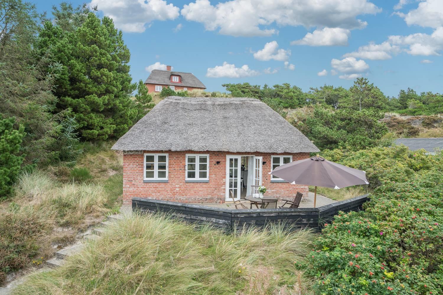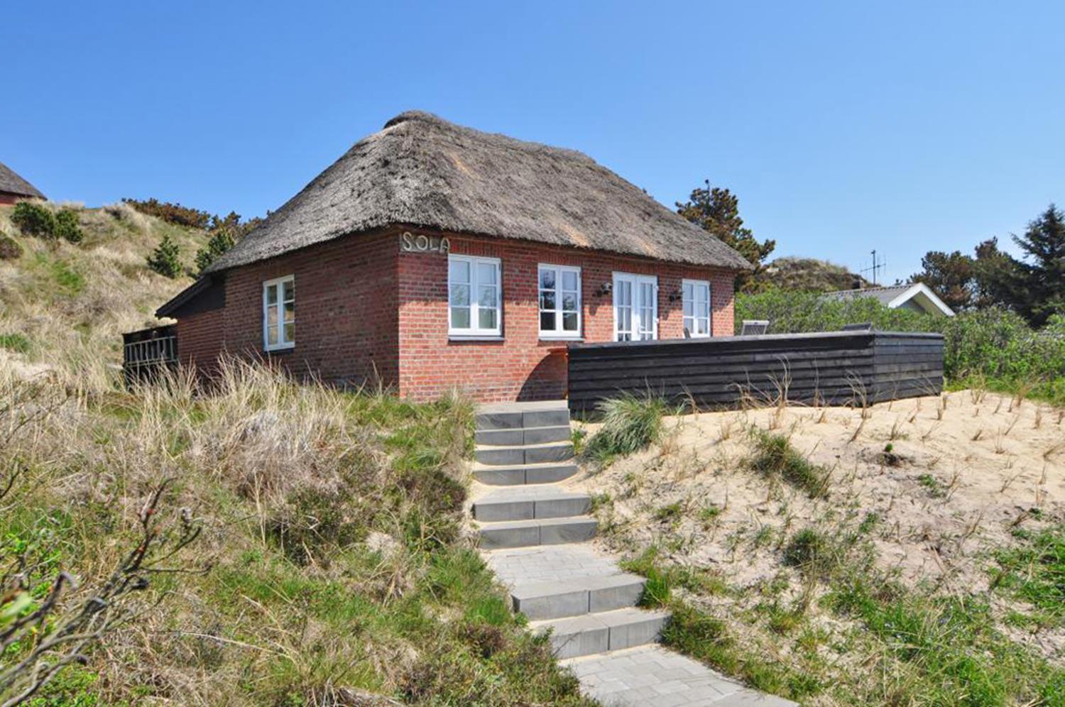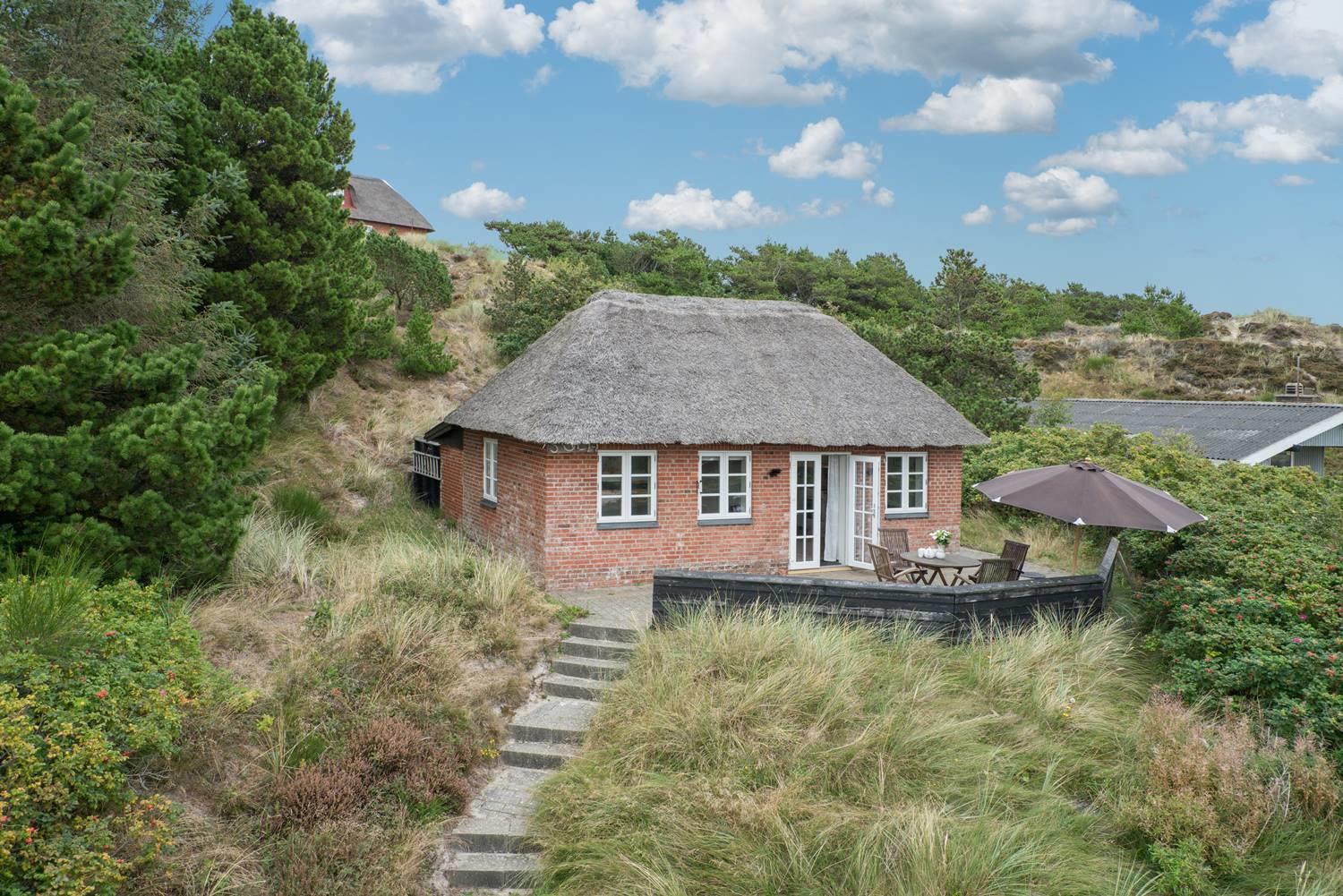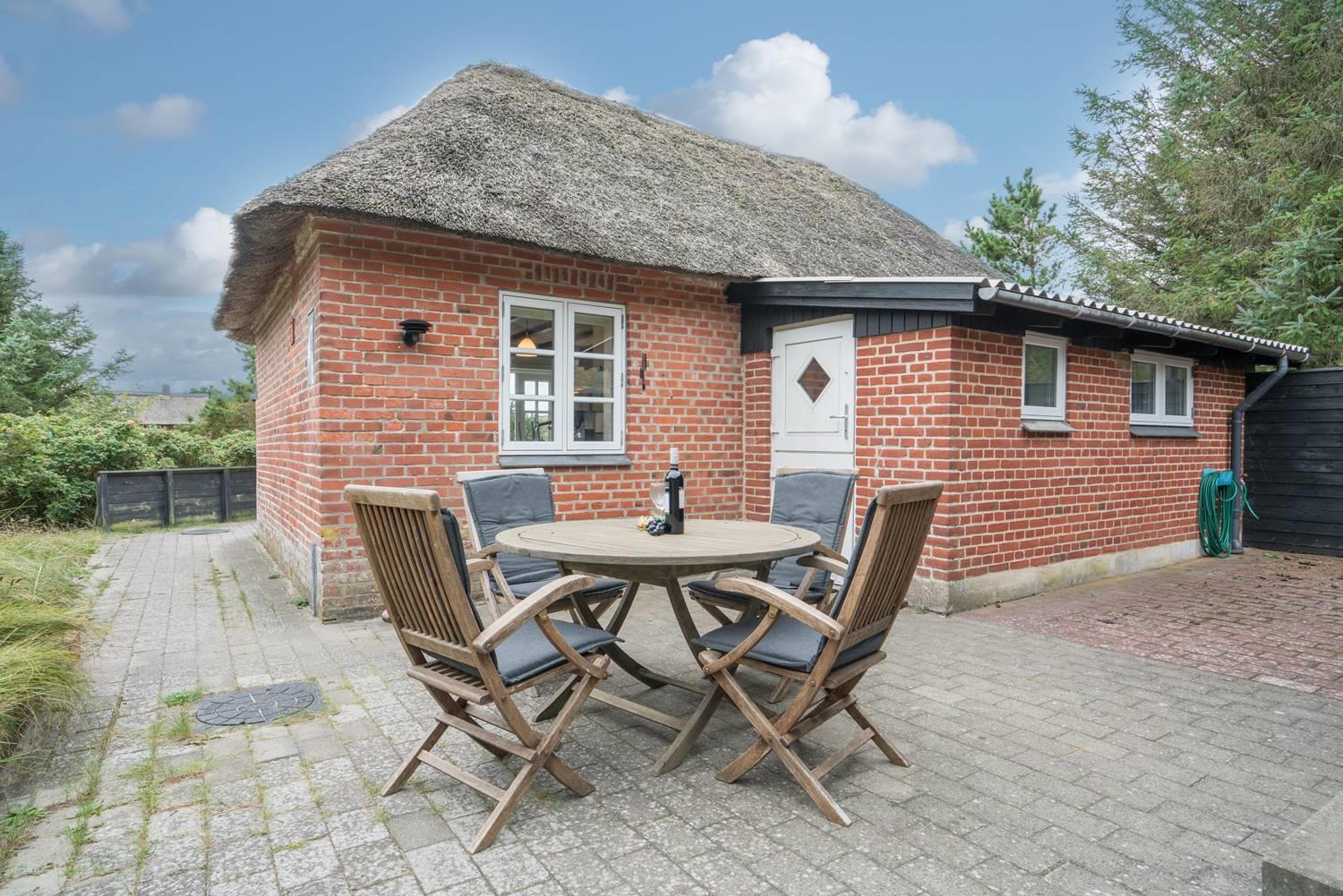 Et lille muret feriehus med stråtag og meget charme. Huset er gennem renoveret og fremstår med sine lyse vægge og lofter lyst og venligt. Huset stue og køkken er i samme rum og med udgang til terrassen. Der er et soverum med en dobbeltseng og et med køjesenge.