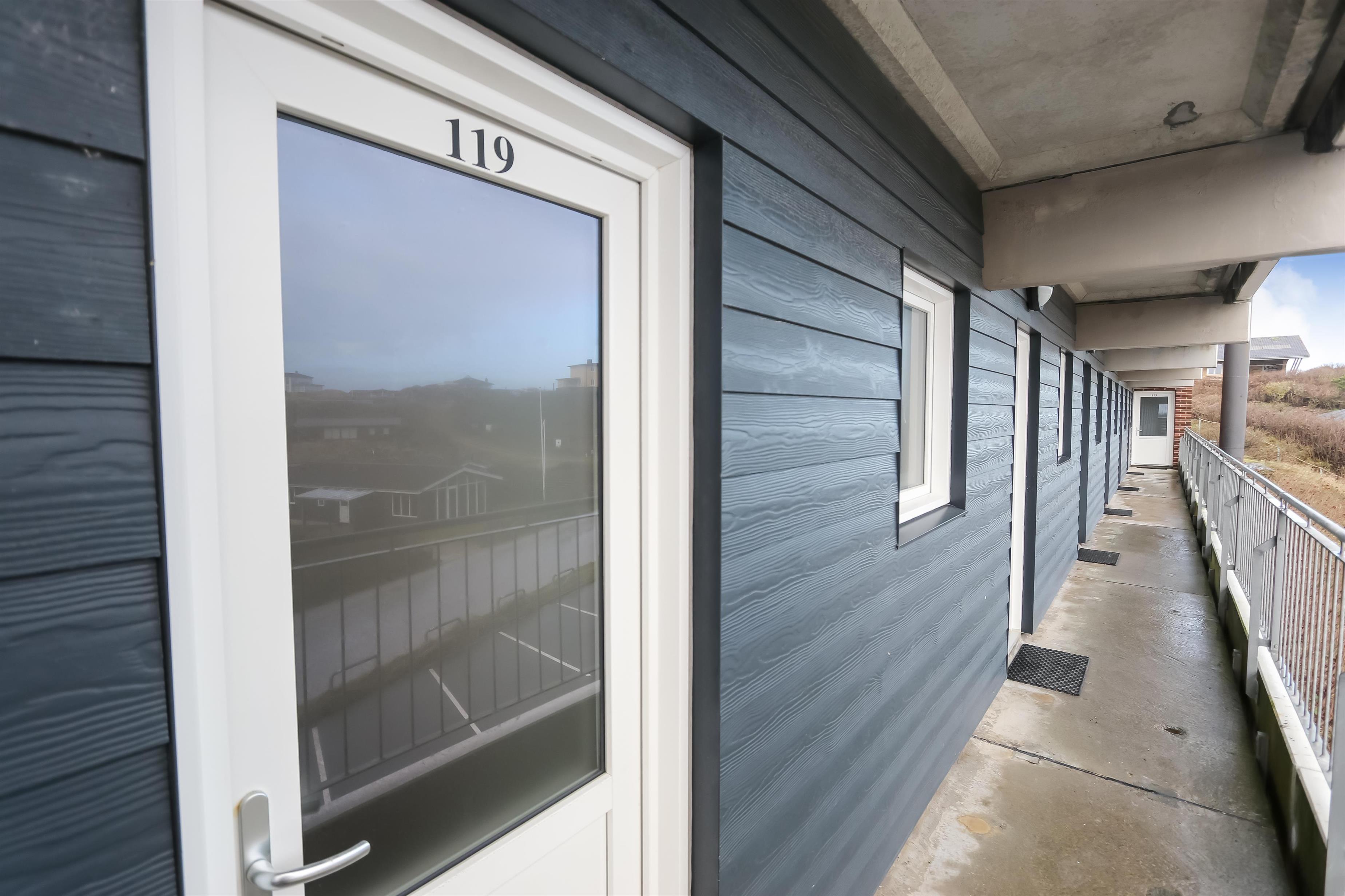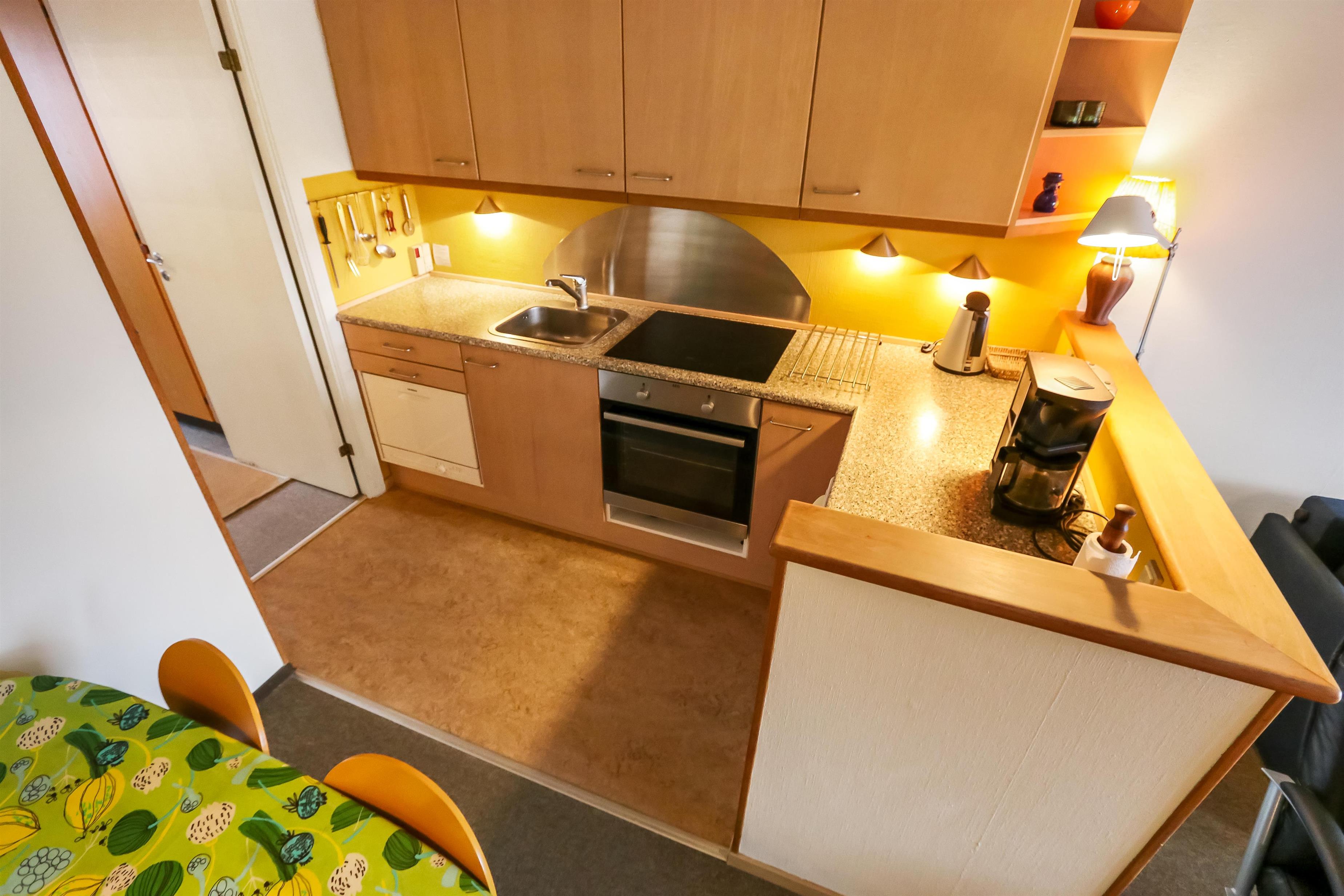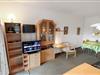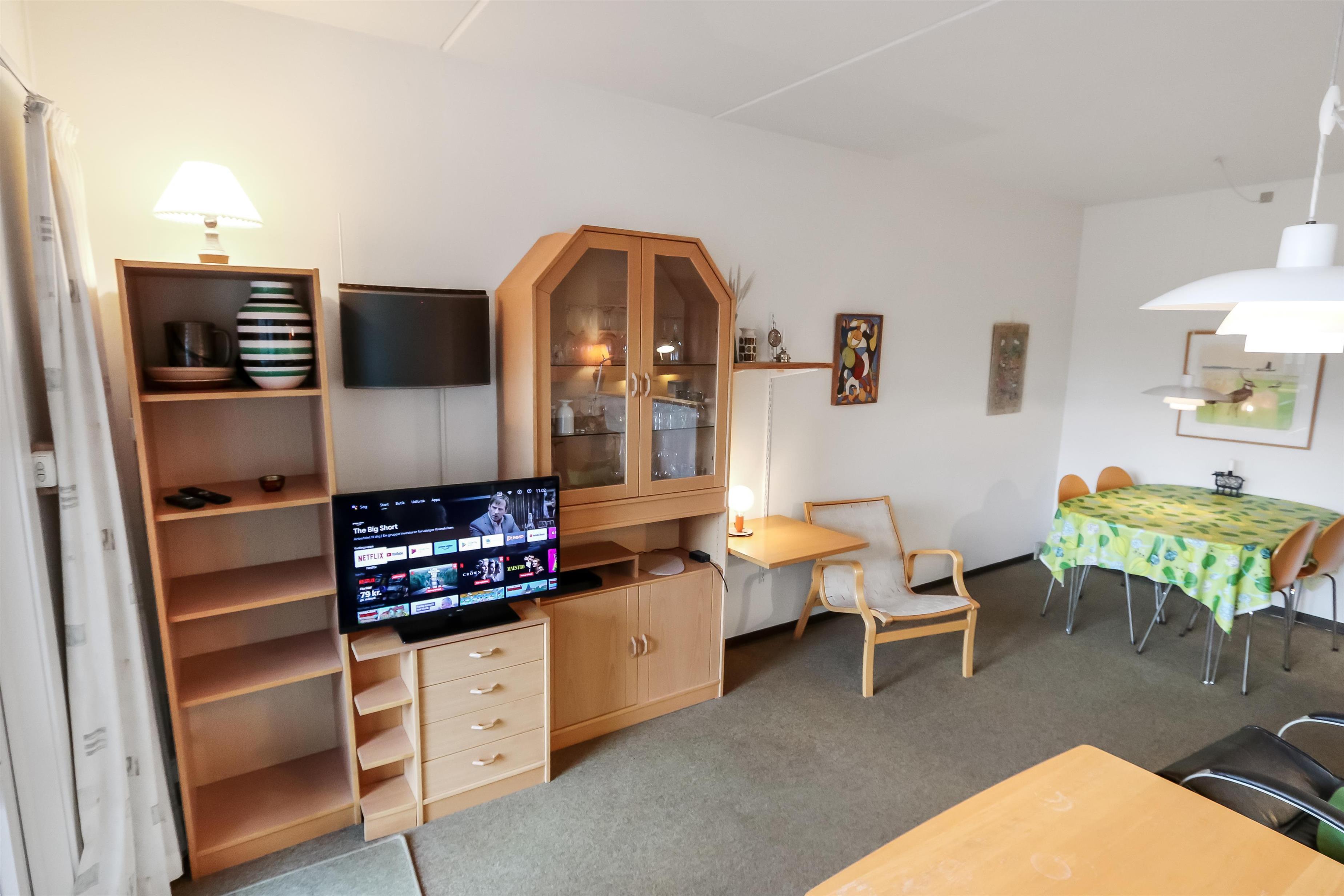 Ferielejlighed til 4 personer beliggende i stueplan. Kombineret stue og køkken. Stuen er indrettet med polster og lædermøbler, kabel-TV, DVD, CD og 1 sovesofa med plads til 1 person samt gulvtæppe. Køkkenet er indrettet med el-keramisk kogeplade og indbygningsovn, køleskab med 10l frostboks, emhætte og opvaskemaskine samt linoleumsgulv. 1 soverum: 1DS + 1ES og gulvtæppe. Badeværelse med toilet, håndvask og bruser. Fra stuen er der udgang til delvis overdækket terrasse med havemøbler. Trappen til 1. sal består af 24 trappetrin.