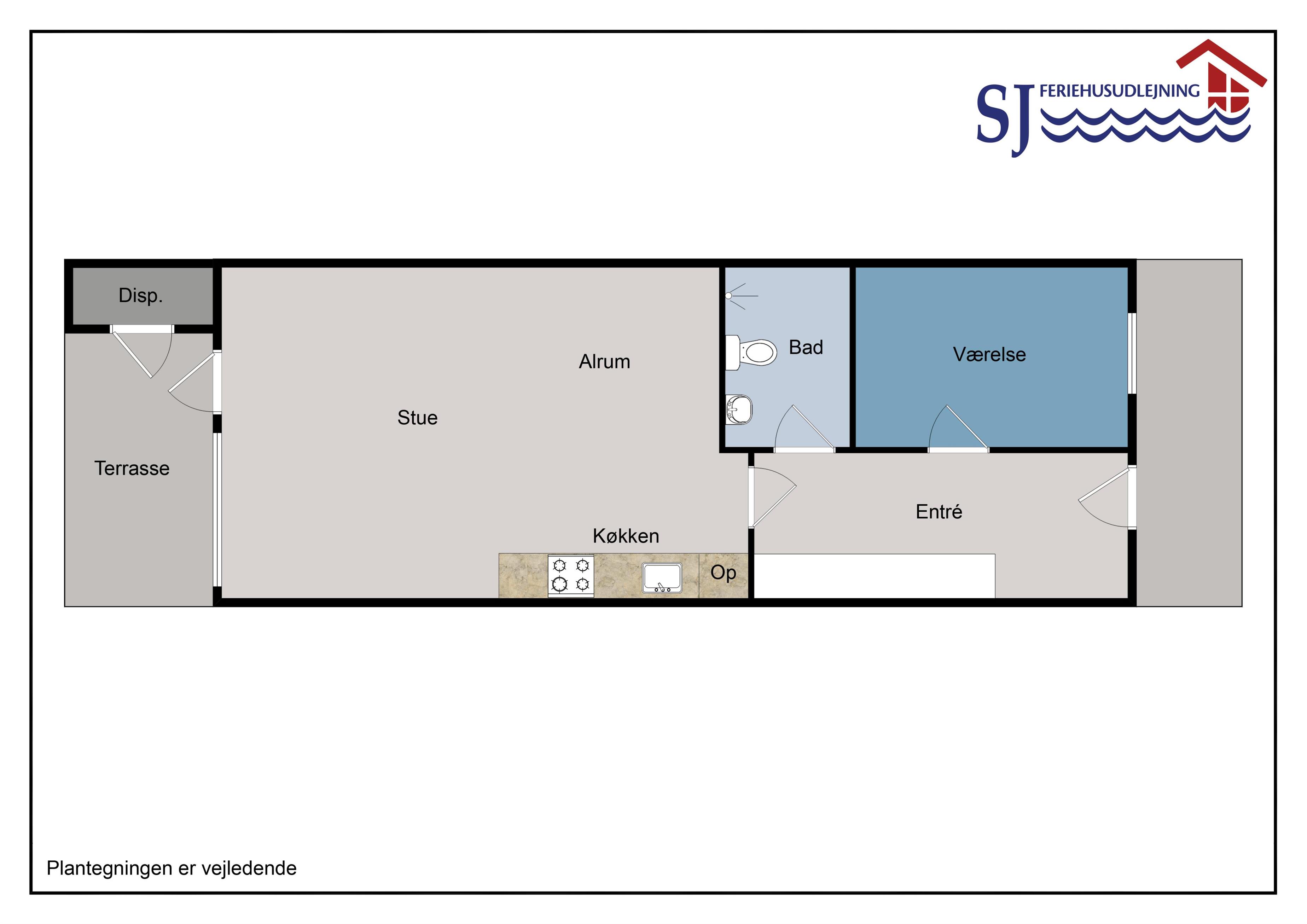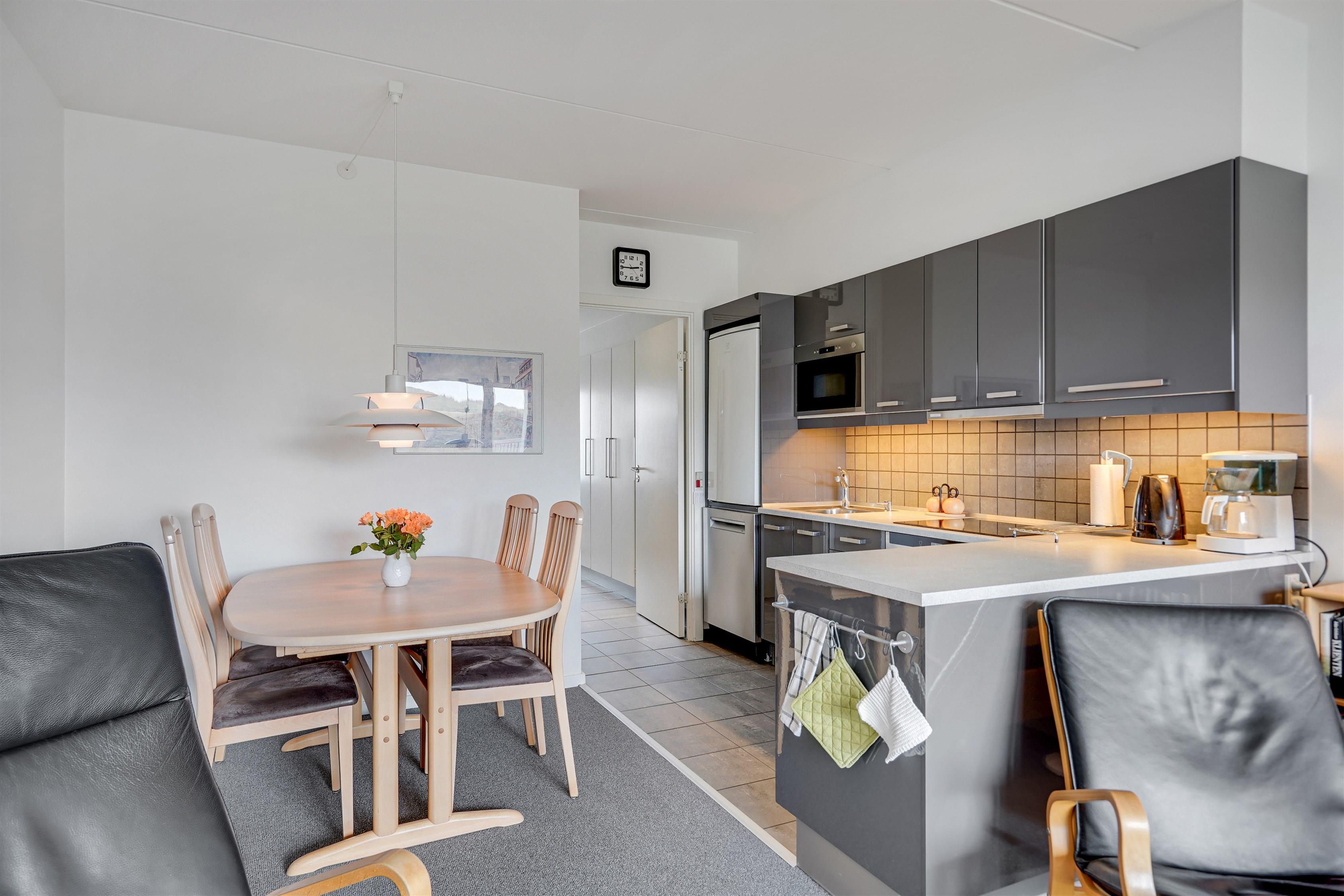 Pæn indrettet ferielejlighed til 2 personer, beliggende i stueplan med kombineret opholdsstue og køkken. Stuen er indrettet med polster- og lædermøbler og gulvtæppe. Kabel-tv, DVD, radio. Køkkenet er indrettet med glaskeramisk kogeplade, indbygningsovn, emhætte, opvaskemaskine, mikroovn og køleskab med 10 l fryseboks, klinkegulv. Badeværelse med toilet, håndvask og bruser. 1 soverum med 2S. Fra stuen er der udgang til delvis overdækket terrasse med havemøbler. Trappen til 1. sal består af 24 trappetrin.