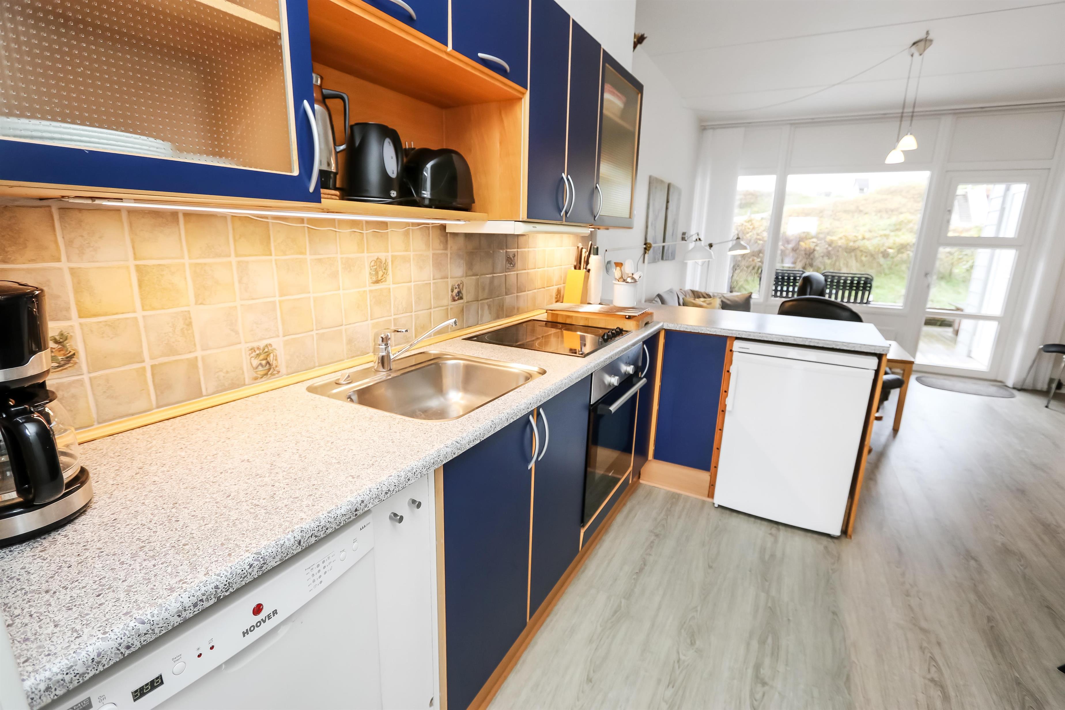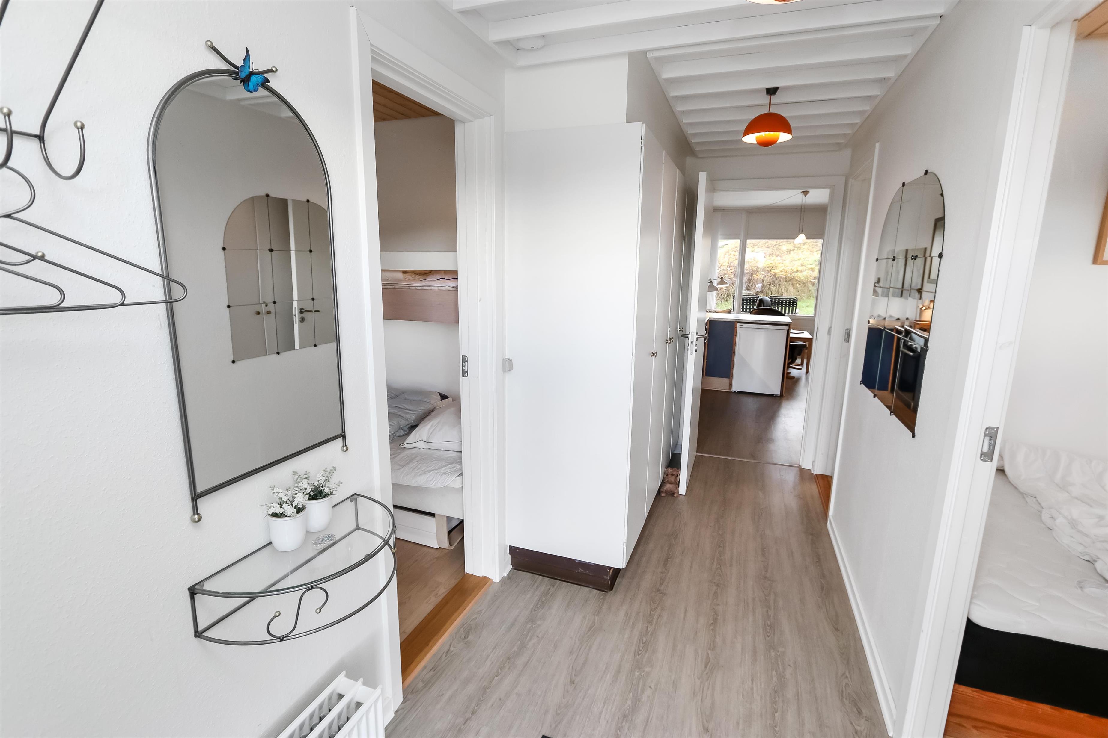 Rigtig pæn og fin lejlighed til 6 personer beliggende i stueplan. 2 Soverum: 1DS og pergogulv og 1 3/4 seng med 1 overkøje. Badeværelse med toilet, håndvask og bruser. Køkken med glaskeramisk komfur, køleskab med lille frostbox, opvaskemaskine, emhætte og linoleumsgulv. Stue med læder og polstermøbler, kabel-TV kun via streaming, DVD og linoliumsgulv. Sofa i stuen kan slåes ud til 2 sovepladser. Fra stuen er der udgang til lille delvis overdækket terrasse med havemøbler. Trappen til 1. sal består af 10 trappetrin.