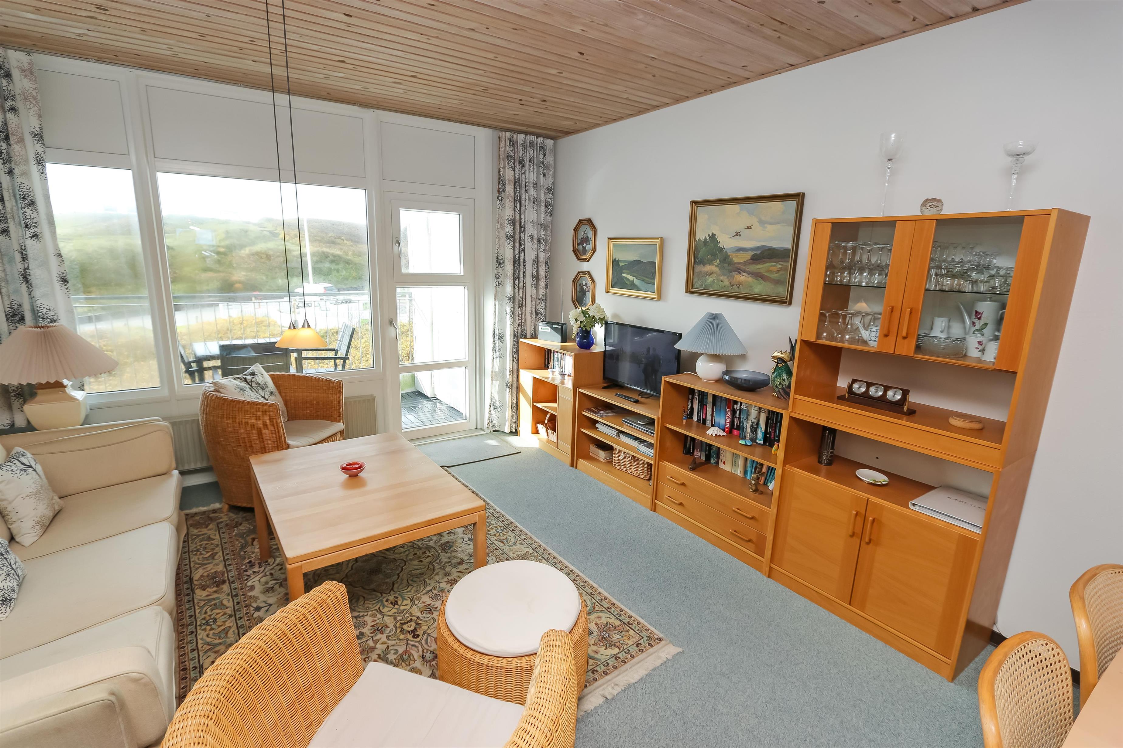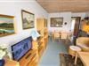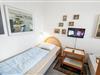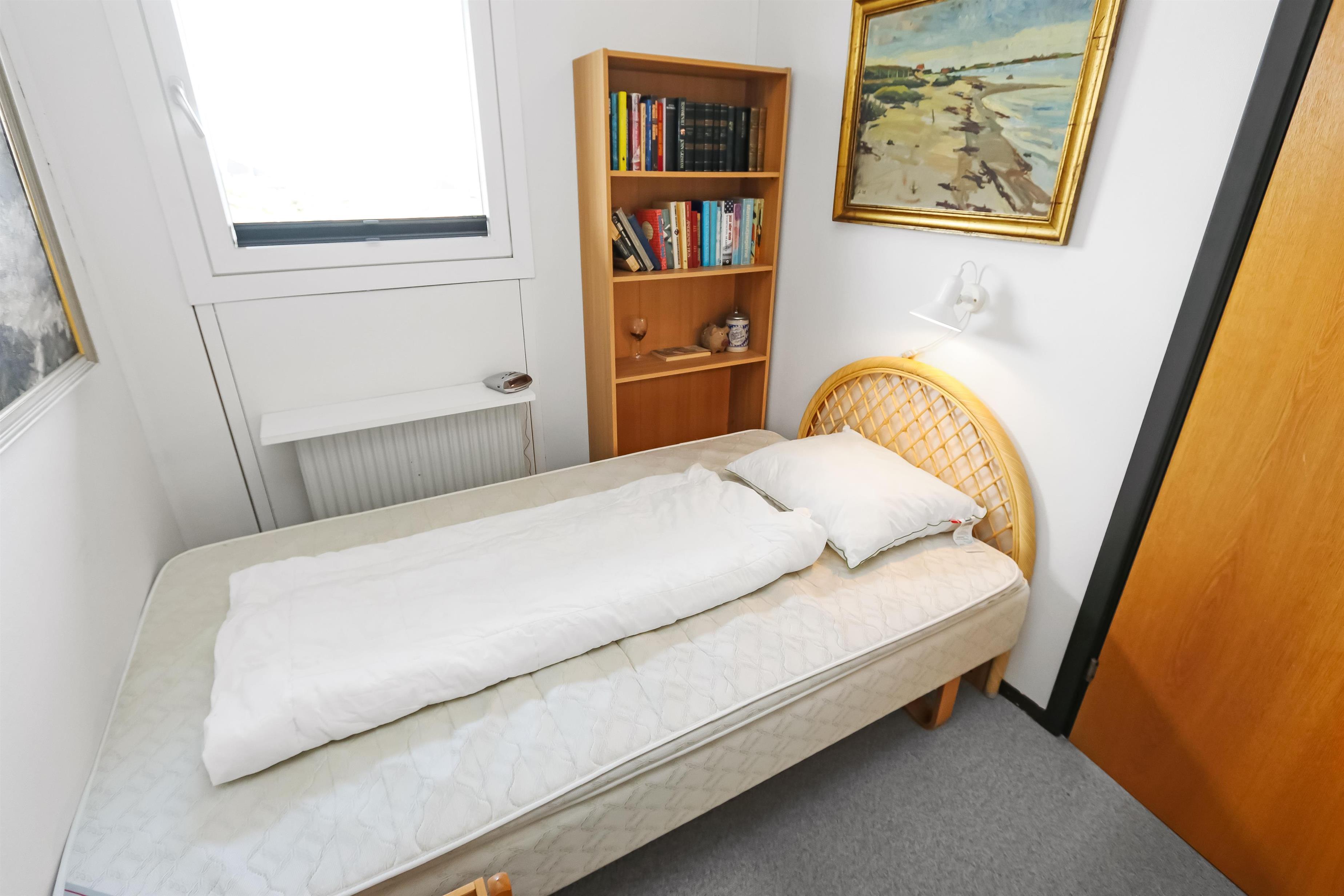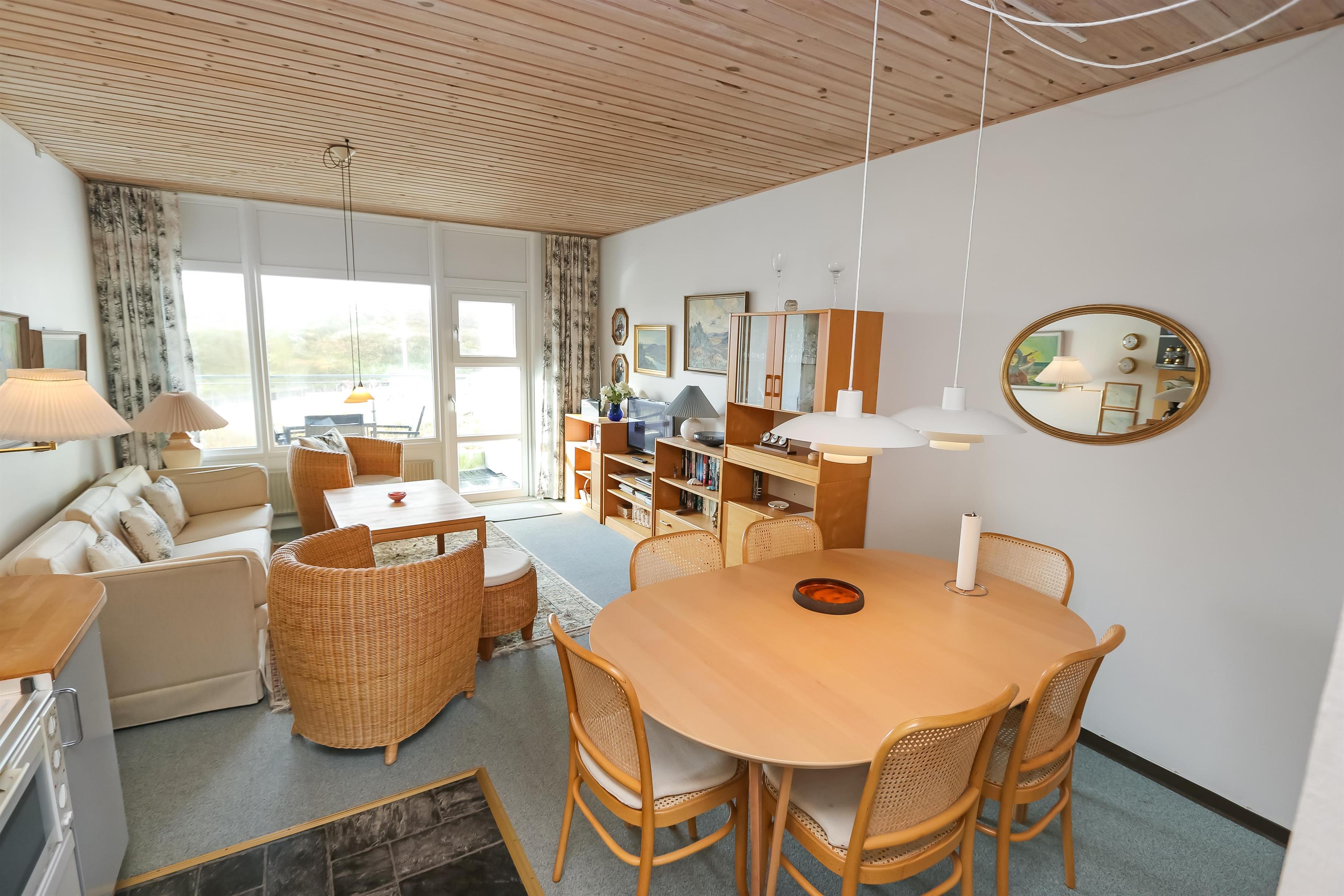 Personlig og pæn indrettet ferielejlighed til 2 personer beliggende på 1. sal. Kombineret stue og køkkenafdeling. Køkkenet er indrettet med el-komfur, køleskab med 10 l frostboks, opvaskemaskine, emhætte og linoleumsgulv. Stuen er indrettet med kabel-TV, DVD, radio, polstermøbler og gulvtæppe. Badeværelse med toilet, håndvask og bruser. 1 soverum: 1DS + 1S og gulvtæppe. Fra stuen er der udgang til overdækket balkon med havemøbler. Trappen til 1. sal består af 40 trappetrin.