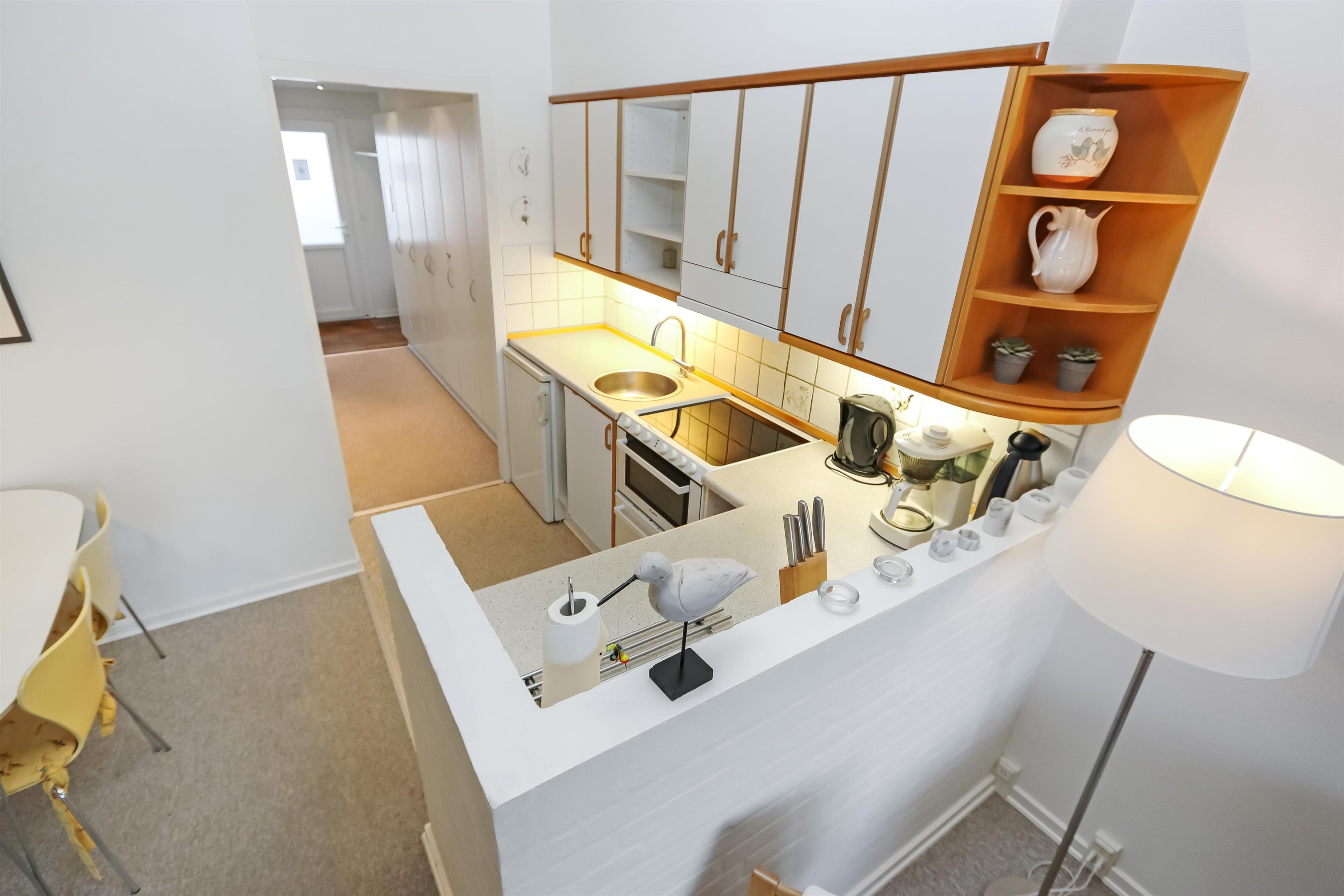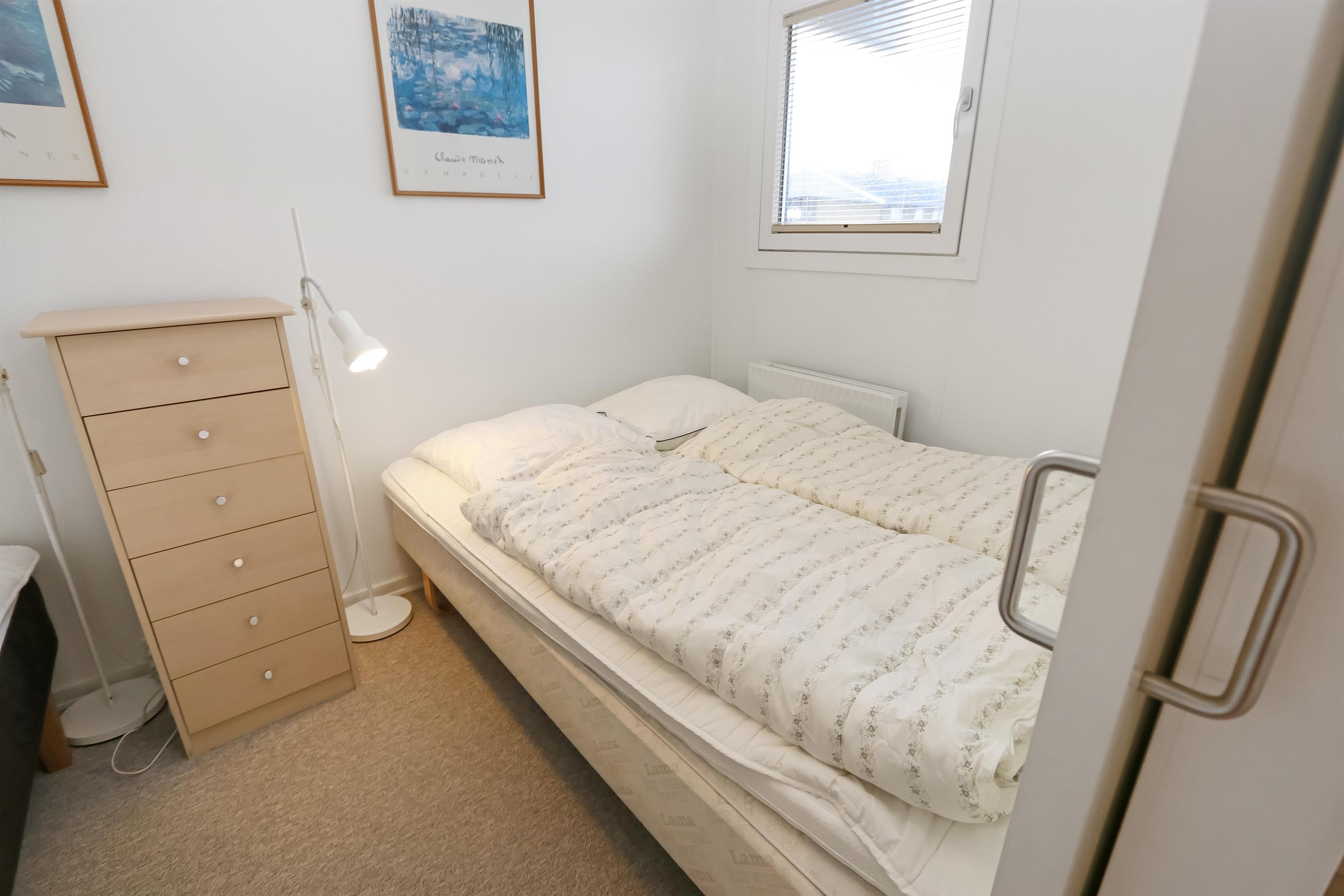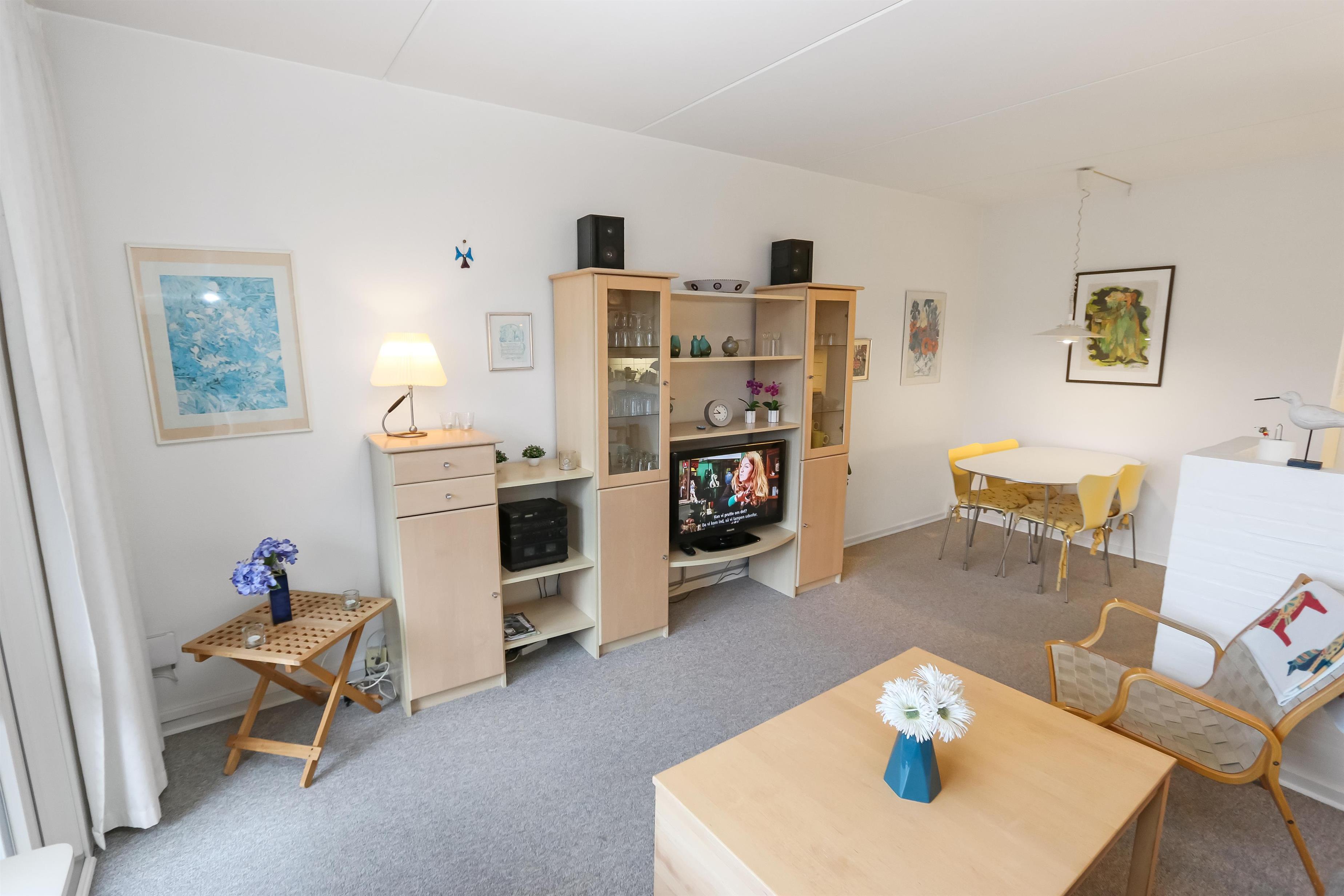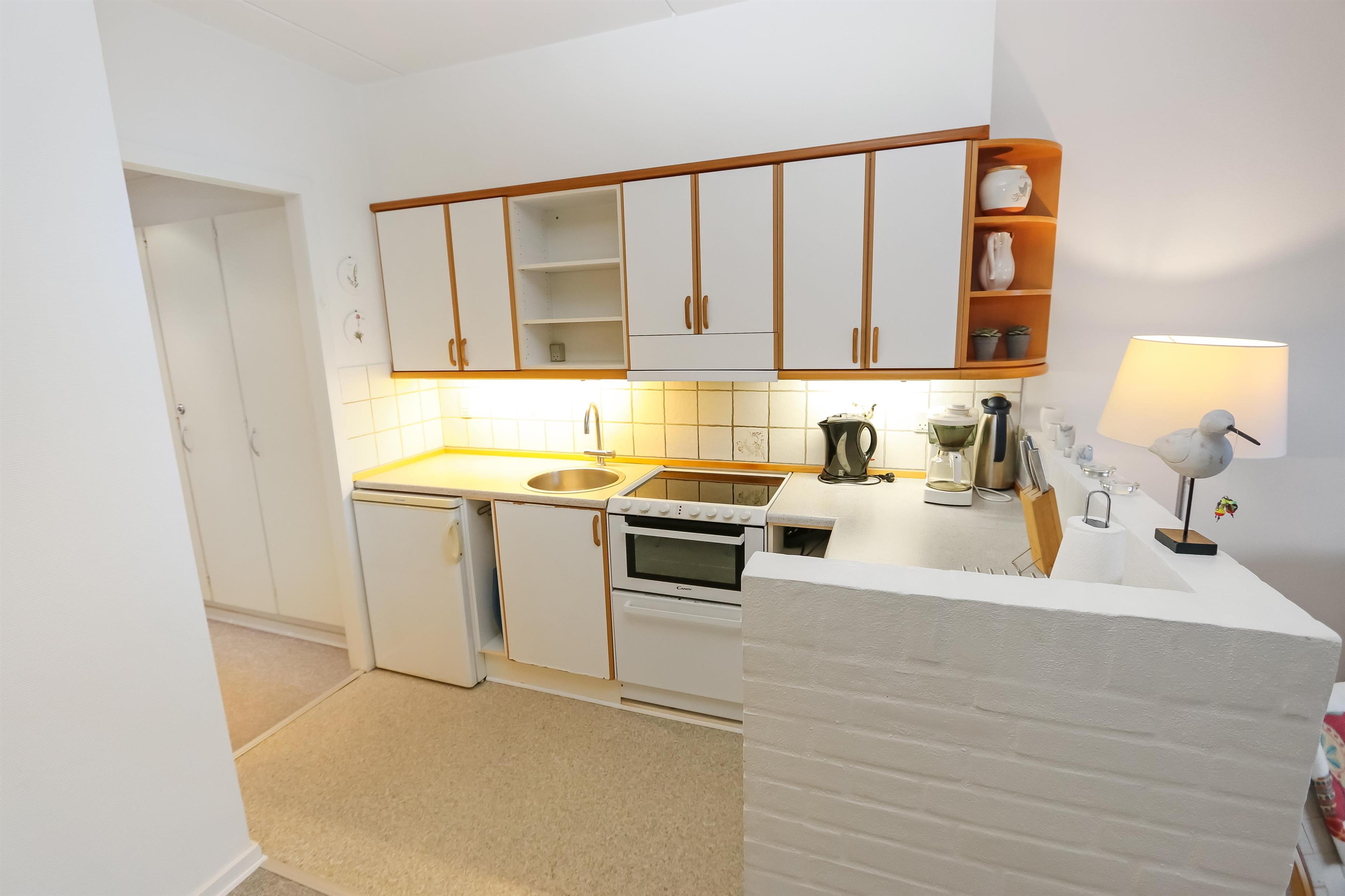 Pæn indrettet ferielejlighed til 2 personer, beliggende på 1. sal. Kombineret køkken og stue med gulvtæppe i stuen og linoleum i køkkenafdelingen. Køkkenet er indrettet med glaskeramisk kogeplade, køleskab med 10 l fryseboks, emhætte, kombi opvaskemaskine og ovn. Badeværelse med toilet, håndvask og bruser. 1 Soverum med 1 DS + 1S. Stuen er indrettet med polstermøbler og 1 sovesofa, kabel-TV, CD og Radio. Fra stuen er der udgang til lille overdækket balkon med havemøbler. Trappen til 1. sal består af 21 trappetrin.