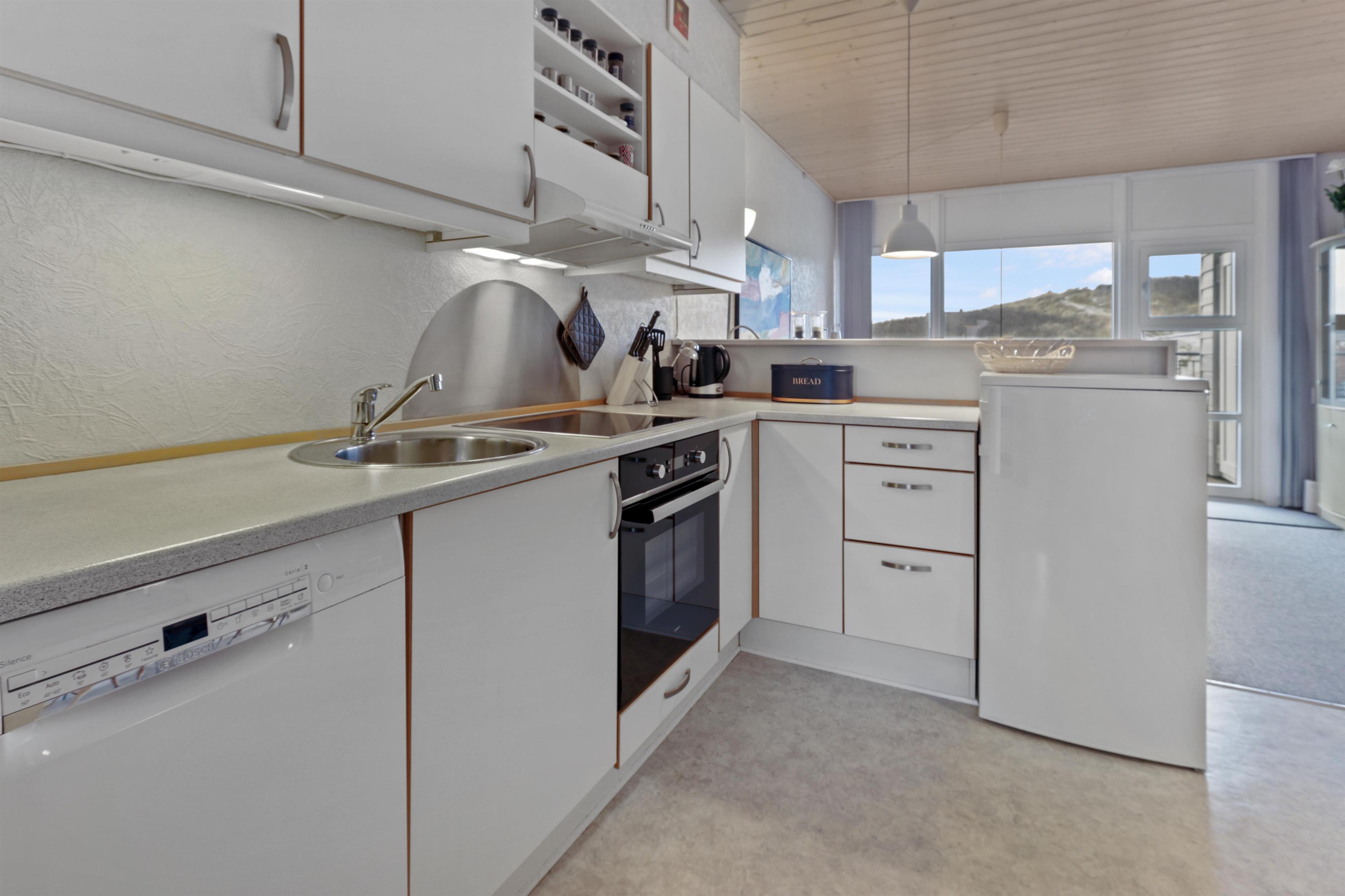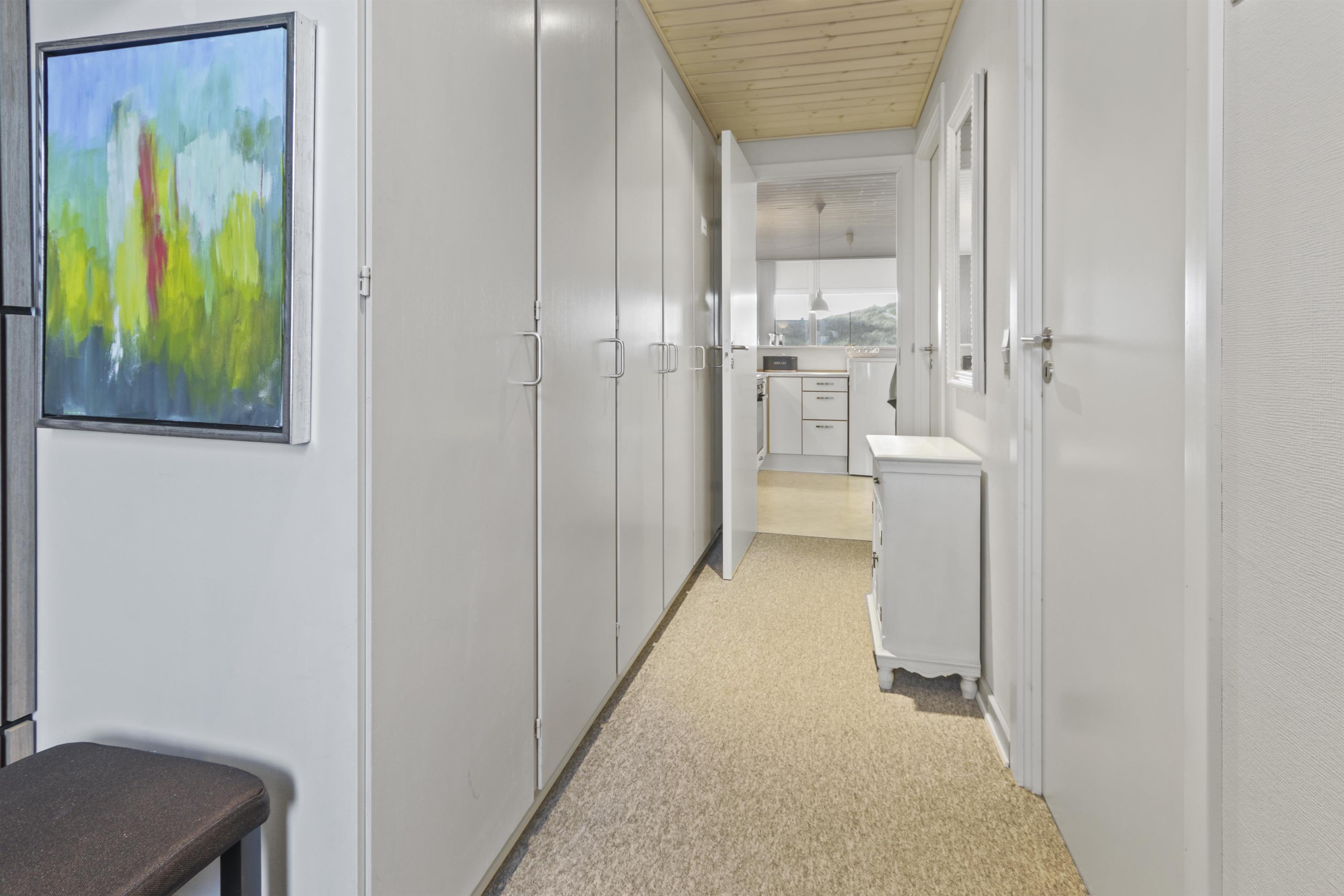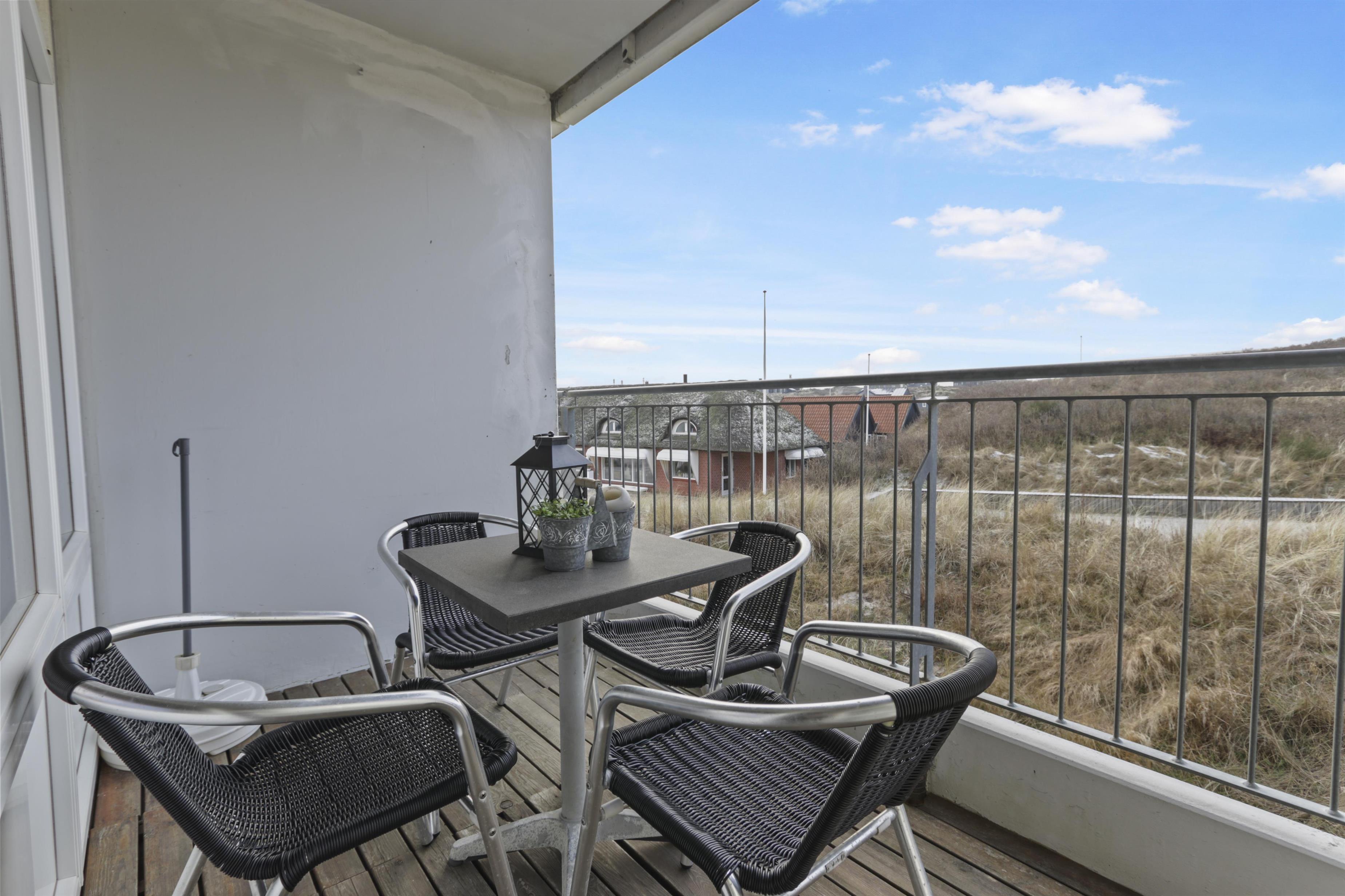 Fra stuen er der udgang til overdækket balkon med havemøbler og fin udsigt over klitterrænet. Trappen til 1. sal består af 16 trappetrin.