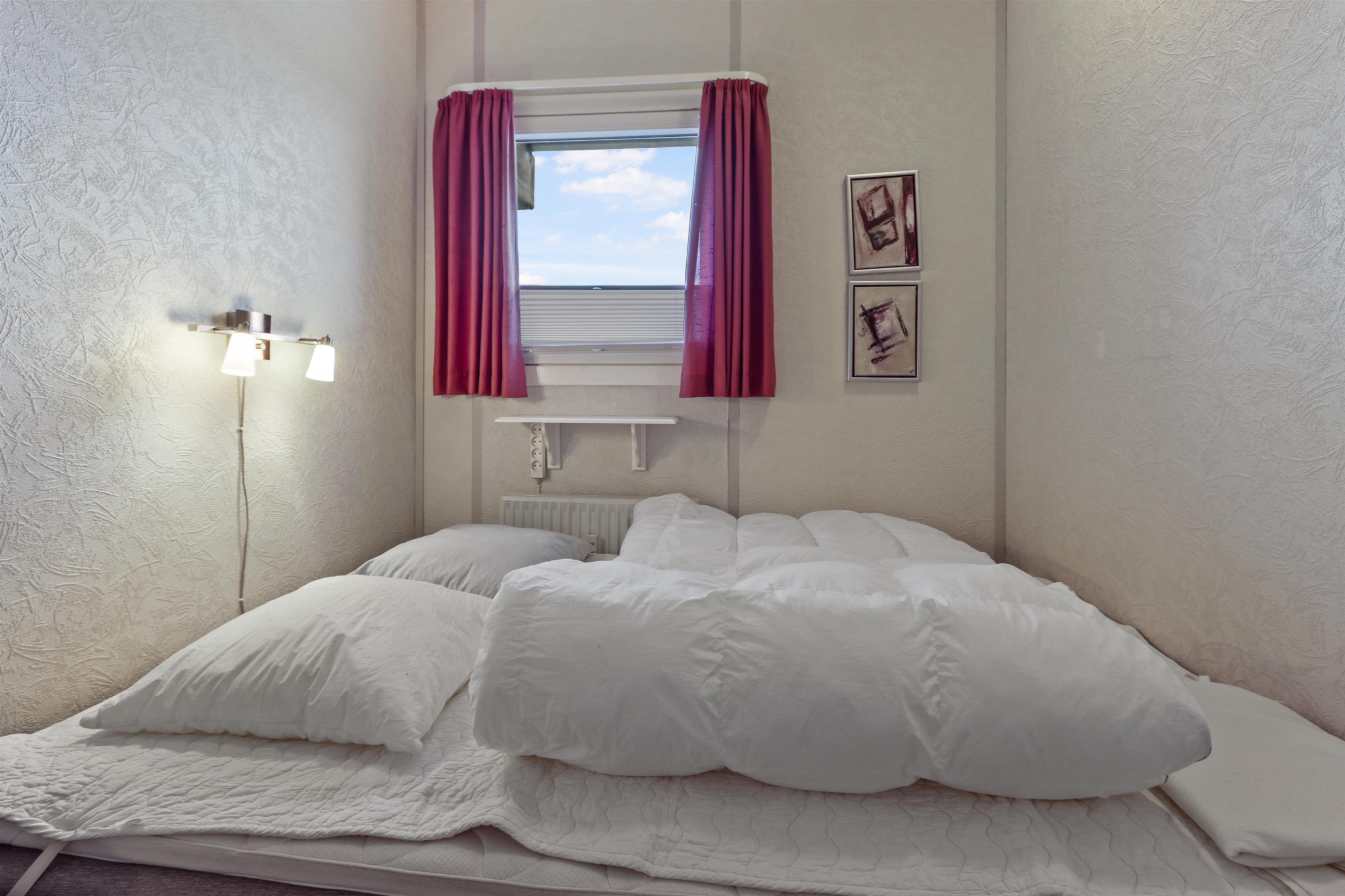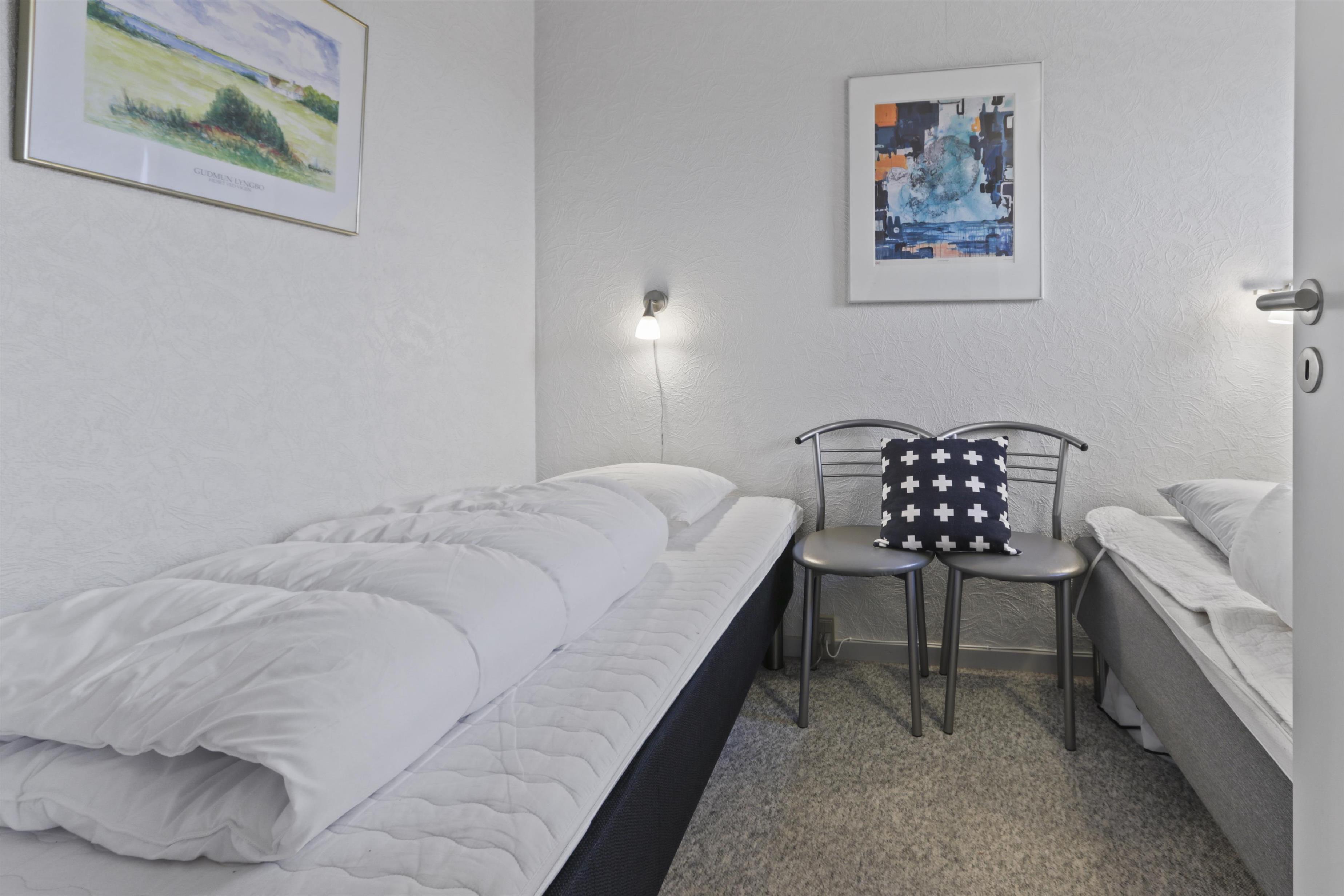 Nyrenoveret ferielejlighed til 4 personer beliggende på 1. sal. Indeholder soveværelse med en dobbeltseng og 1 enkeltseng, og kombineret køkken og stue. Stuen er indrettet med polster- og lædermøbler og sovesofa, radio og TV og nye spisestuestole. Køkkenet har keramisk el-kogeplade, stort køleskab med frostboks, emhætte samt ny indbygget ovn. Badeværelse med toilet, håndvask, brusekabine og gulvvarme.
