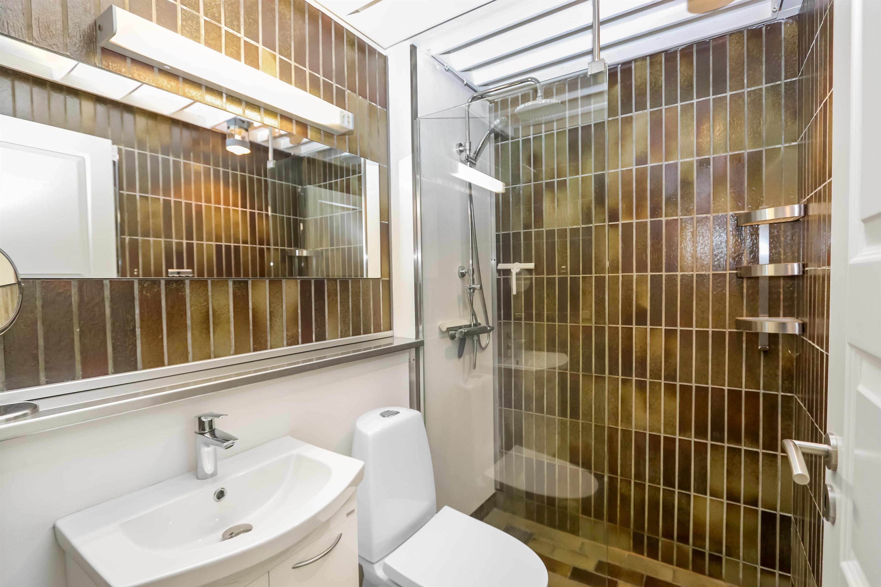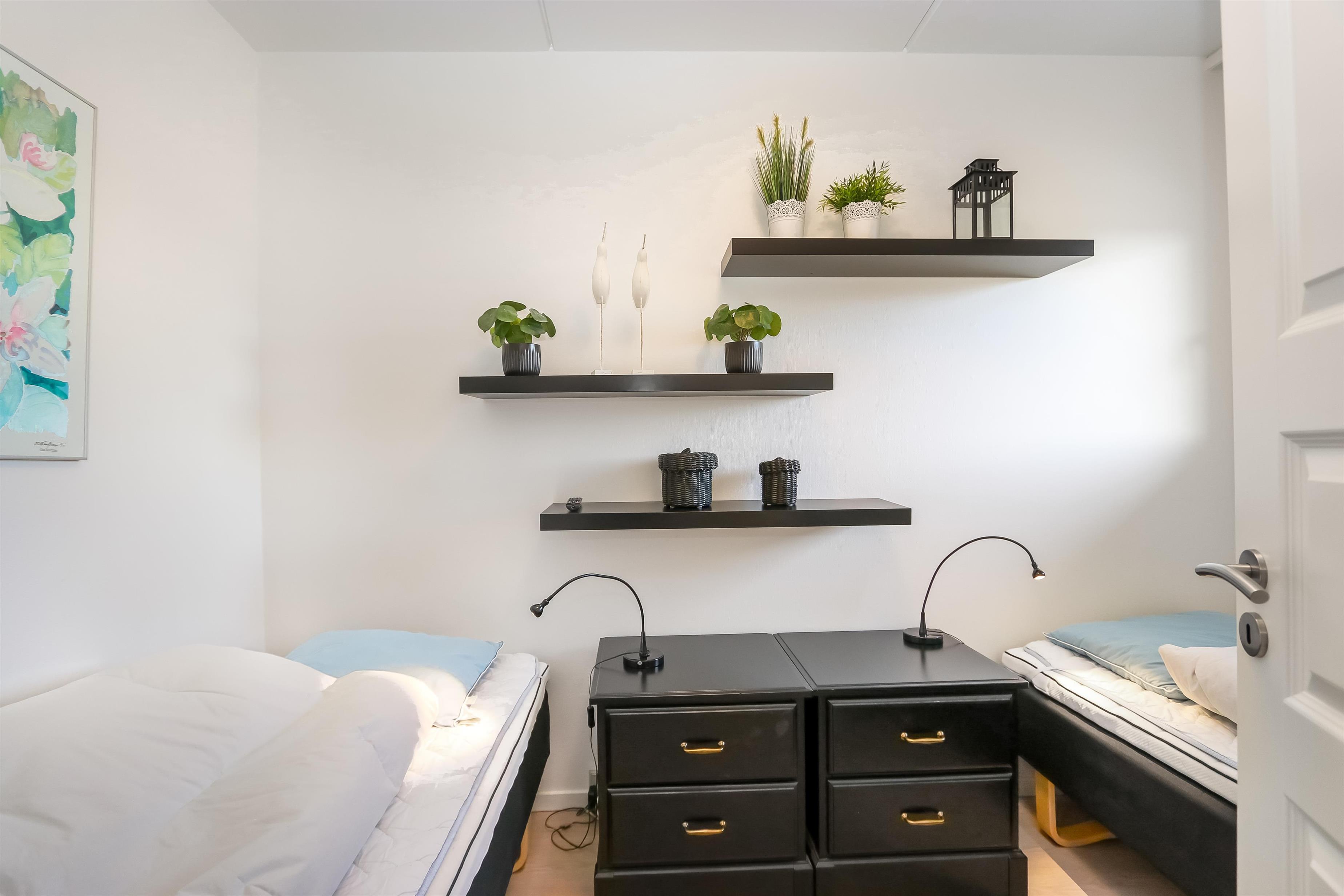 Meget pæn og moderne indrettet ferielejlighed til 2 personer, beliggende på 1. sal. Kombineret køkken og stue. Stuen er indrettet med lædermøbler, kabel-TV, og pergogulv. Køkkenet er indrettet med glaskeramisk kogeplade, indbygningsovn, køleskab med 10 l frostboks, opvaskemaskine, emhætte og pergogulv. Badeværelse med toilet, håndvask og bruser. 1 soverum: 2S og pergogulv. Fra stuen er der udgang til overdækket balkon med havemøbler. Trappen til 1. sal består af 14 trappetrin.