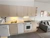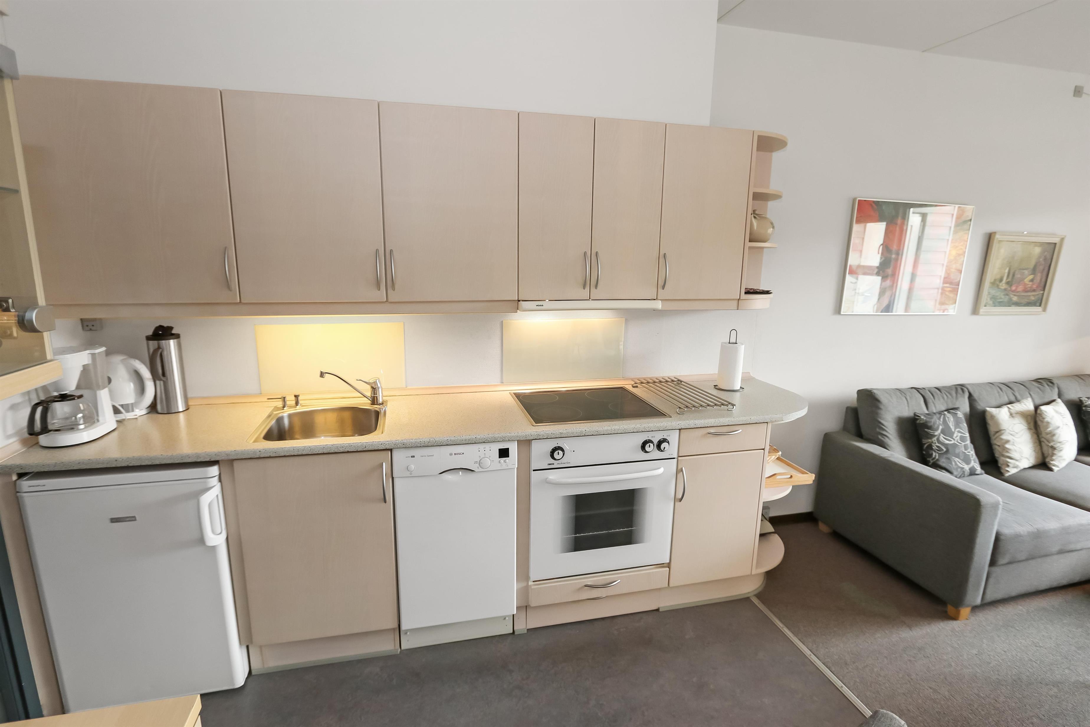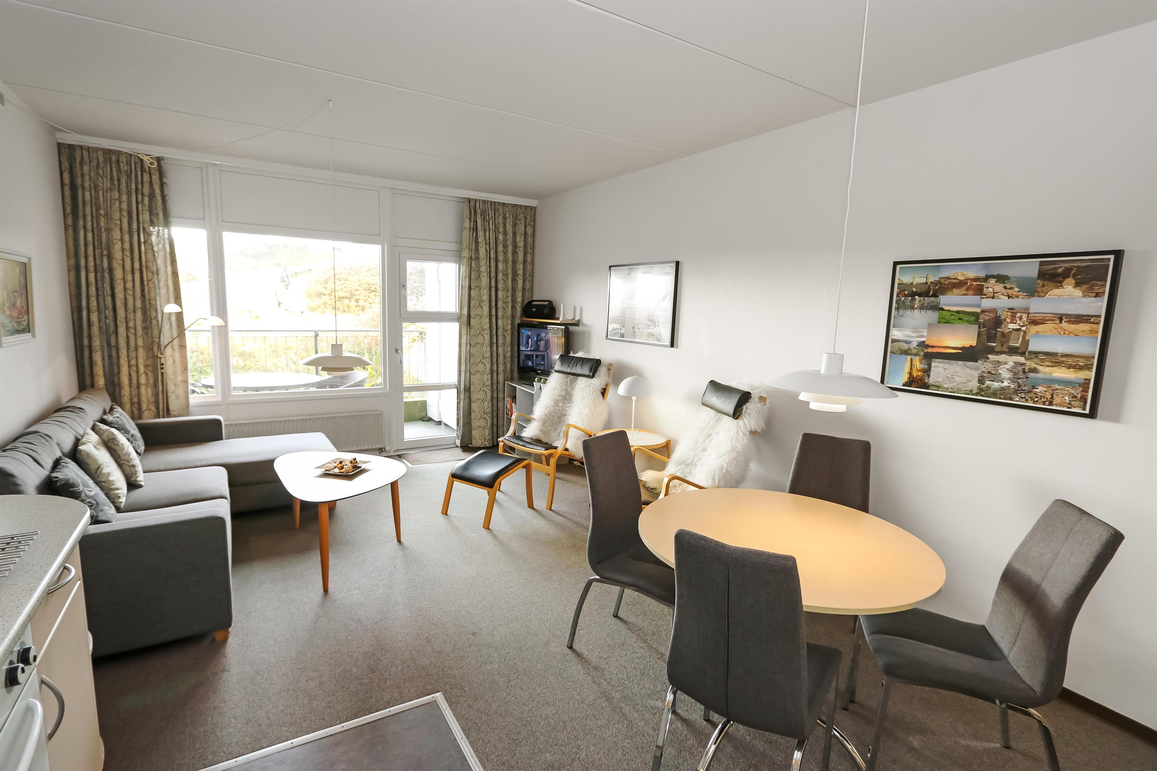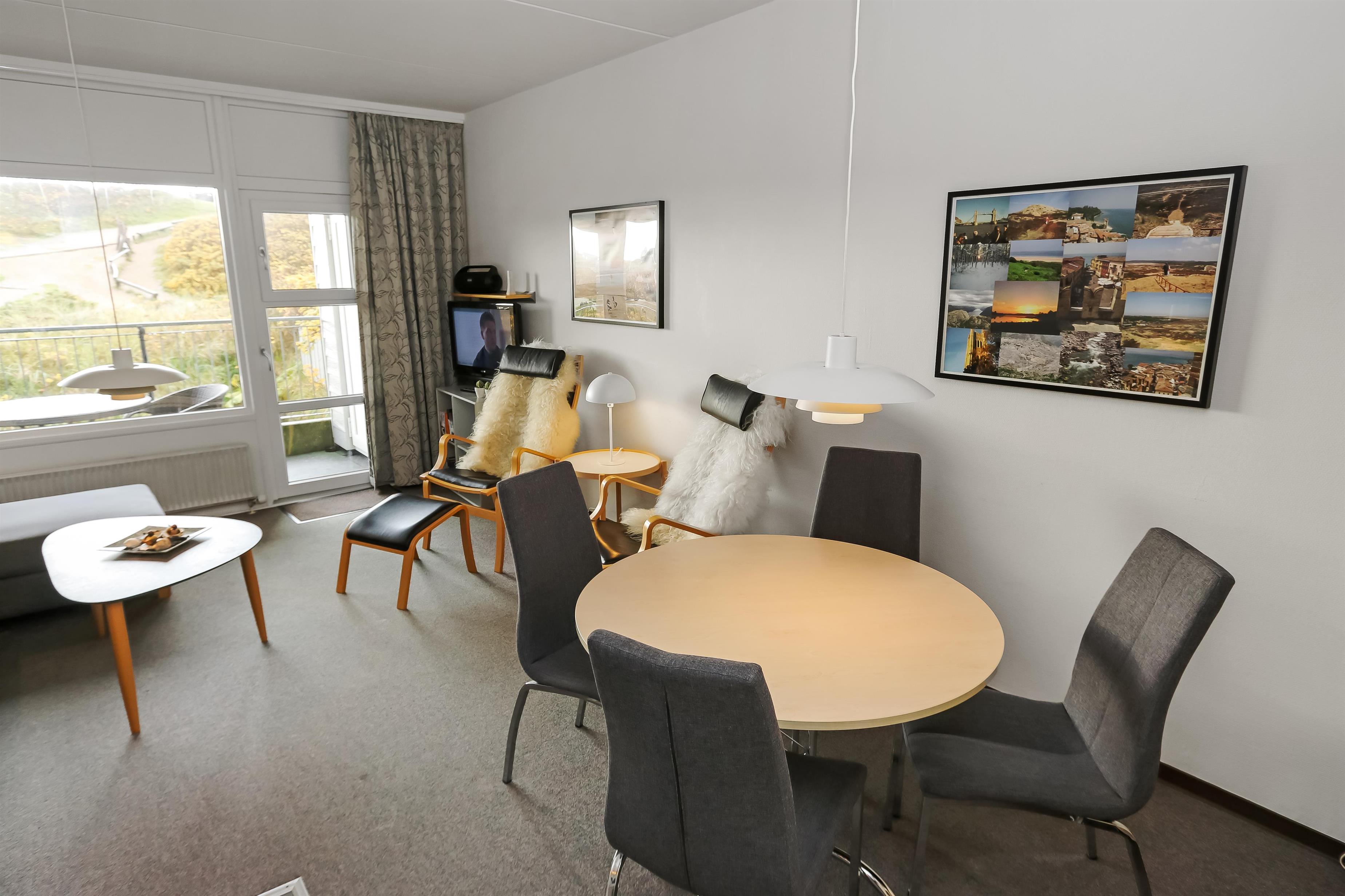 Pæn og hyggelig indrettet ferielejlighed beliggende på 1. sal. Kombineret stue og køkken. Stuen er indrettet med læder og polstermøbler, kabel-TV, radio, sovesofa med plads til 2 personer og gulvtæppe. Køkken med glaskeramisk komfur, køleskab med lille 10 l frostboks, opvaskemaskine, emhætte, linoleumsgulv. Badeværelse med toilet, håndvask og bruser. 1 soverum: 2ES og gulvtæppe. Fra stuen er der udgang til overdækket balkon med havemøbler.Trappen til 1. sal består af 14 trappetrin.
