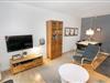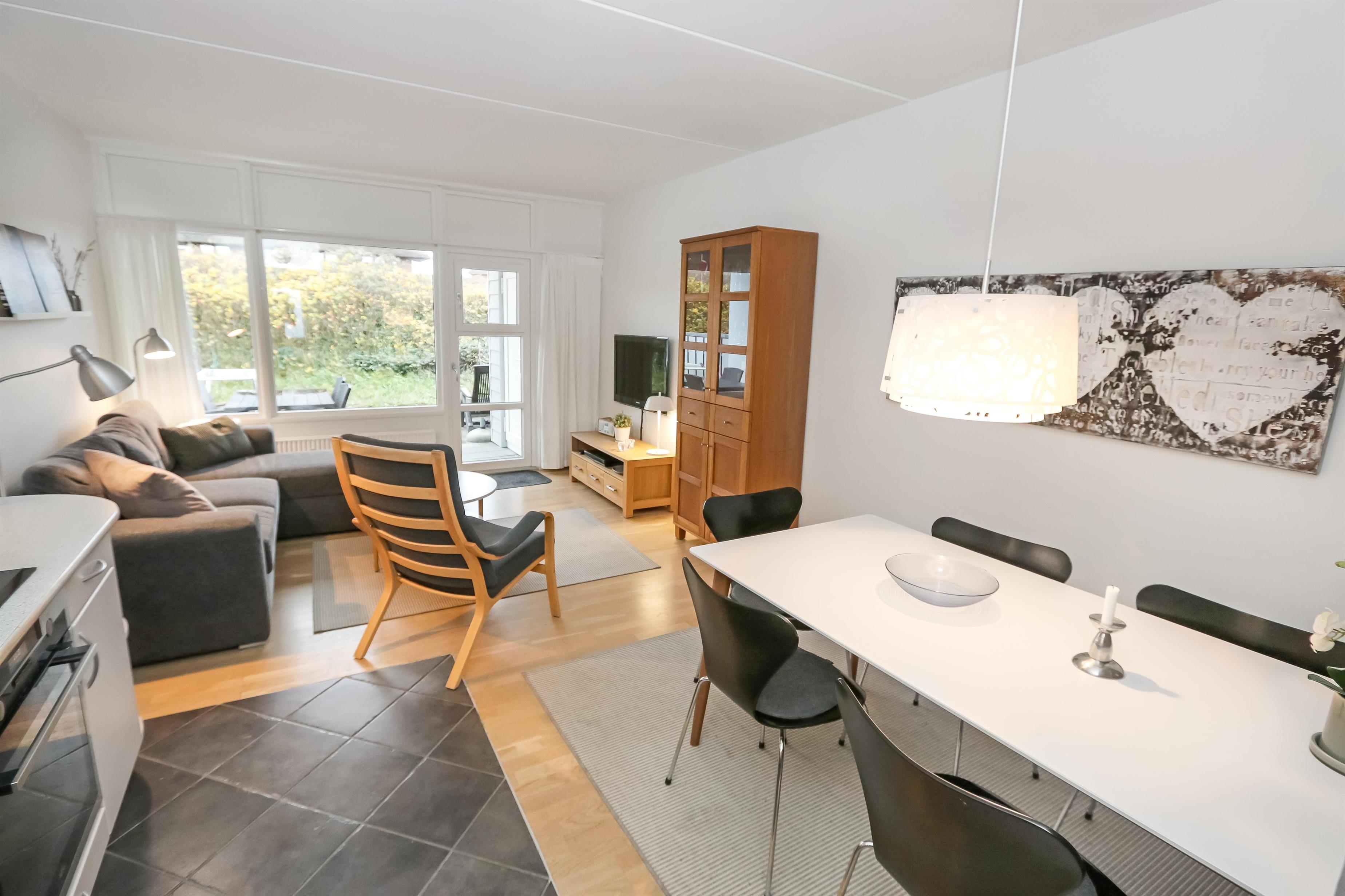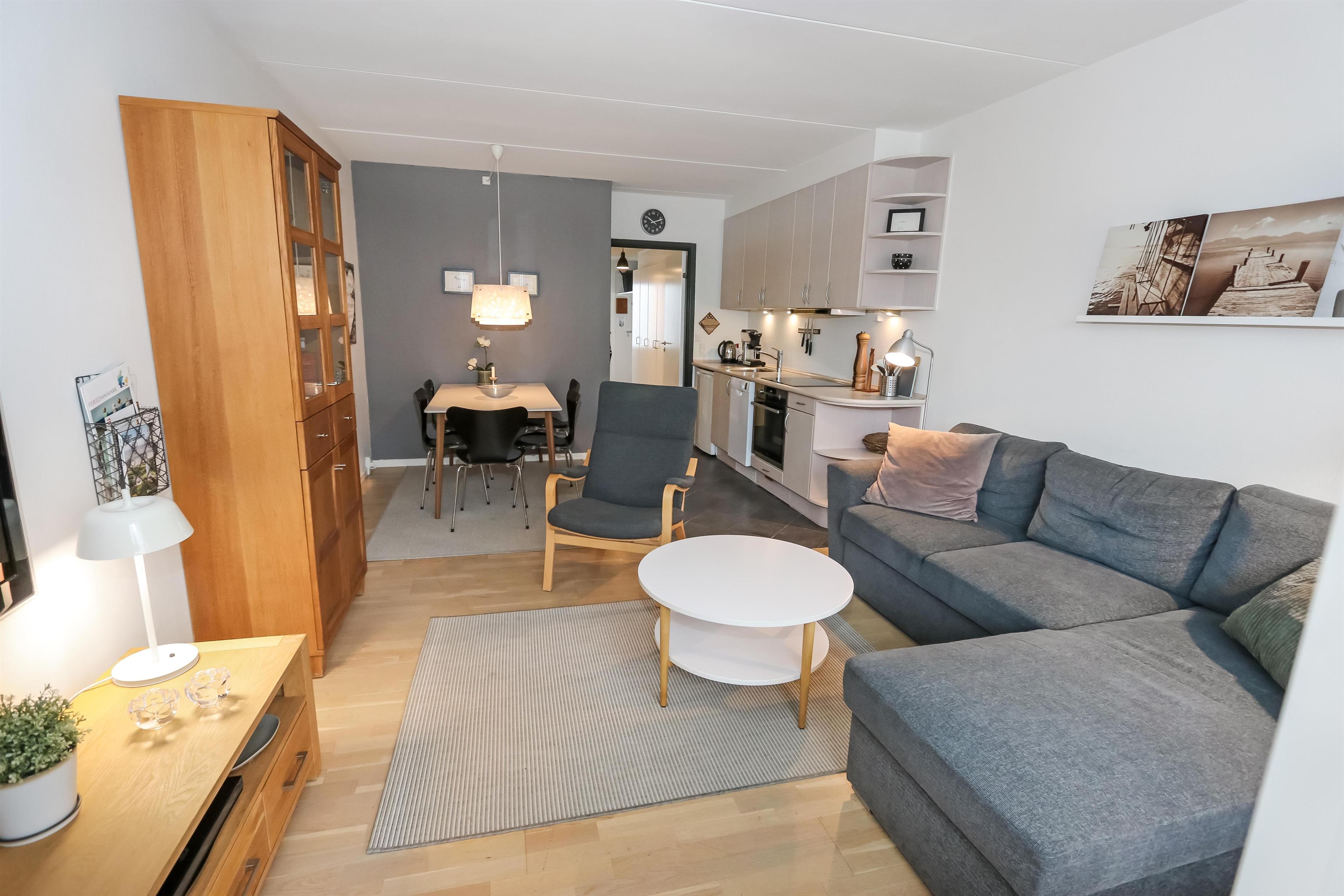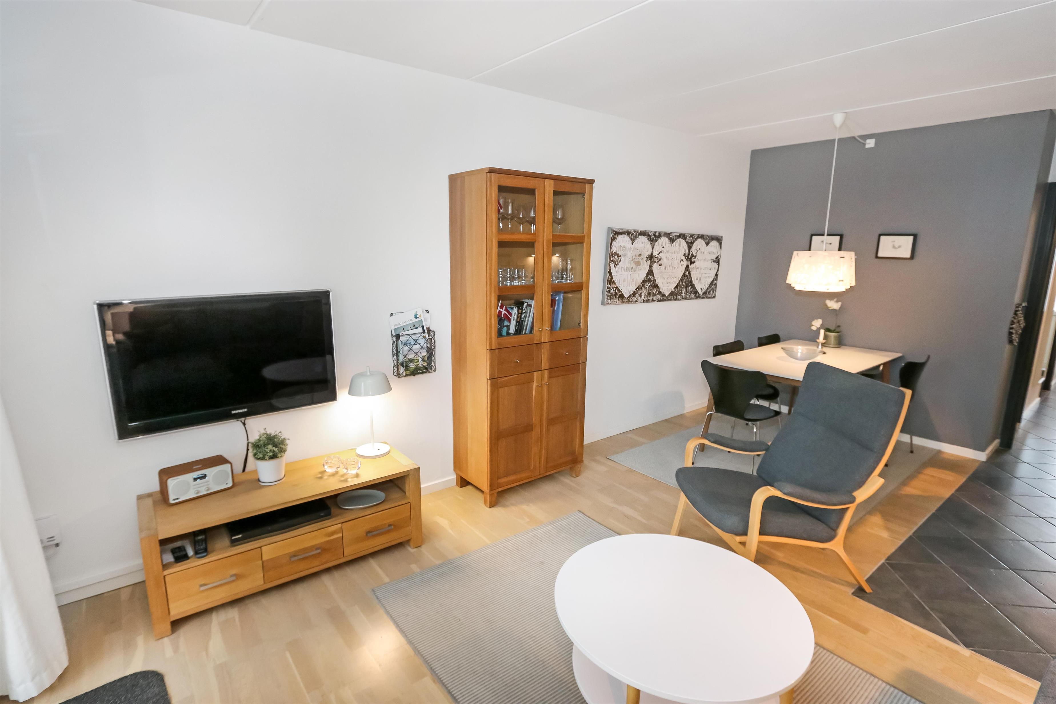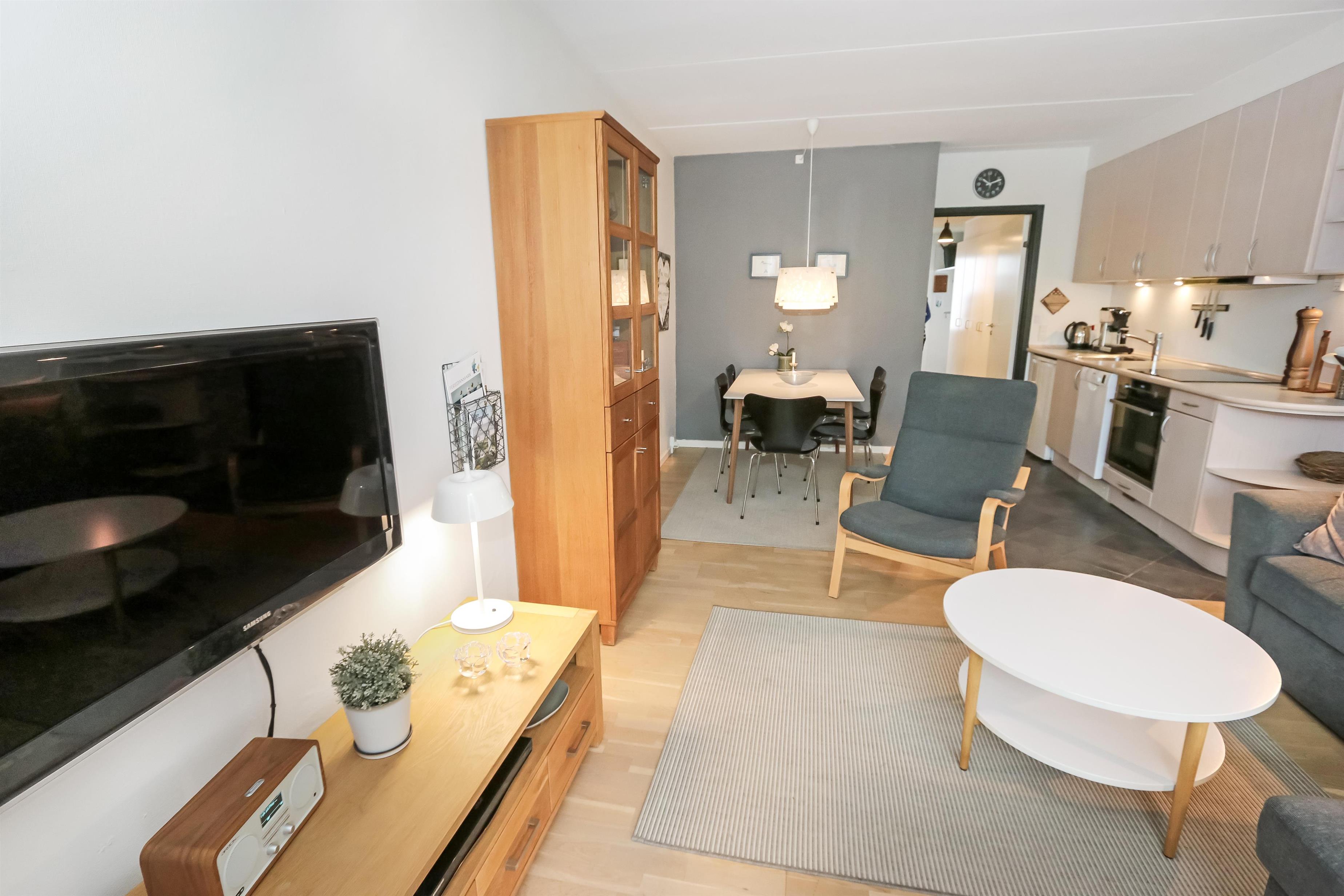 Meget hyggelig og pænt indrettet ferielejlighed til 4 personer. Kombineret stue og køkken. Køkkenet er indrettet med glaskeramisk komfur, emhætte, opvaskemaskine og køleskab med lille frostboks. Stuen er indrettet med trægulv, polstermøbler, radio, CD-afspiller, DVD og kabel-TV, sofaen i stuen kan slåes ud så der er plads til 2 personer. Fra stue er der udgang til lille indhegnet og delvis overdækket terrasse med havemøbler. 1 soverum: 1DS + 1ES. Badeværelse med håndvask, bruser og toilet.