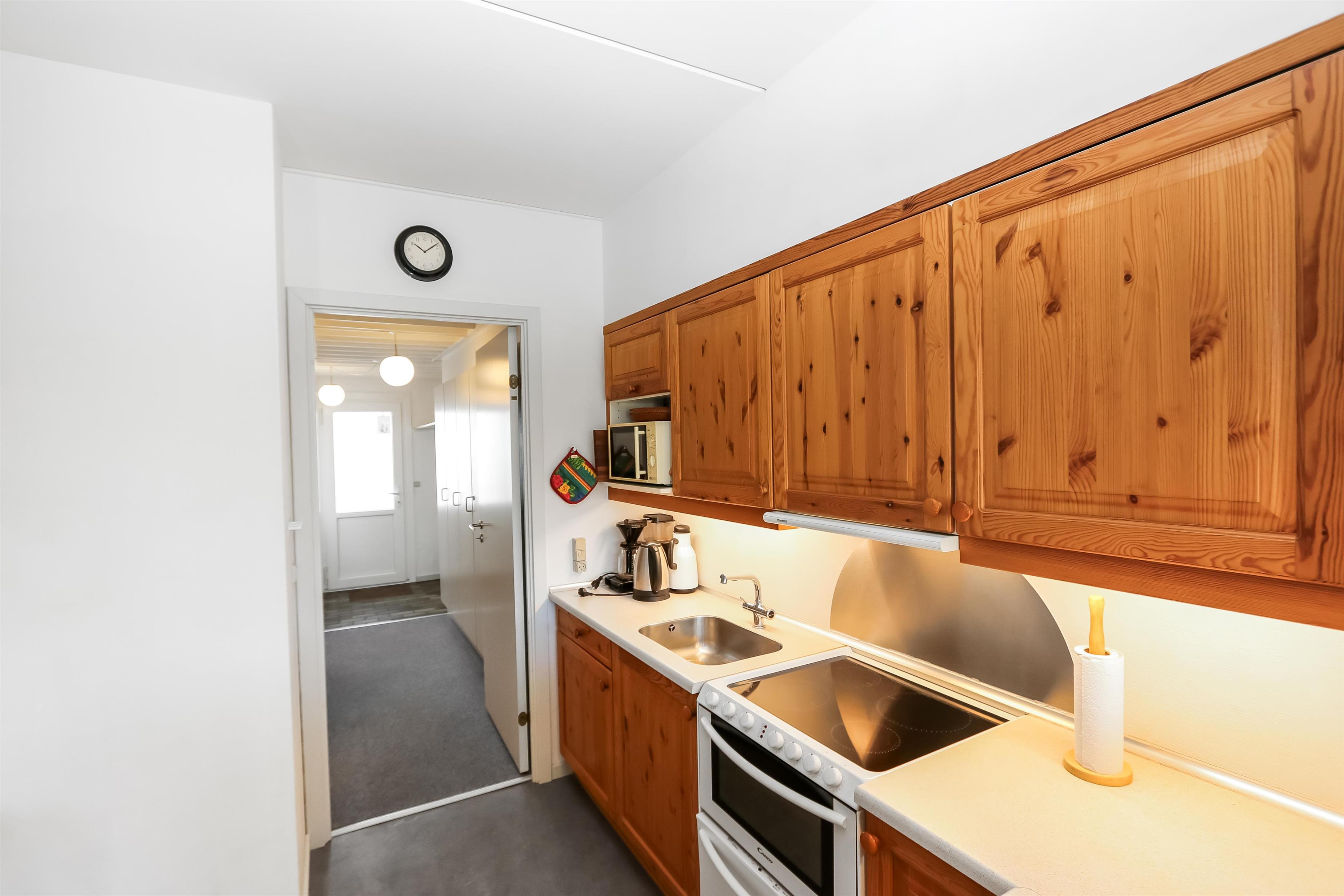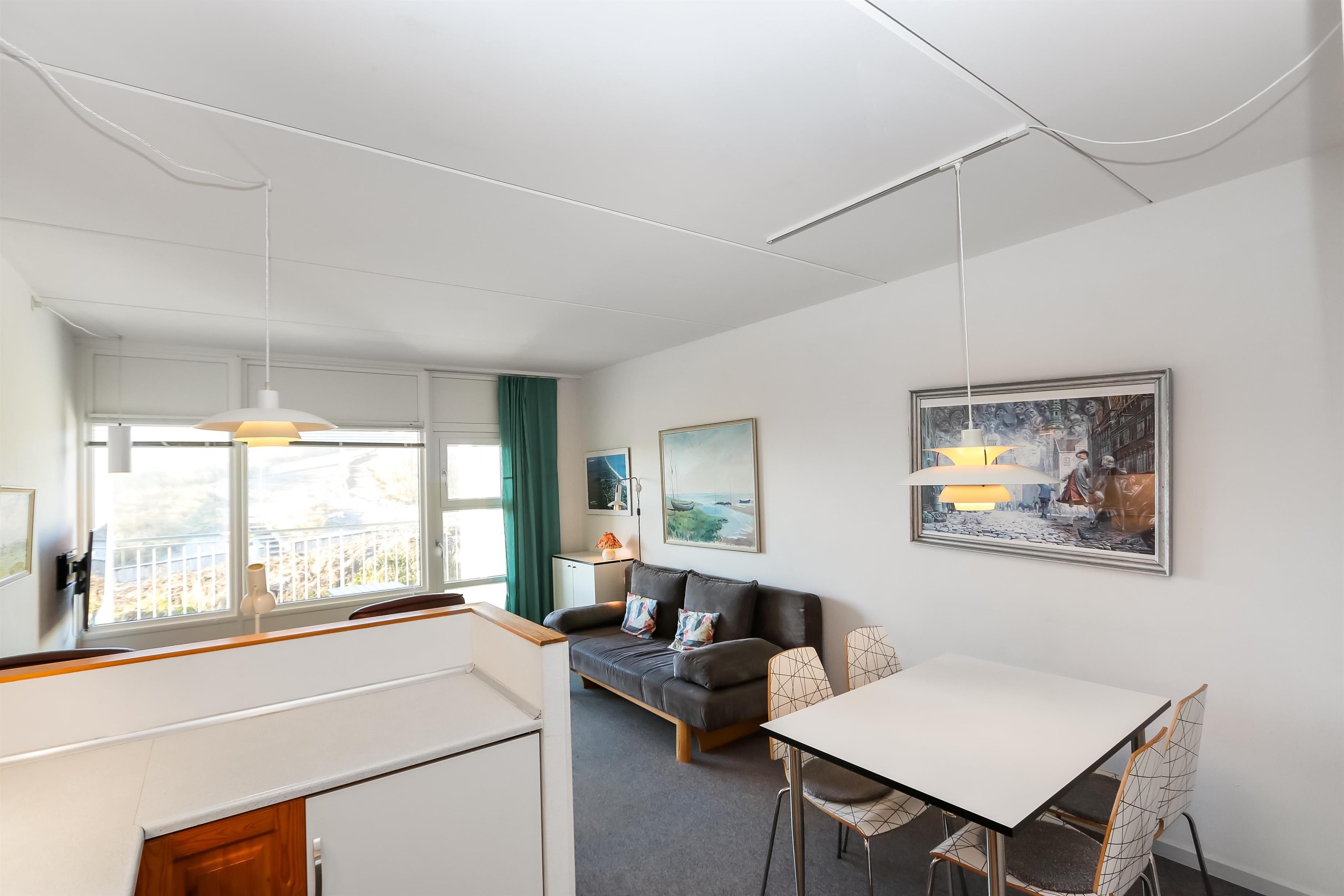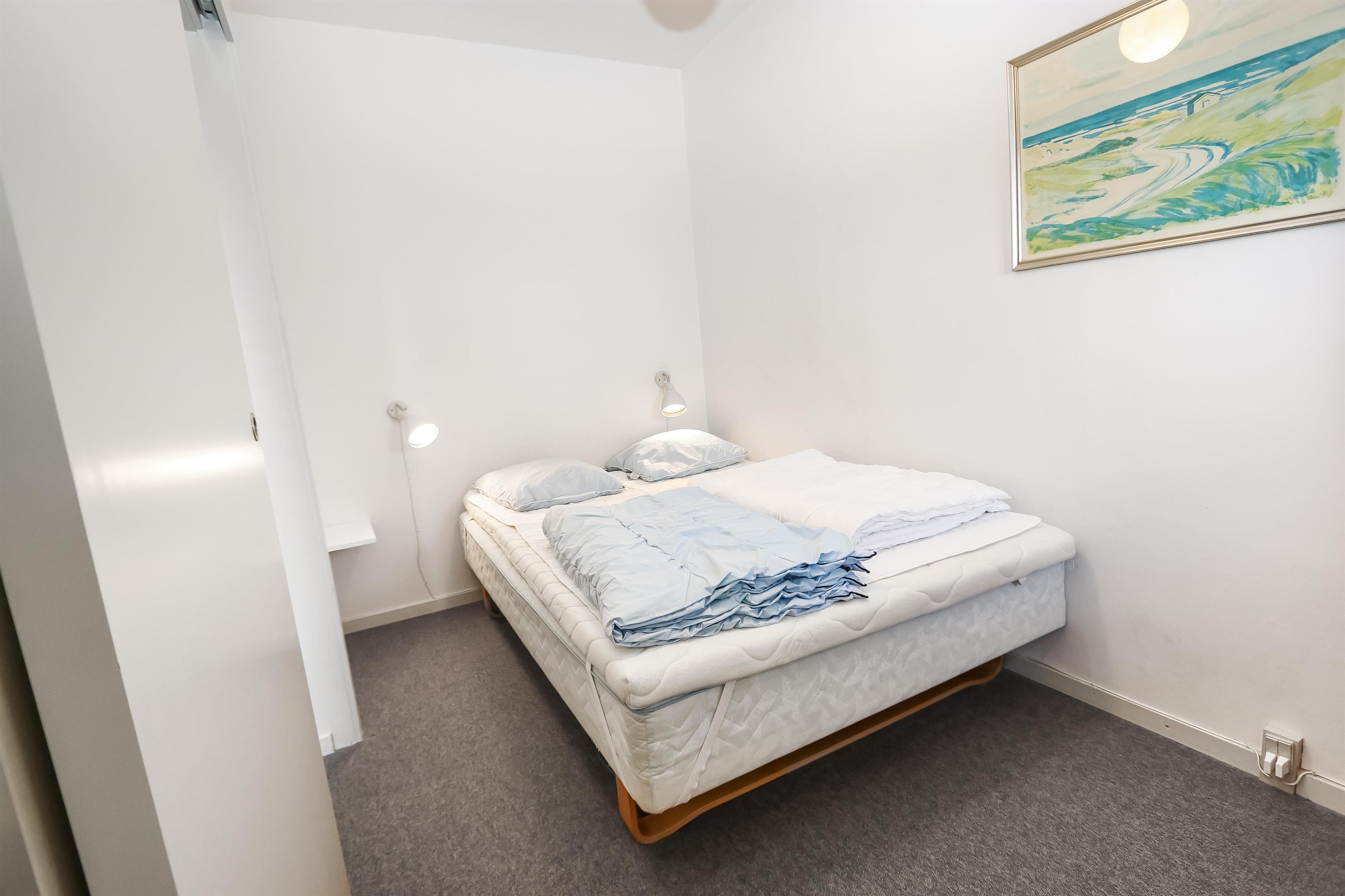 Pæn ferielejlighed til 4 personer beliggende på 1. sal. Kombineret stue og køkken. Stuen er indrettet med kabel-TV, læder og polstermøbler og gulvtæppe. I stuen er der en sovesofa med plads til 2 personer. Fra stuen er der udgang til overdækket balkon med havemøbler. Køkkenet er med glaskeramisk komfur, emhætte, køleskab med lille 10 l frostboks, opvaskemaskine og mikroovn, linoleumsgulv. Badeværelse med toilet, håndvask og bruser. 1 soverum: 1DS og gulvtæppe. Trappen til 1. sal består af 14 trappetrin.