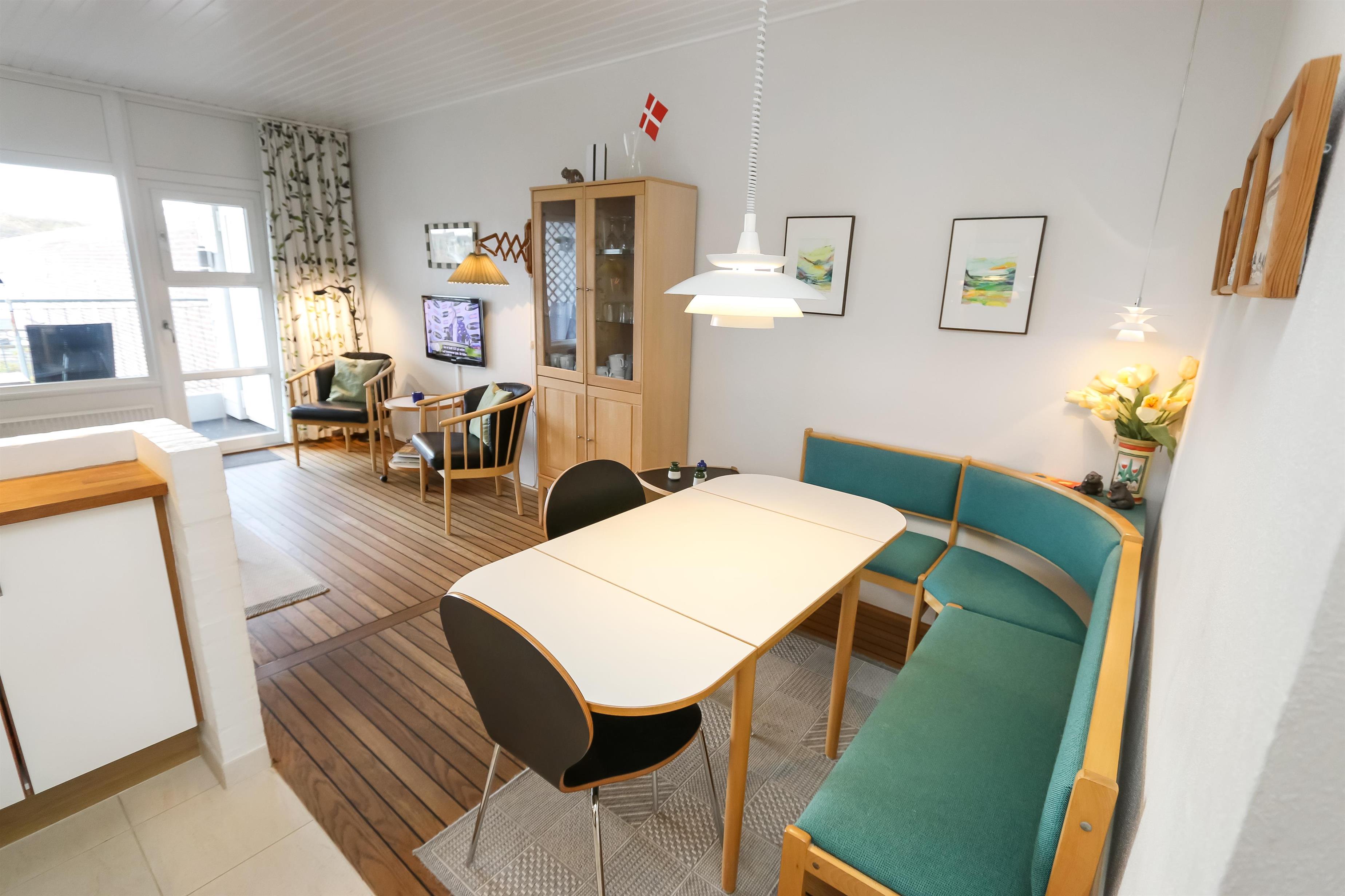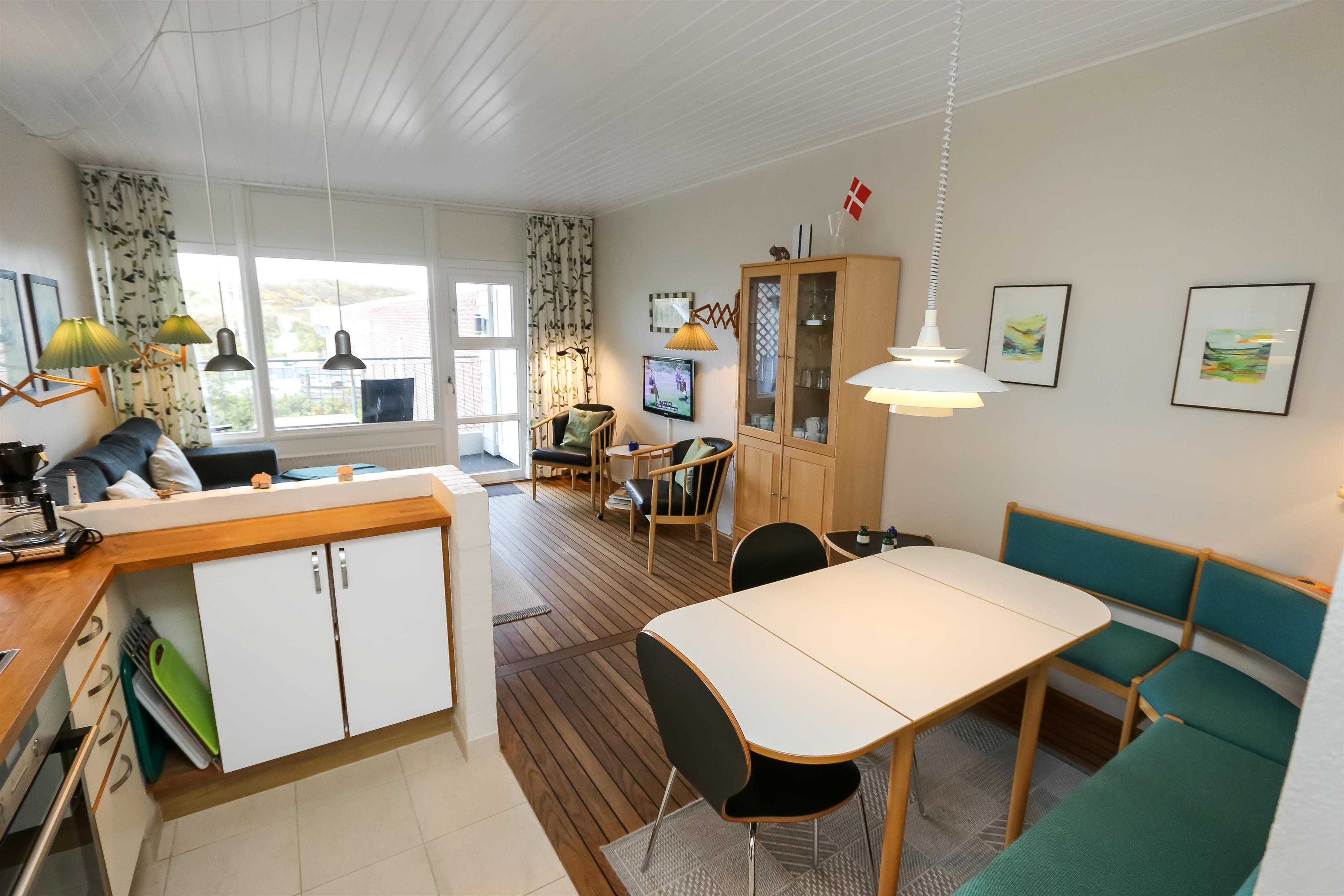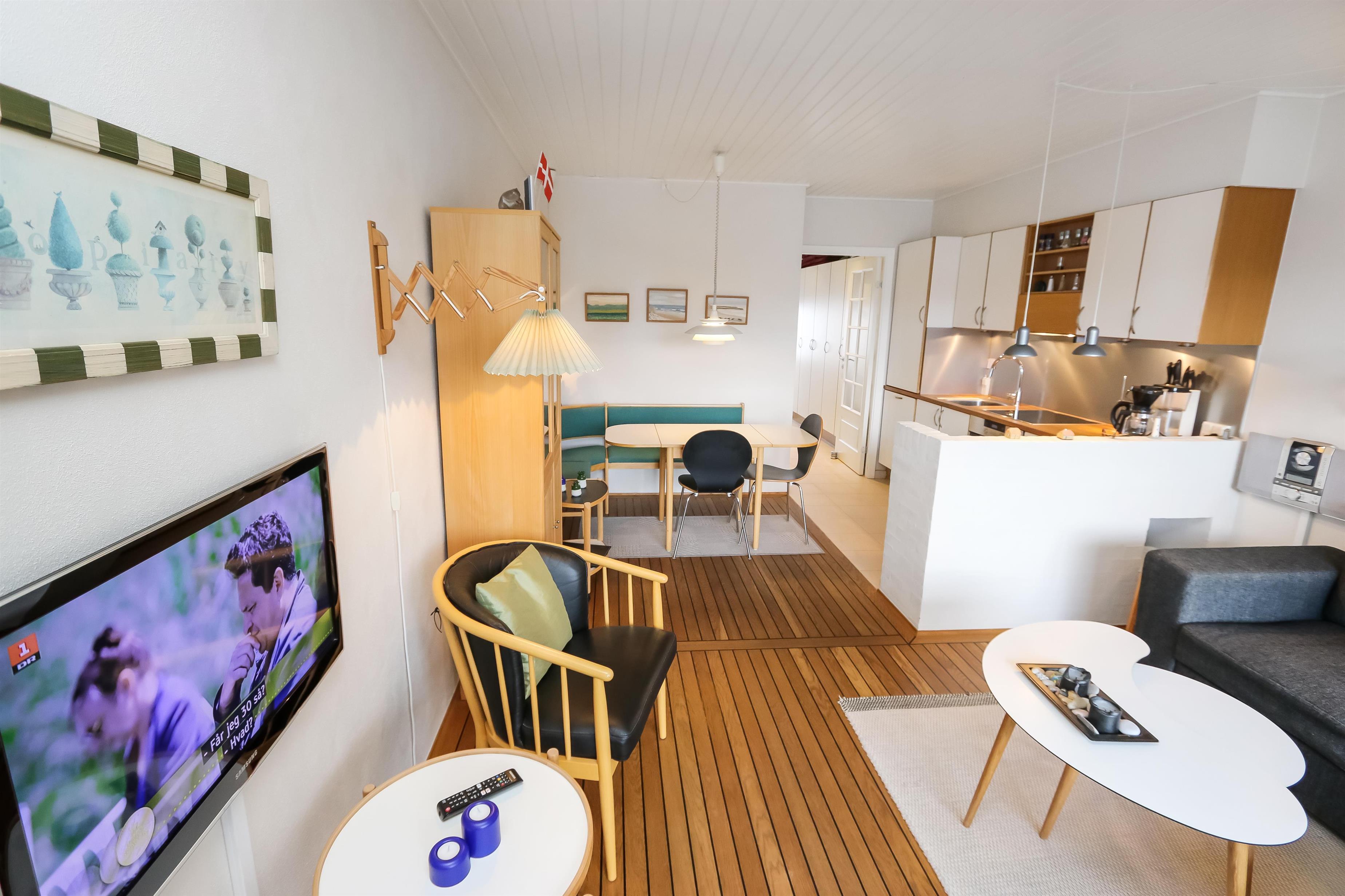 Pæn ferielejlighed beliggende på 1. sal med balkon og havemøbler. Kombineret stue og køkken. Køkkenet er indrettet med glaskeramisk komfur, køleskab med lille frostbox, emhætte og klinkegulv. Stuen er med kabel-TV, læder og polstermøbler og trægulv. Sofa i stuen kan slåes ud så der blir 2 sovepladser. 1 Soverum: 1DS + 1ES med ekstra TV og trægulv. Badeværelse med toilet, håndvask og bruser. Lejligheden er rigtig pæn og velholdt. Trappen til 1. sal består af 40 trappetrin.