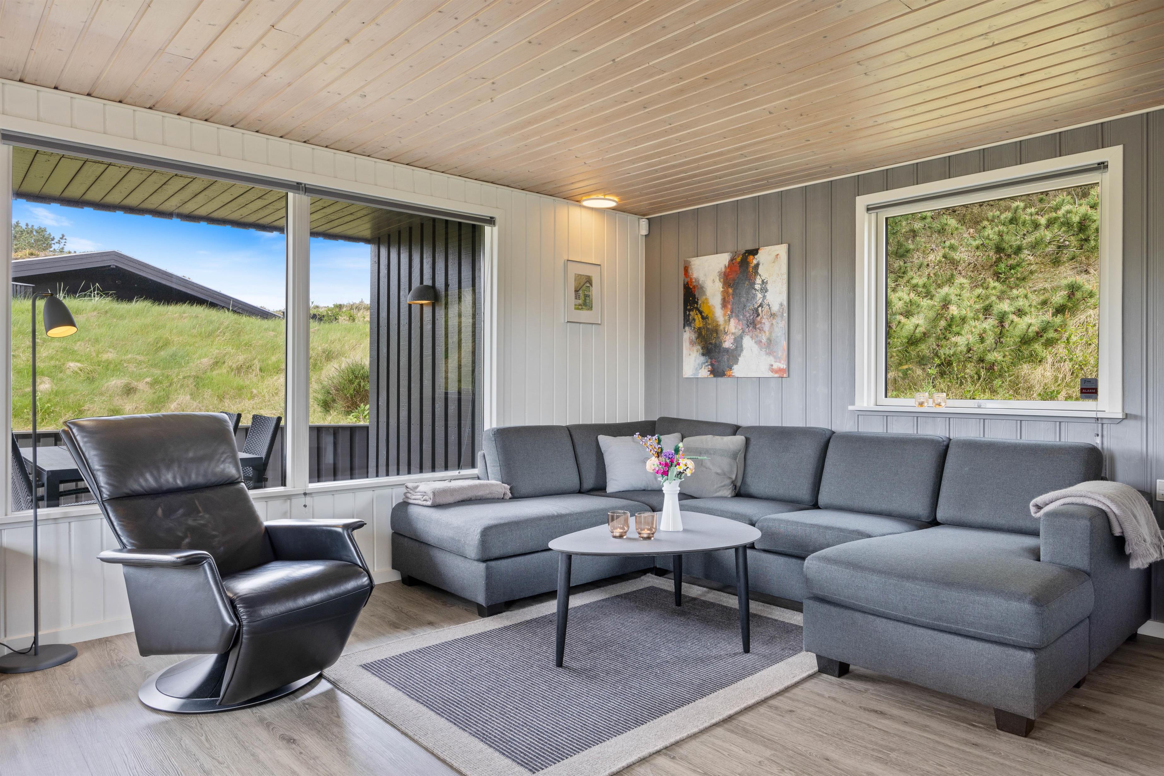 Sommerhuset, som er opført i 1977, falder med sit karakteristiske tag godt ind i det omkringliggende klitlandskab. Sommerhusets indre er præget af et moderne look med nutidens møbler og materialer samt flere lækre detaljer.