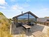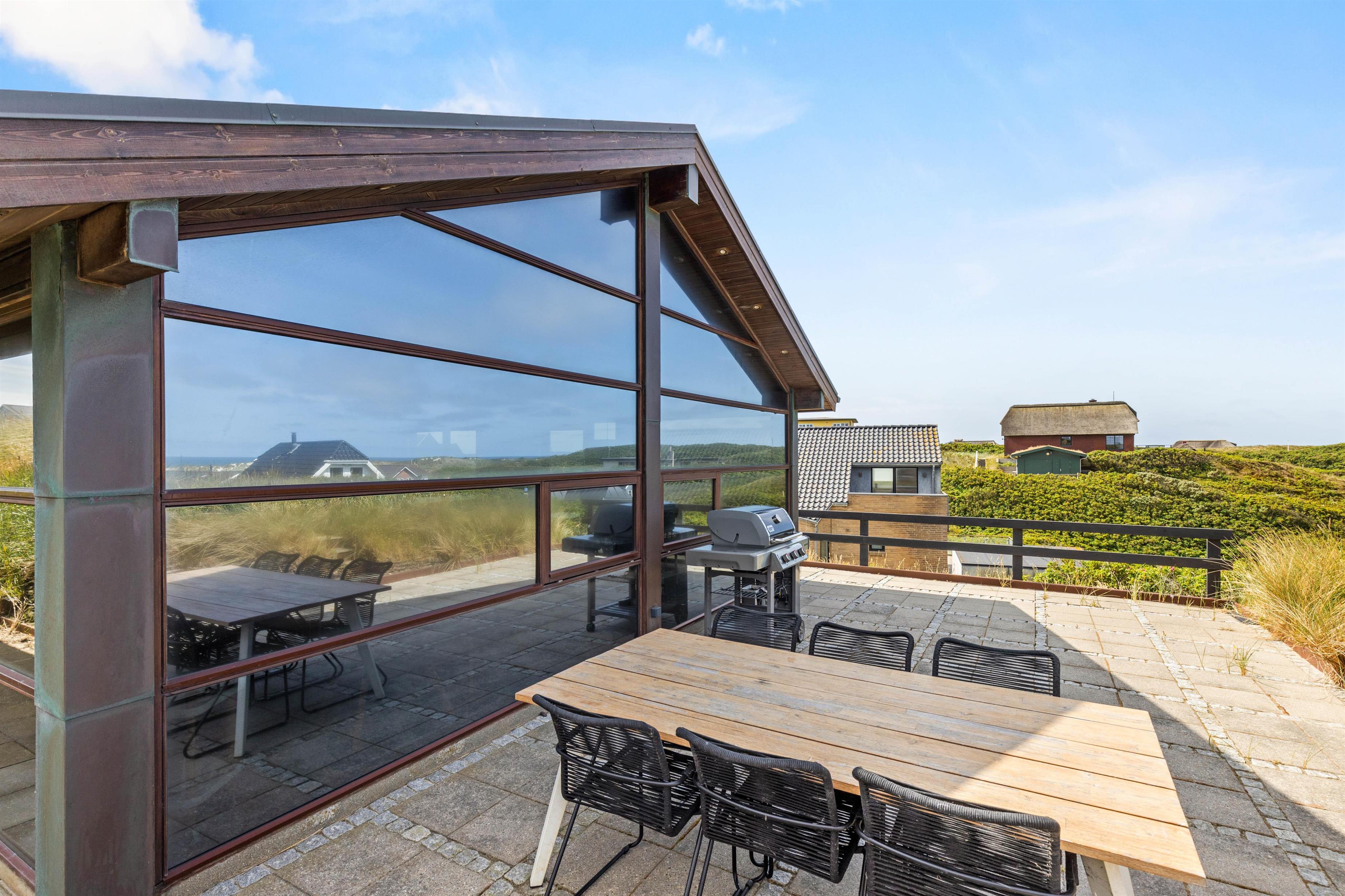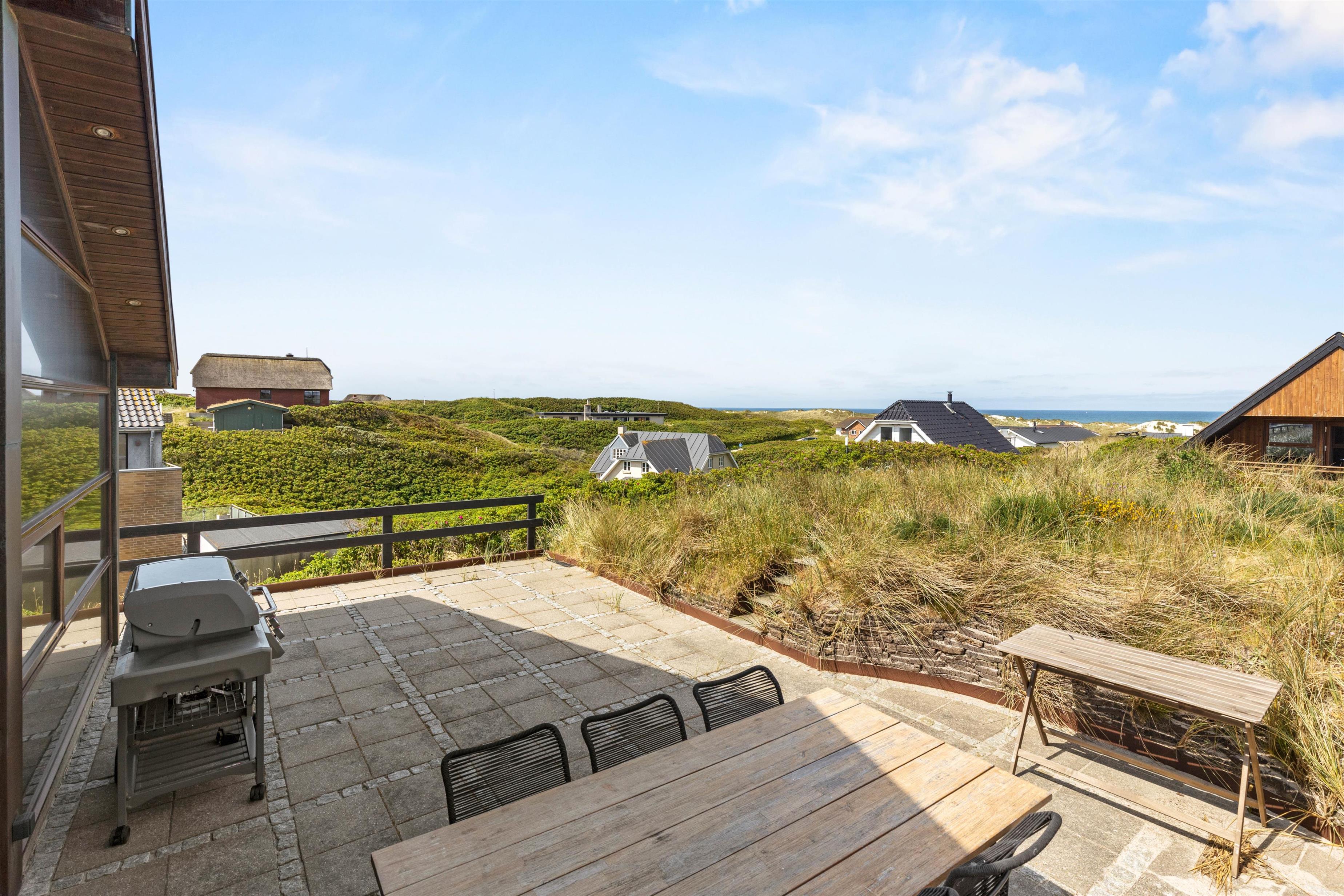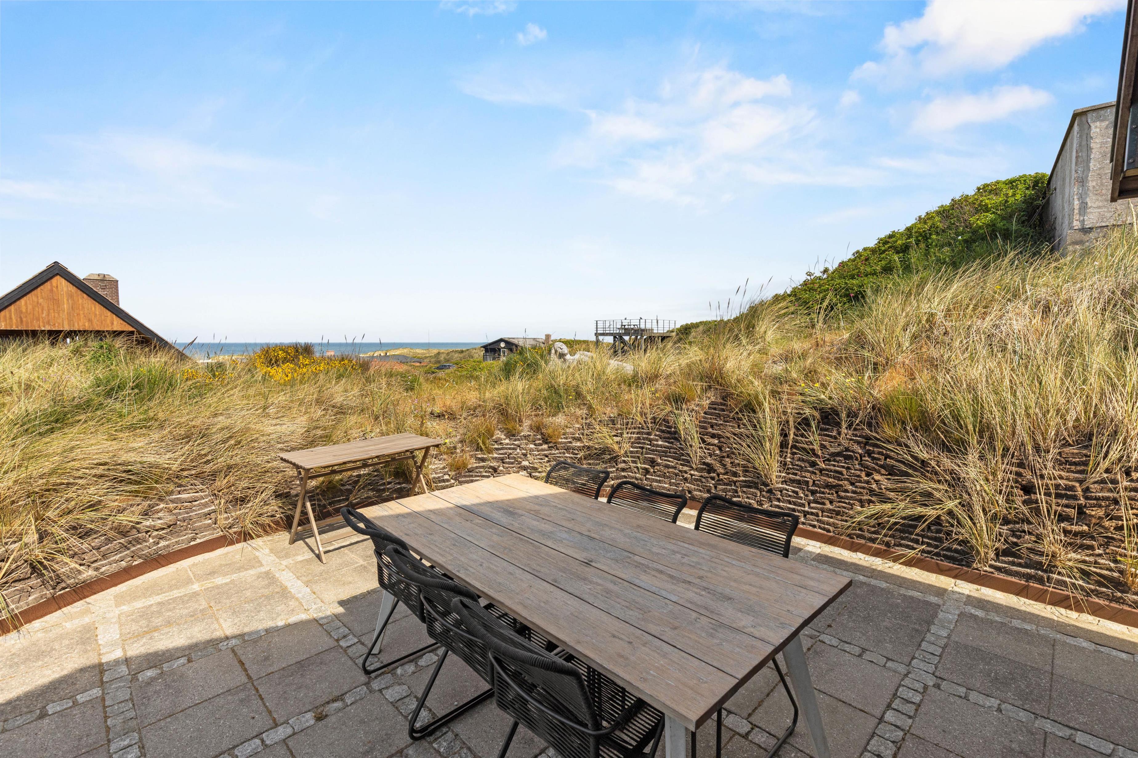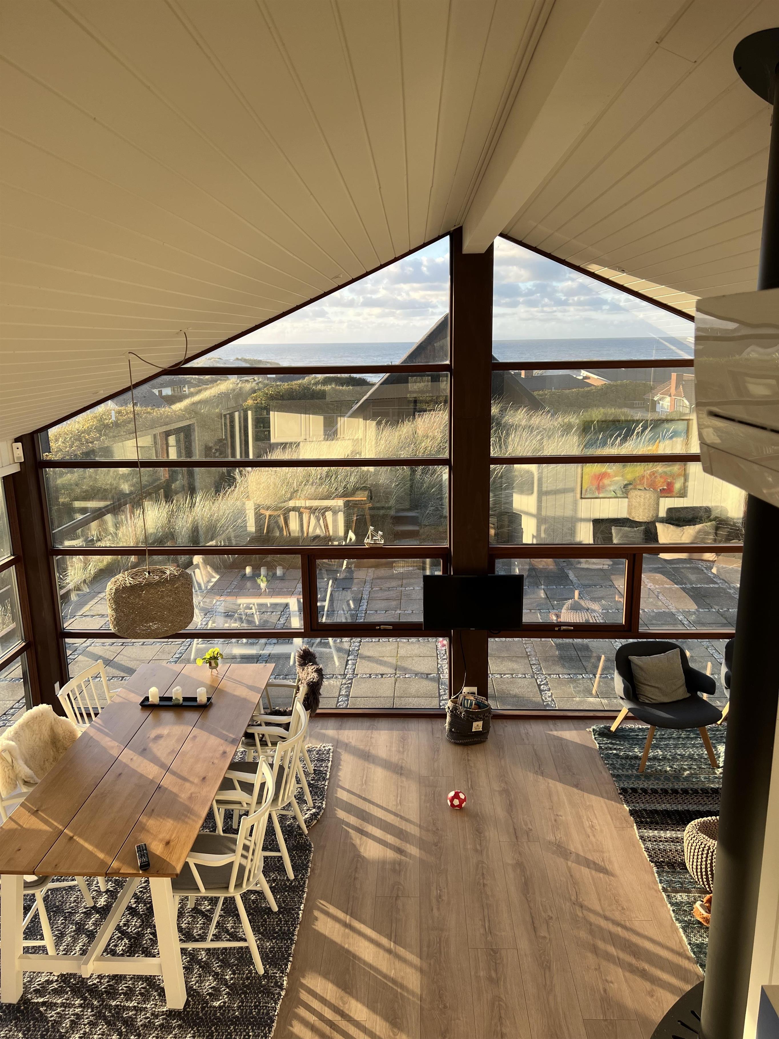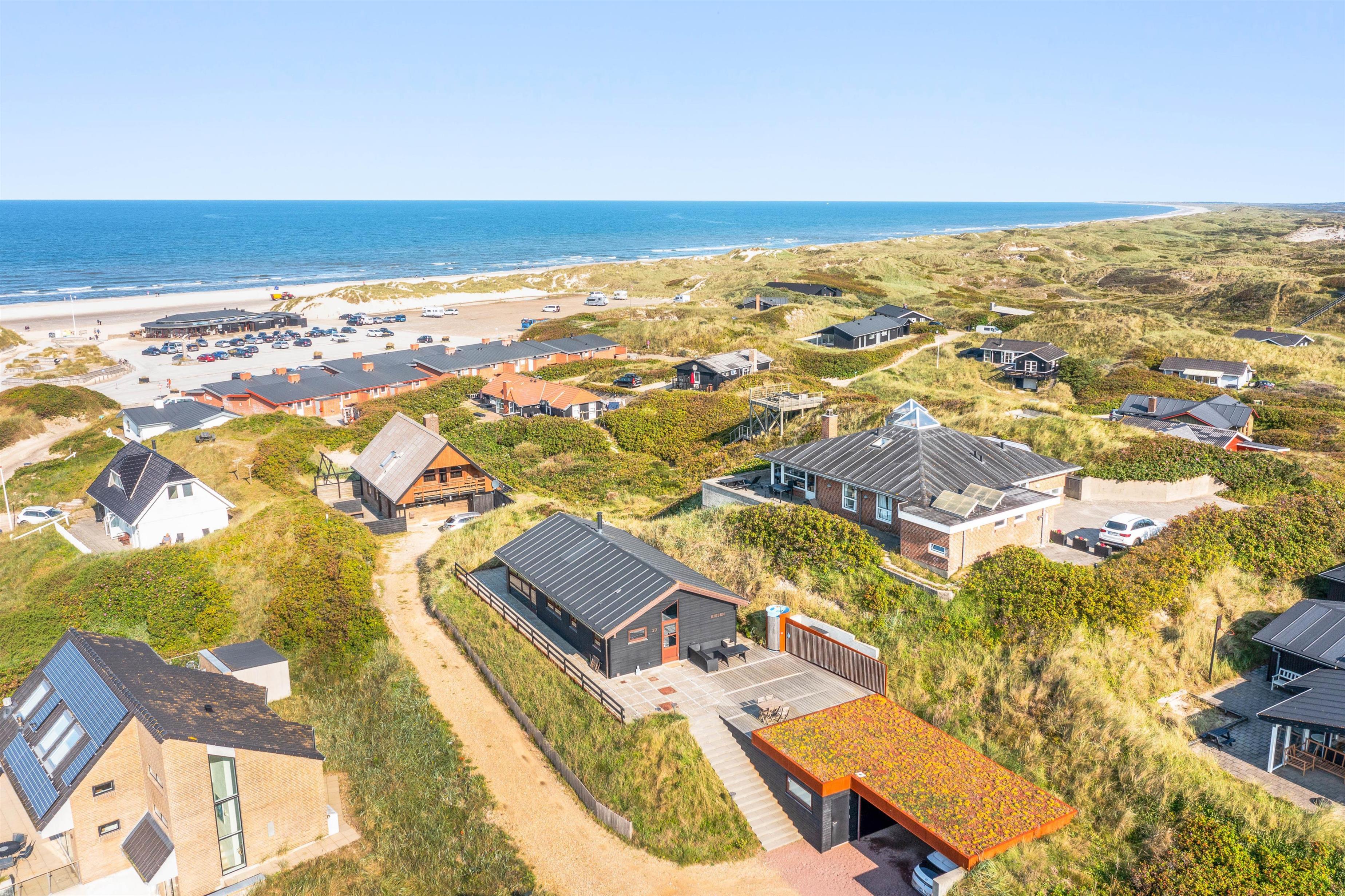 Feriehusets beliggenhed er helt unik. Feriehuset ligger på en klit, og fra feriehusets store carport, der kan rumme 2 biler, fører en trappe jer op til selve feriehuset. Så snart I træder ind i huset, vil I blive draget af de store vinduespartier, der giver en skøn udsigt over klitter og Vesterhavet, samtidig med at de lader en masse lys ind i feriehuset.