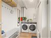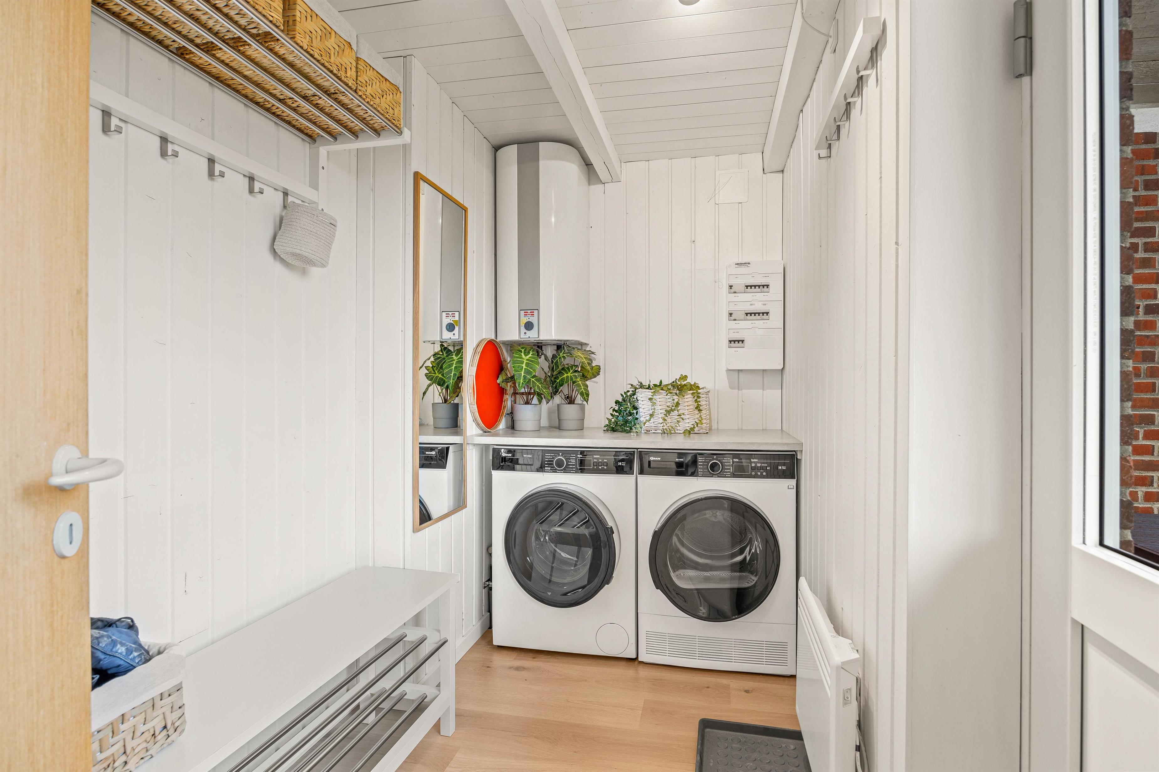 Der er også god opbevaring/garderobeplads i den hyggelige baggang, samt vaskemaskine og tørretumbler.