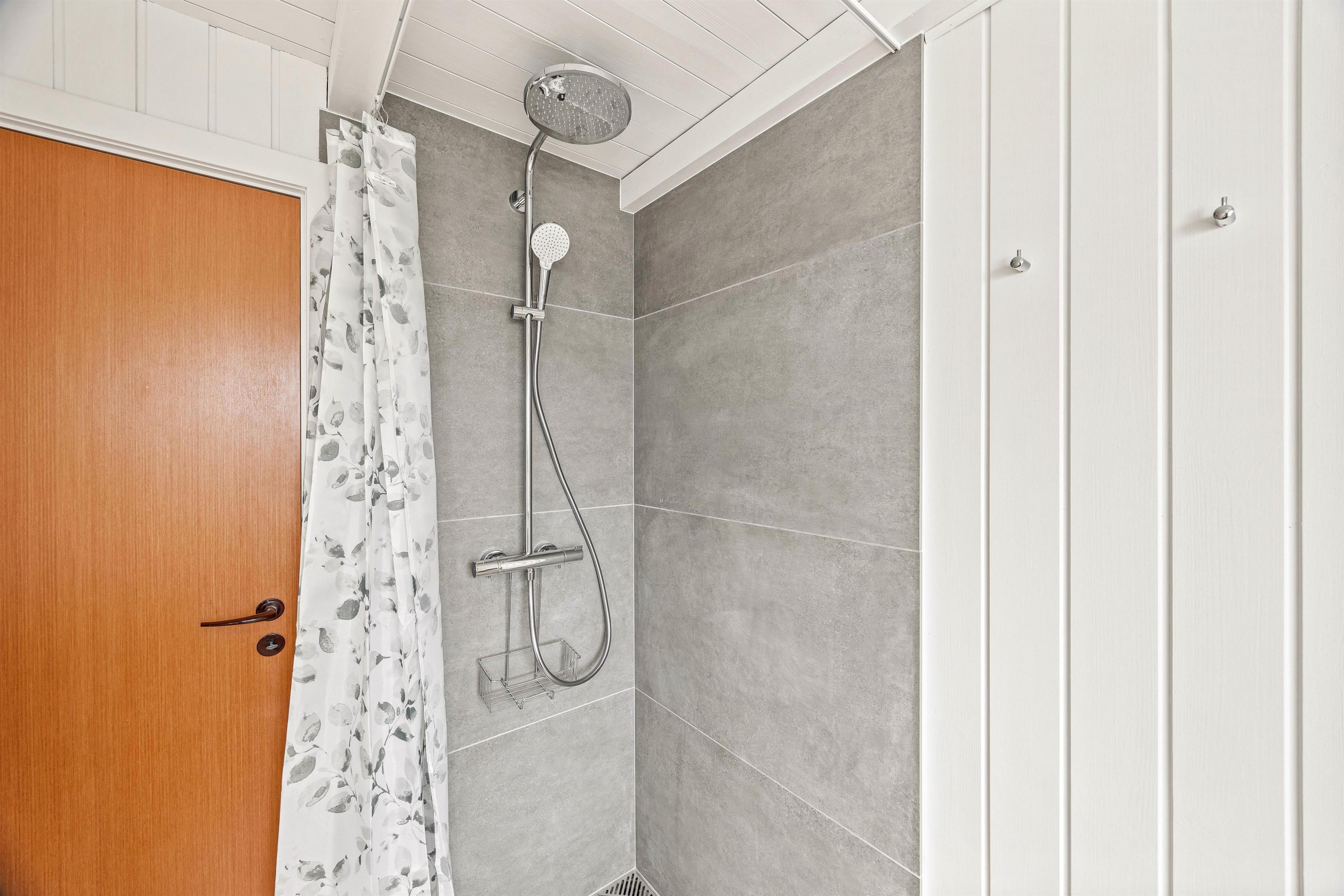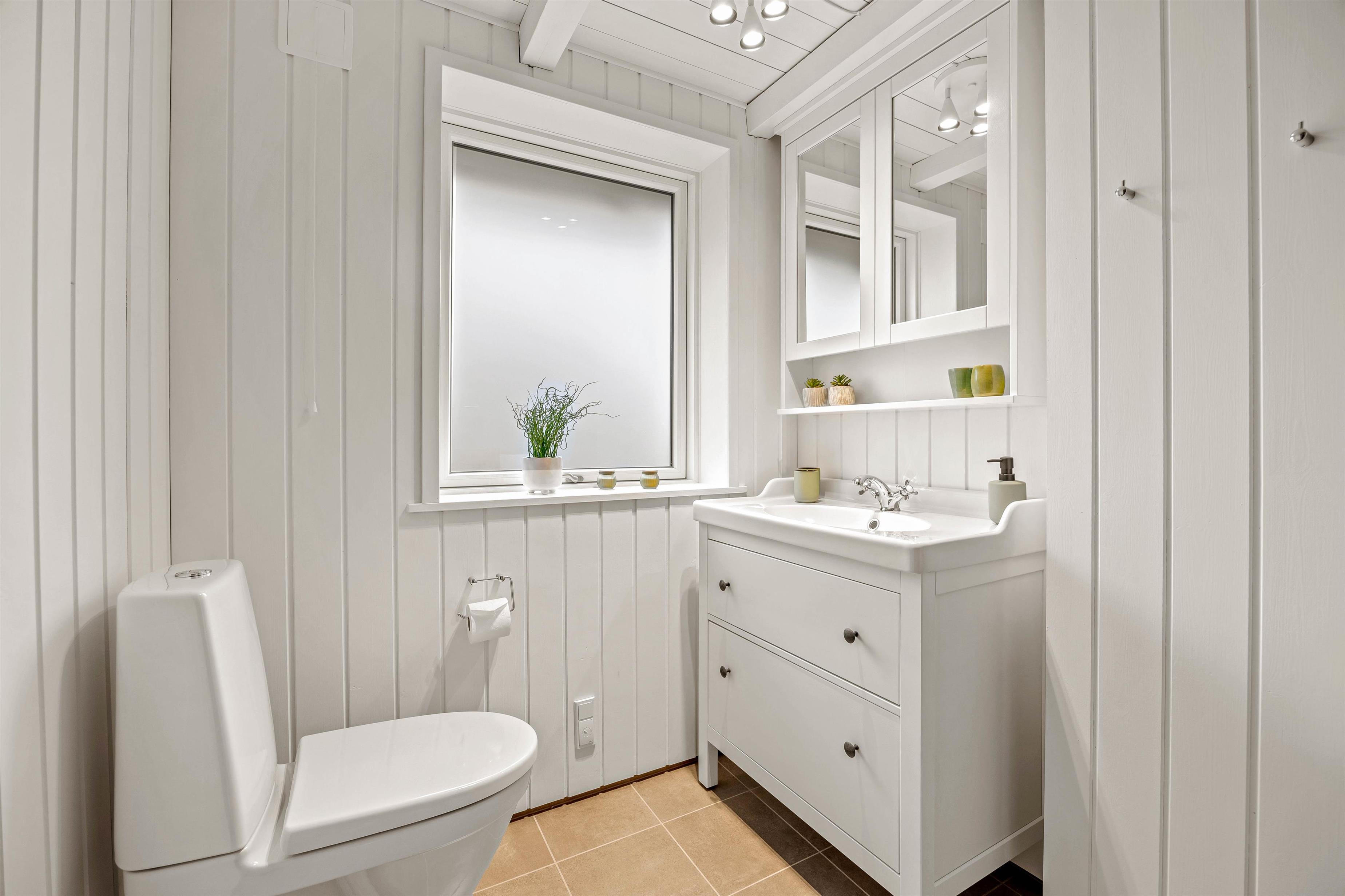 Badeværelset er renoveret inklusiv gulvvarme og med god opbevaringsplads.