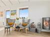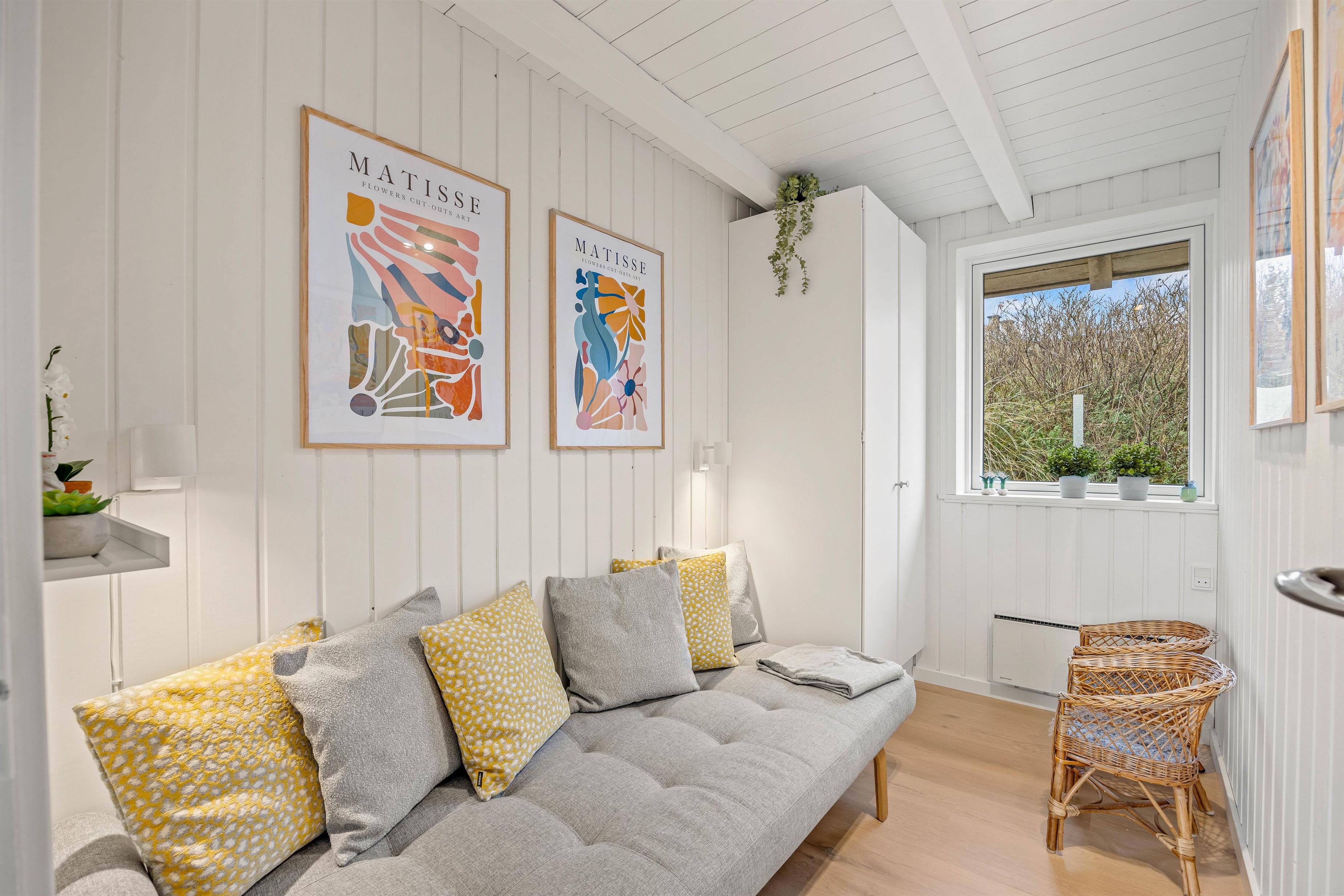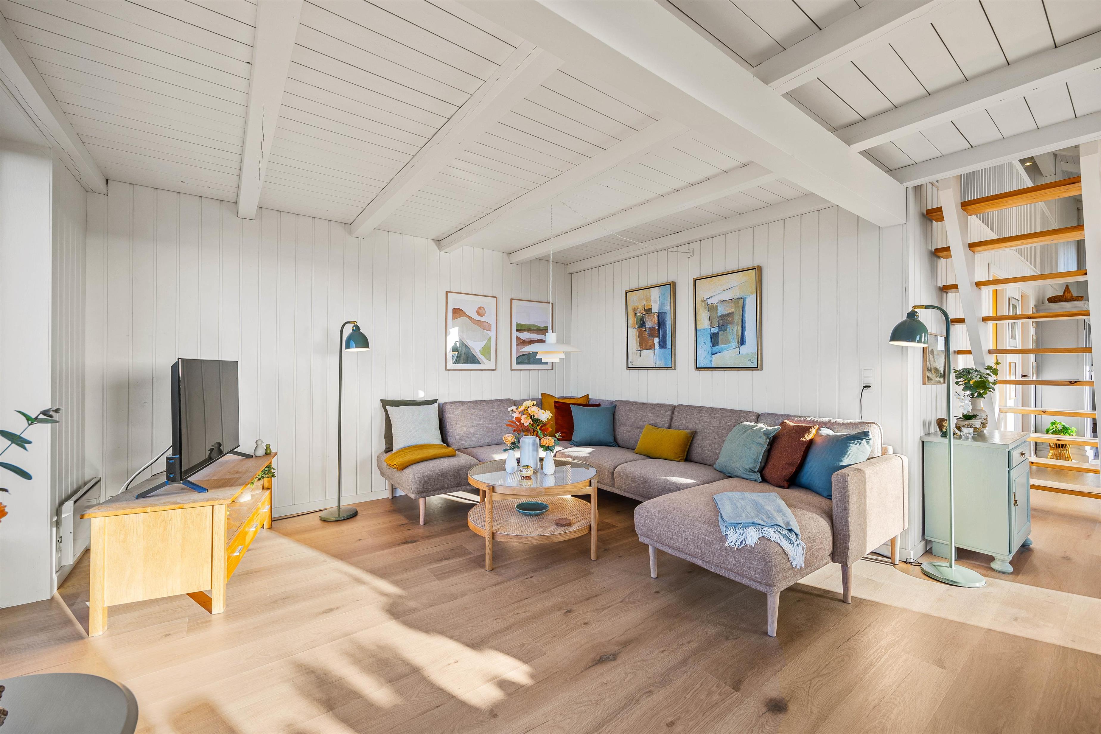 Alle vægge og lofter i sommerhuset er hvidmalede, og står i flot kontrast til renoveringen og interiør valg. Der er flotte laminatgulve overalt og den rummelig sofa giver plads til afslapning, hygge, tv, spil mm. Hyggestolene indbyder til at slappe af med en god bog eller håndarbejde tæt ved varmen fra den nye brændeovn.