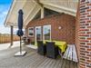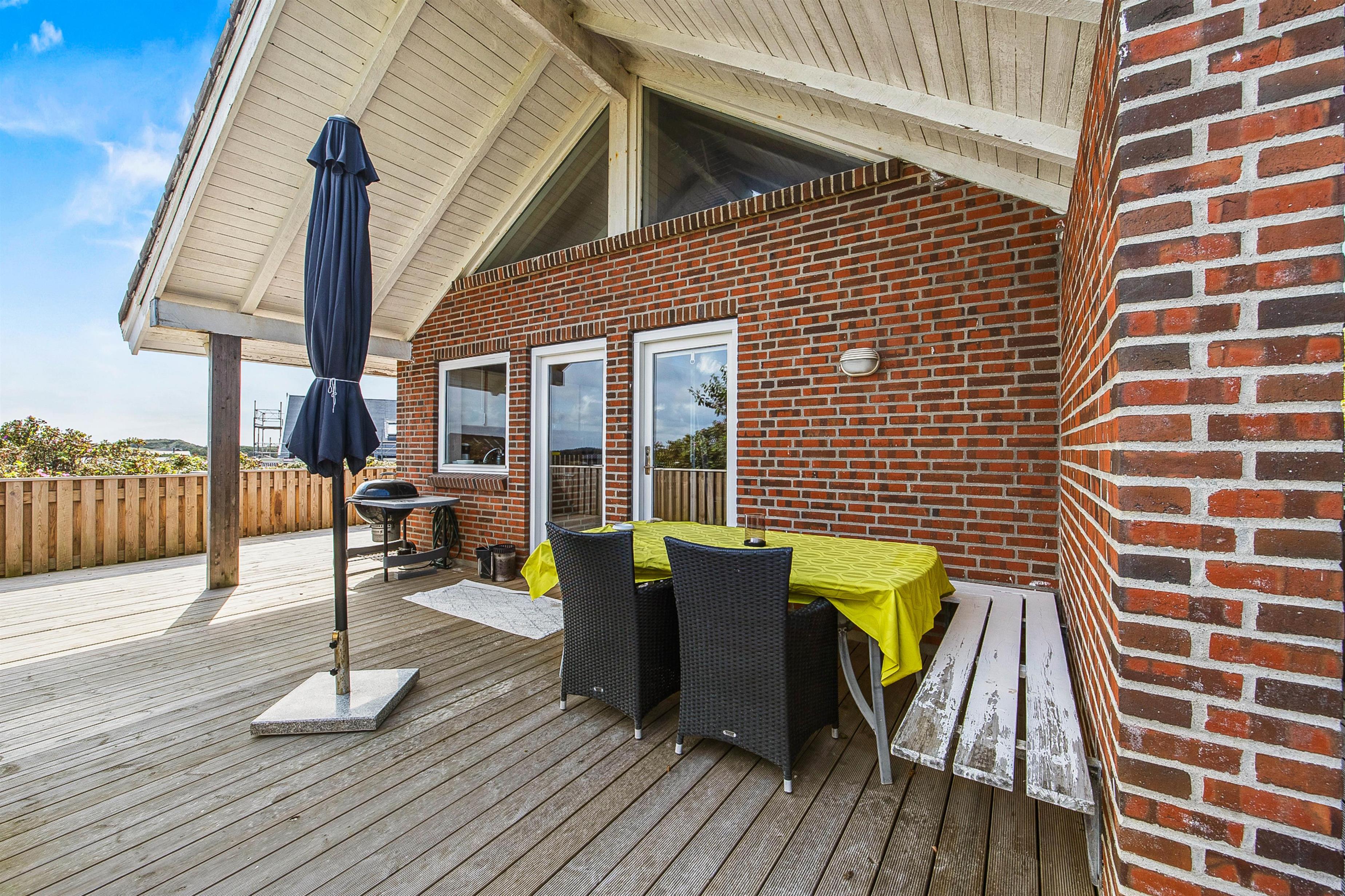 I dette skønne sommerhus er øst og vest terrassen overdækket, Der er et plankeværk rundt om hele terrassen, så I kan nyde den enestående panoramaudsigt og lyden fra havet i de nye havemøbler.