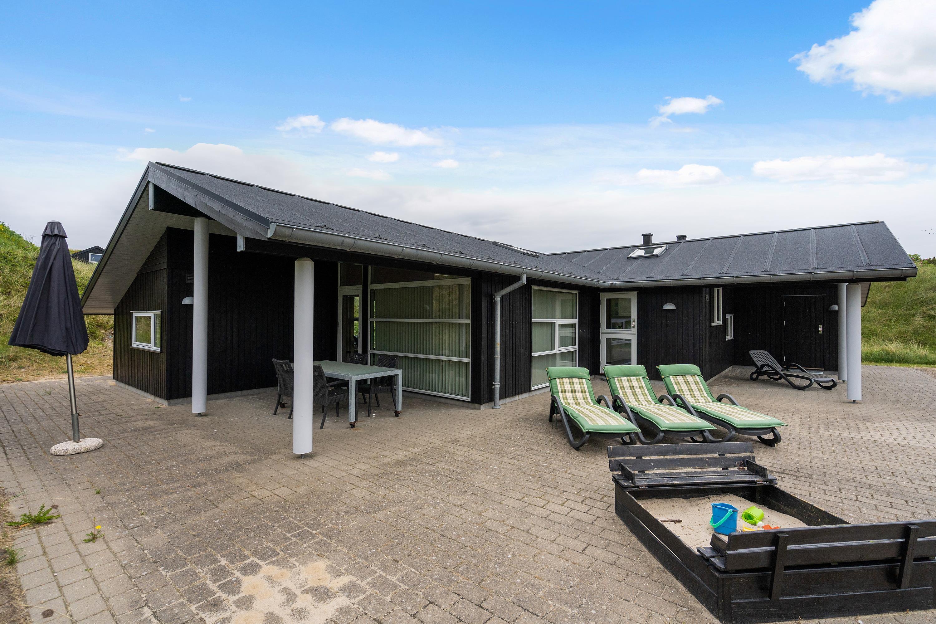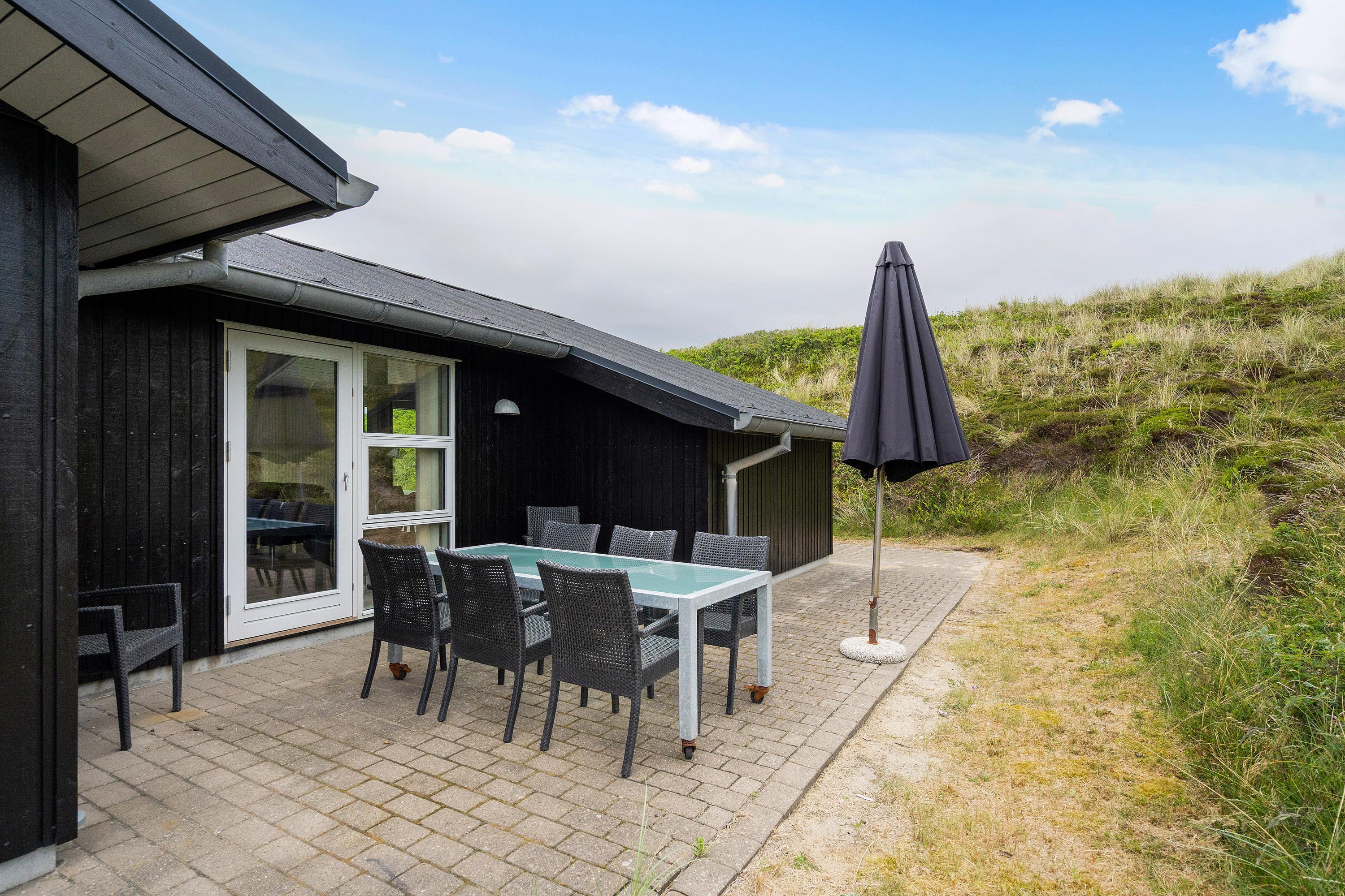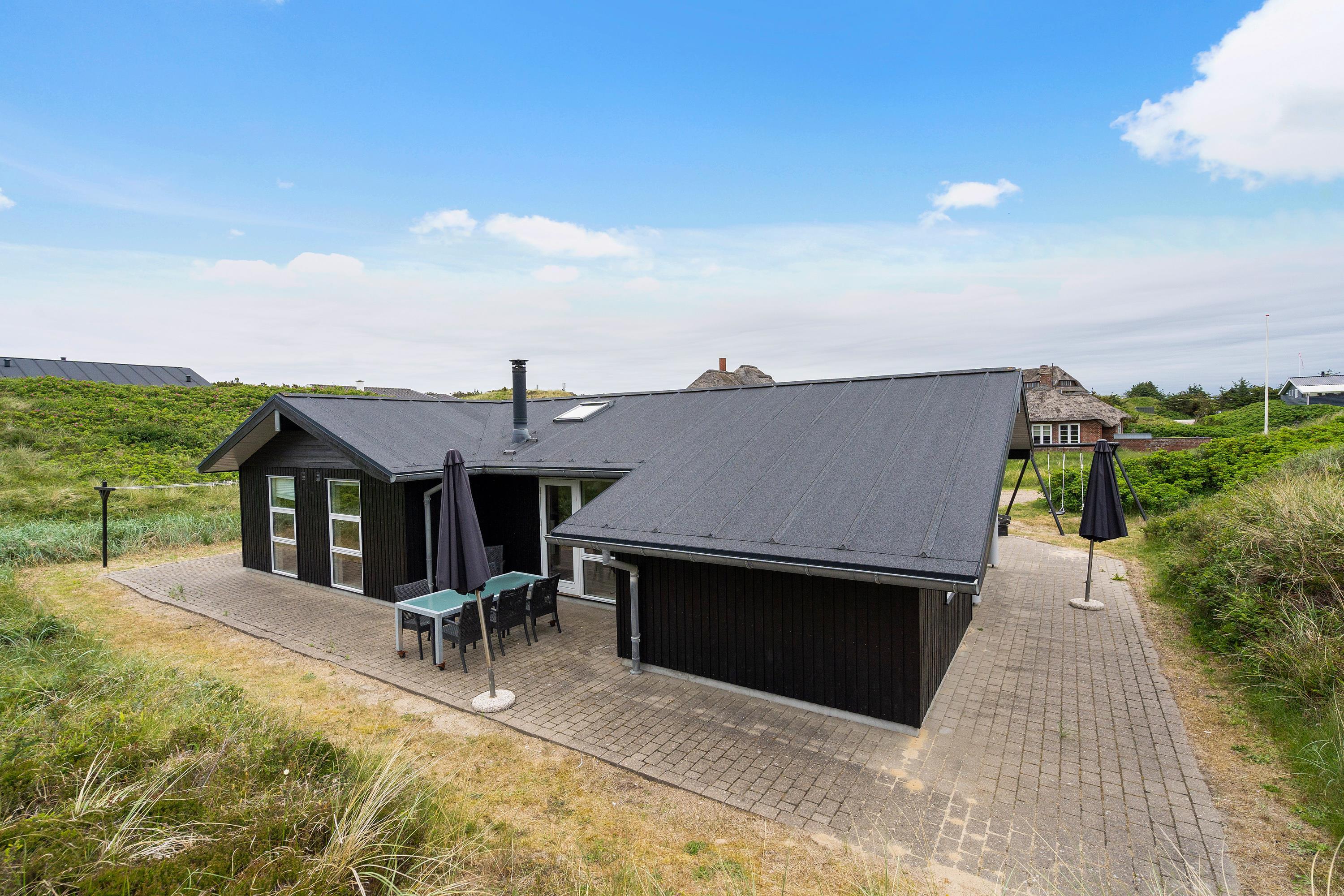 Uderummet er helt optimalt til de solrige dage. Der er flere hyggelige siddekroge rundt om sommerhuset, der er forbundet af en flisesti hele vejen rundt. Den store østvendte terrasse har både en åben og overdækket del, og en høj klitbanke afskærmer uderummet fra det omkringliggende sommerland.