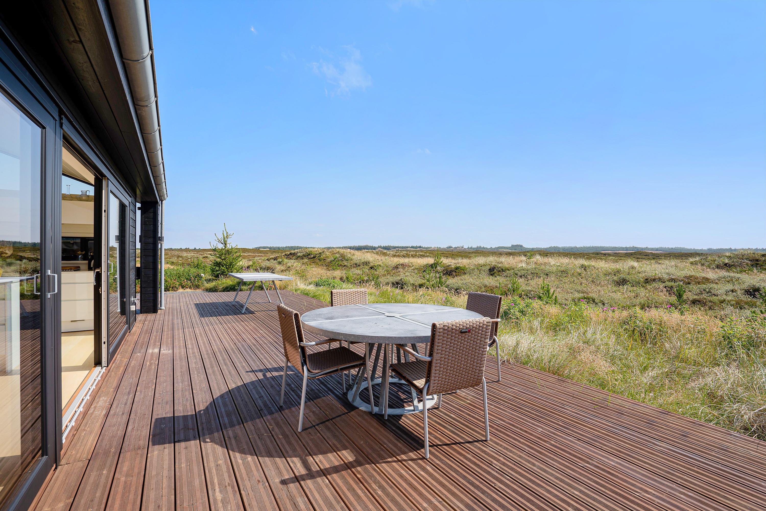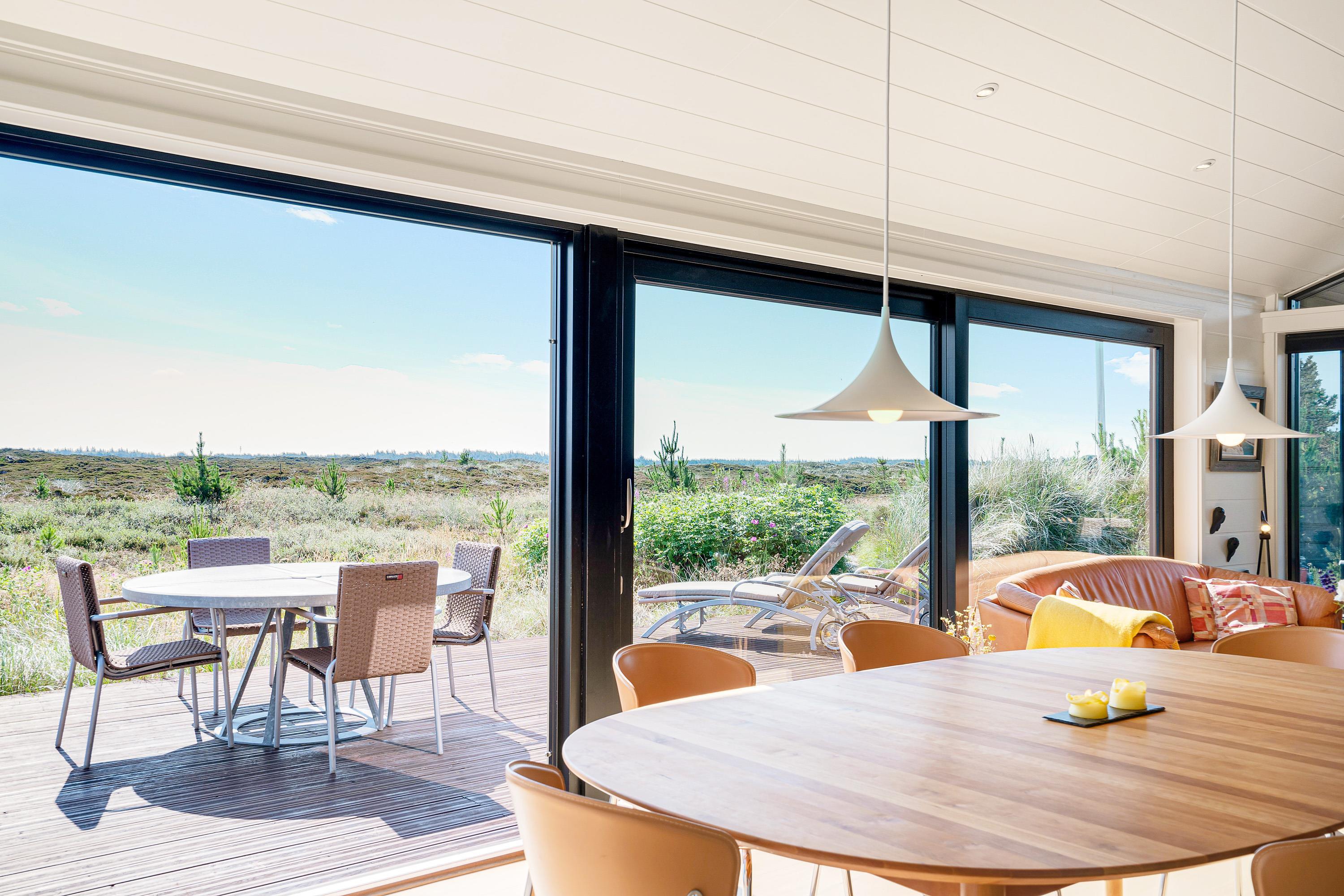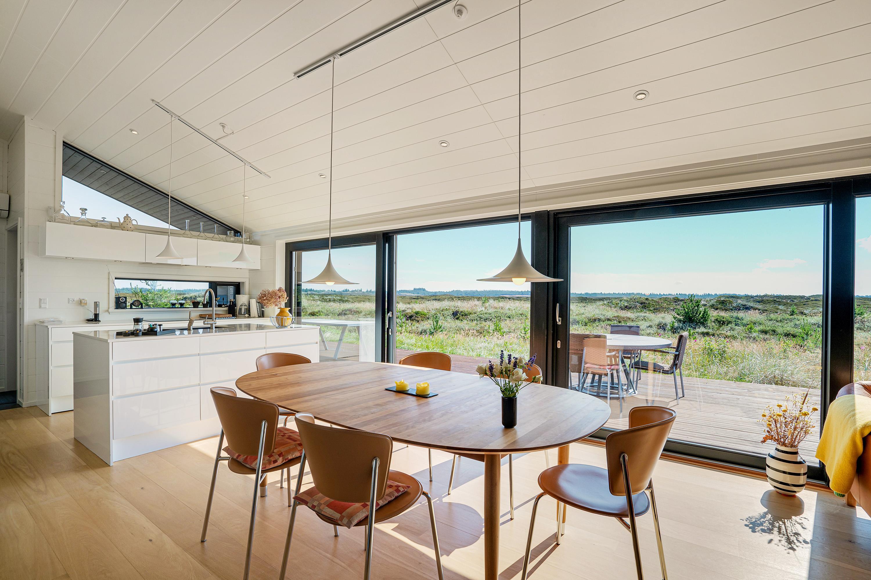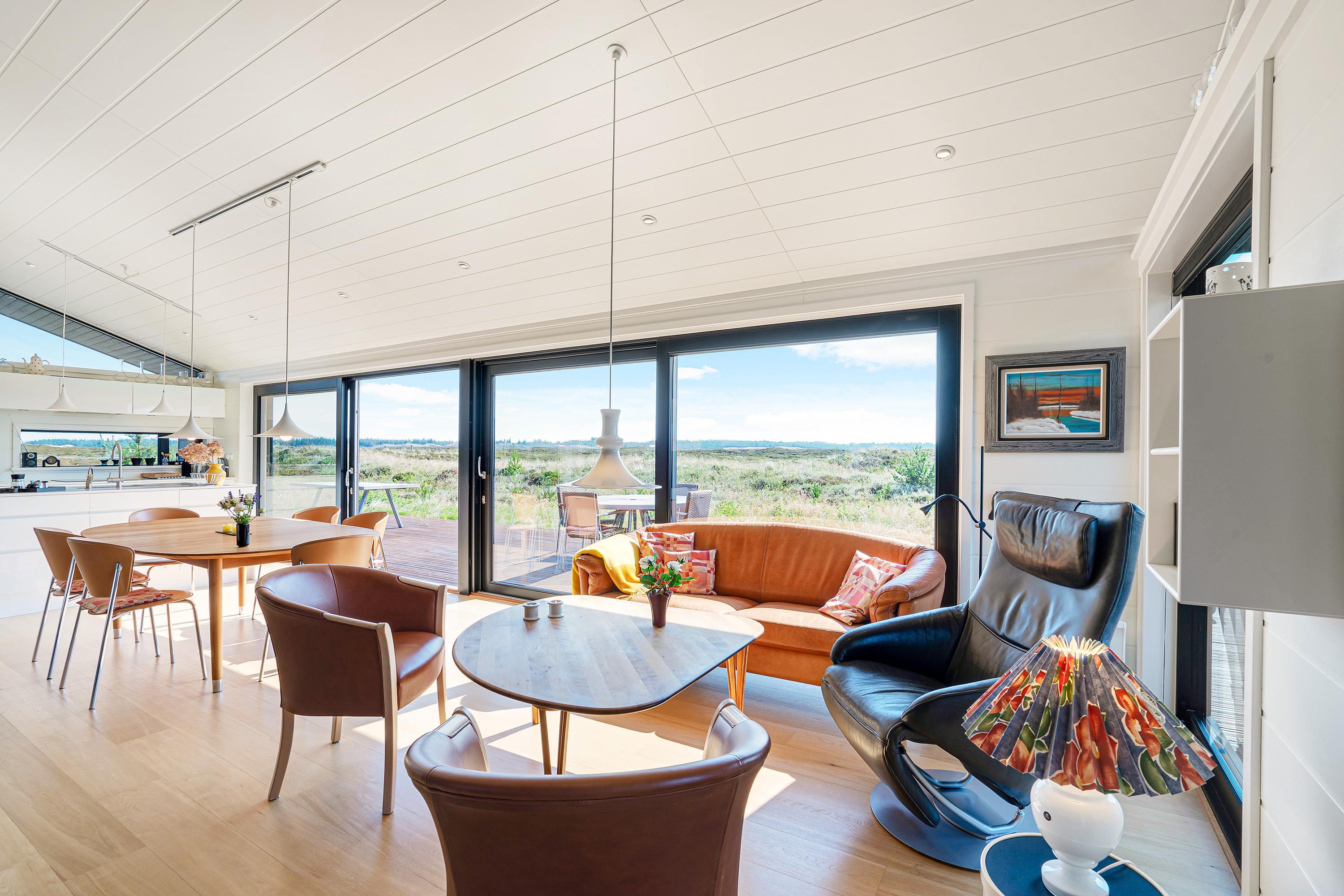 Køkken, stue og spisestue er ét stort rum, så I stadig kan være sammen, selvom nogle er i køkkenet og andre slapper af på sofaen. Derfra er der direkte adgang til terrassen, hvor I kan nyde morgensolen. Den vidunderlige udsigt over det store lyngområde kan både nydes fra terrassen og inde fra feriehuset.