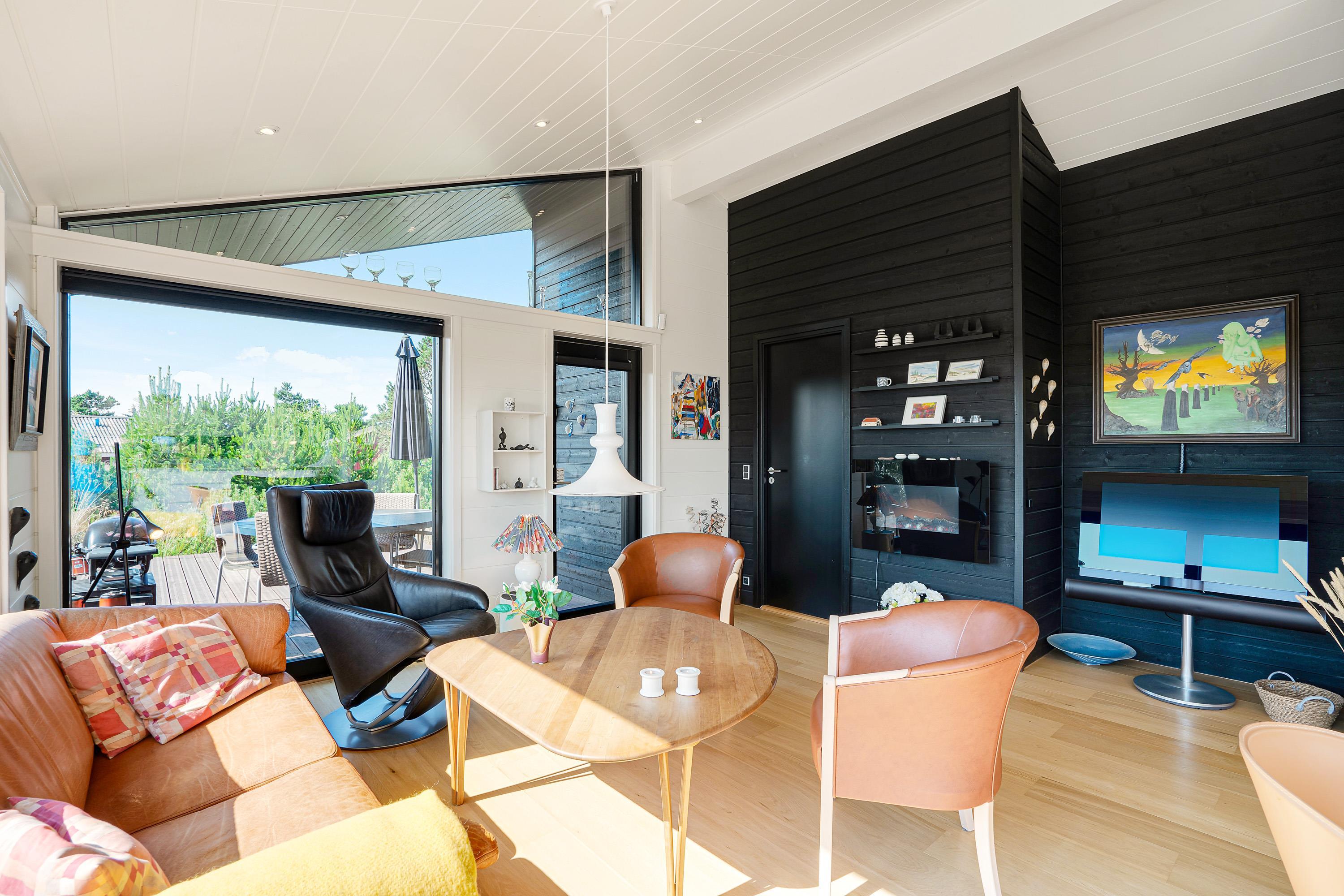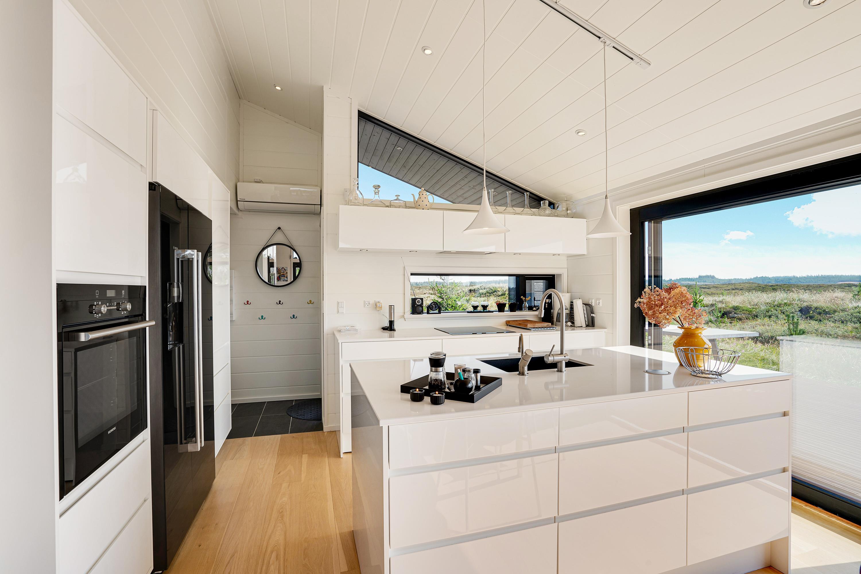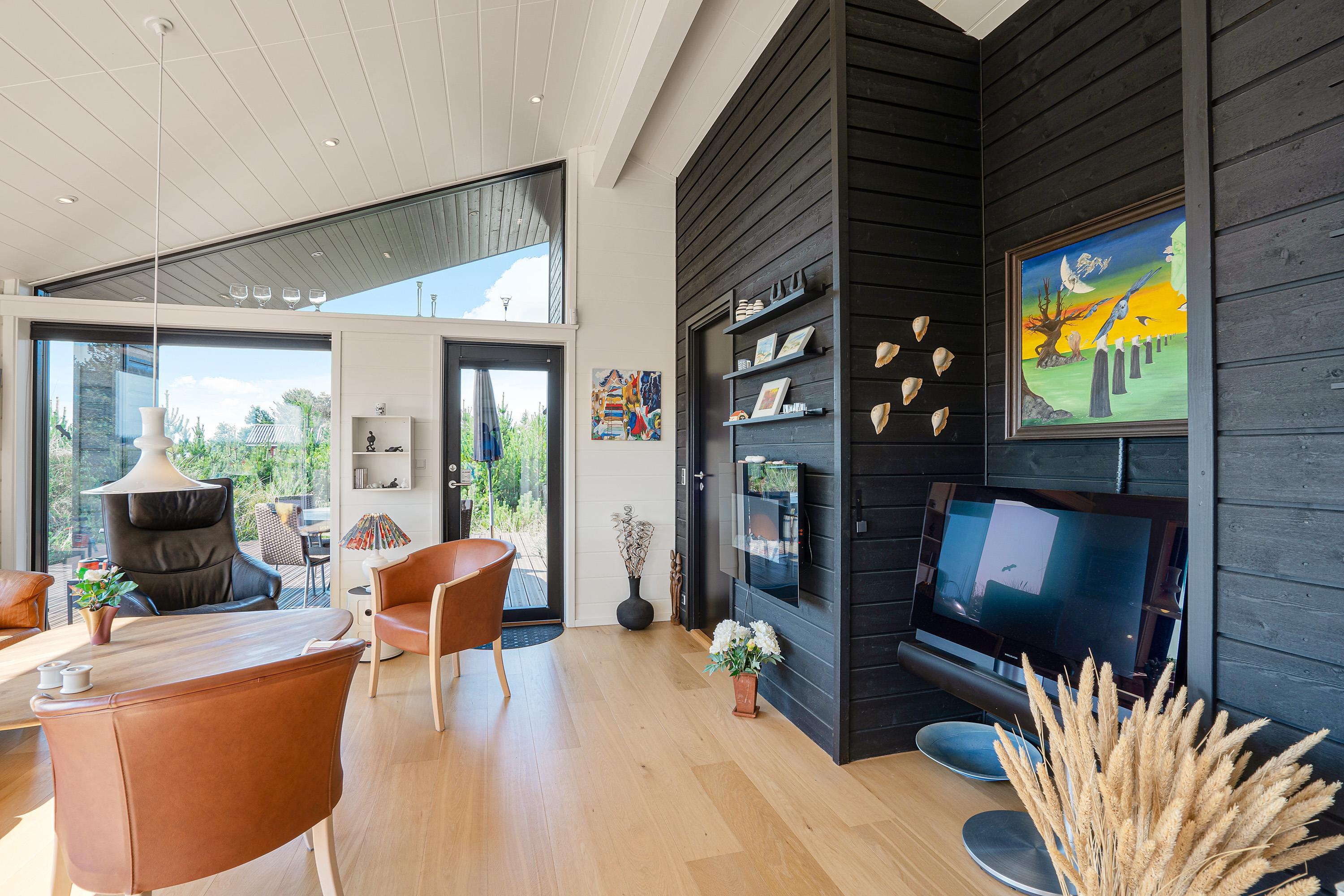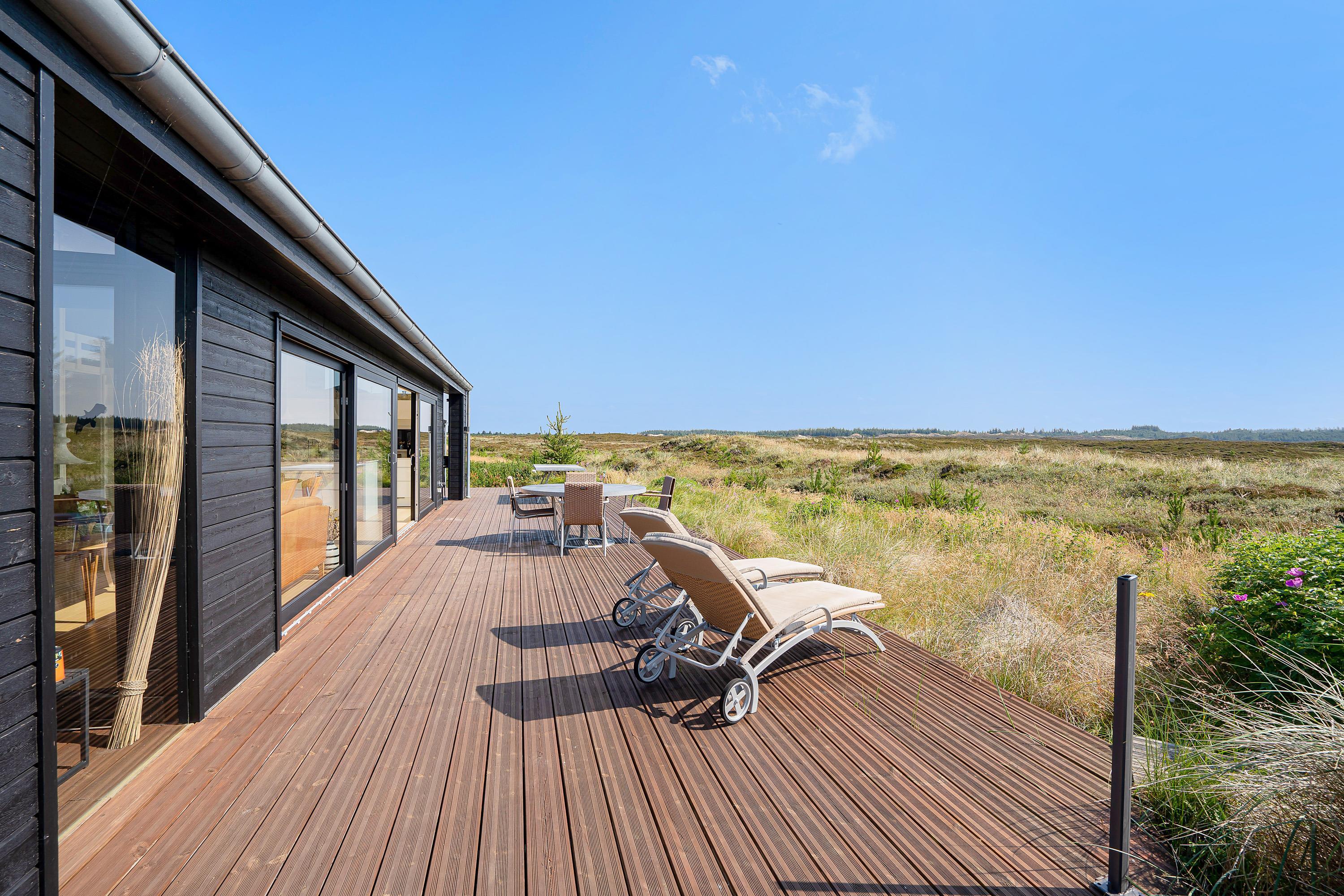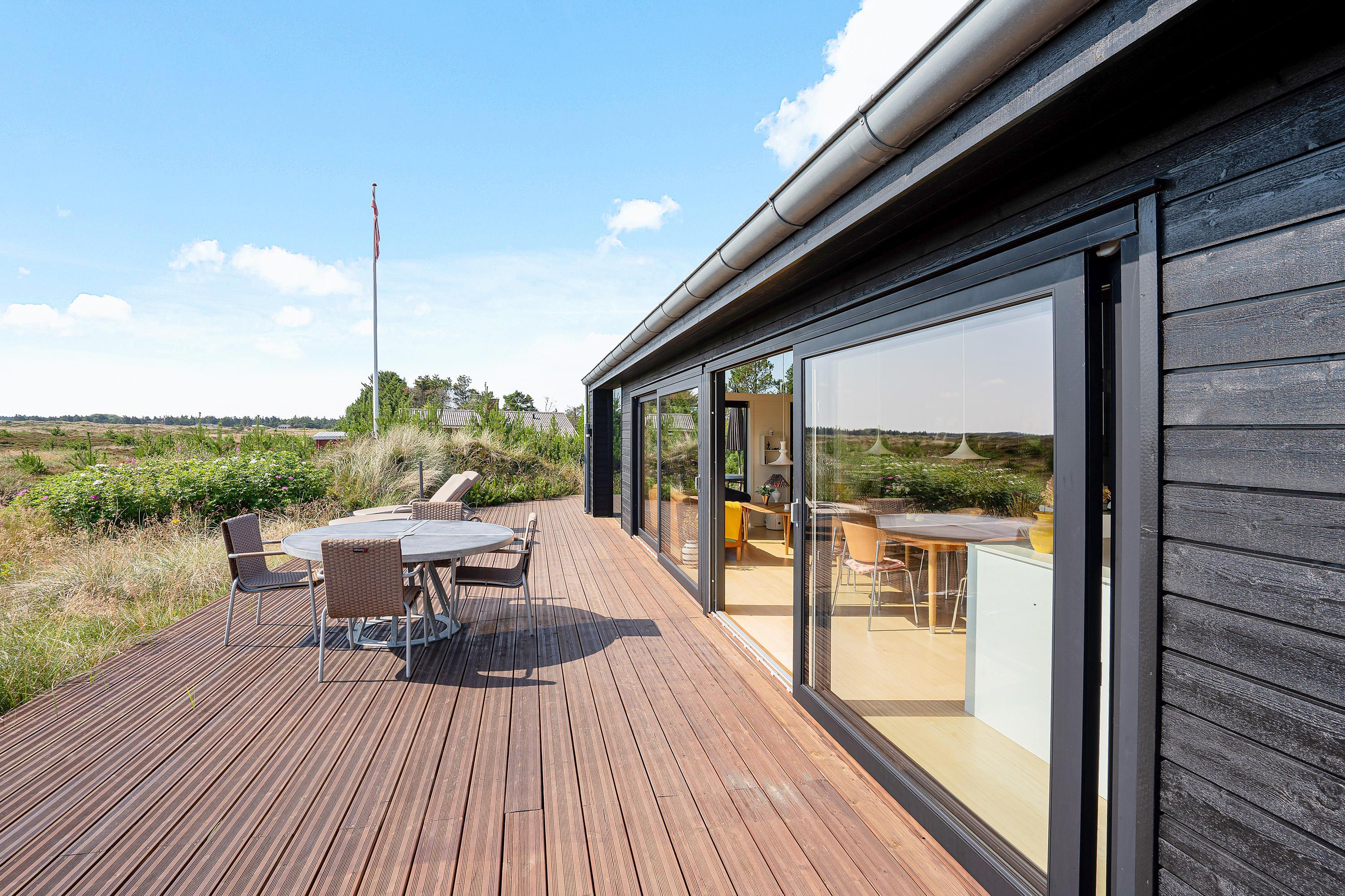 Køkken, stue og spisestue er ét stort rum, så I stadig kan være sammen, selvom nogle er i køkkenet og andre slapper af på sofaen. Derfra er der direkte adgang til terrassen, hvor I kan nyde morgensolen. Den vidunderlige udsigt over det store lyngområde kan både nydes fra terrassen og inde fra feriehuset.