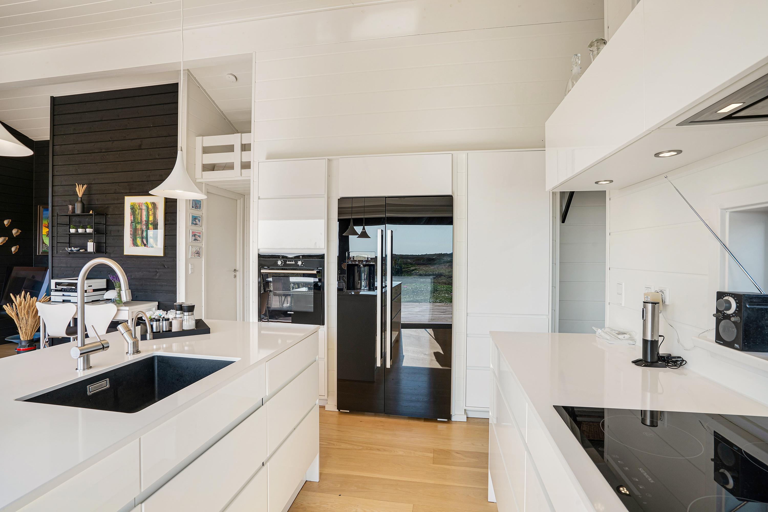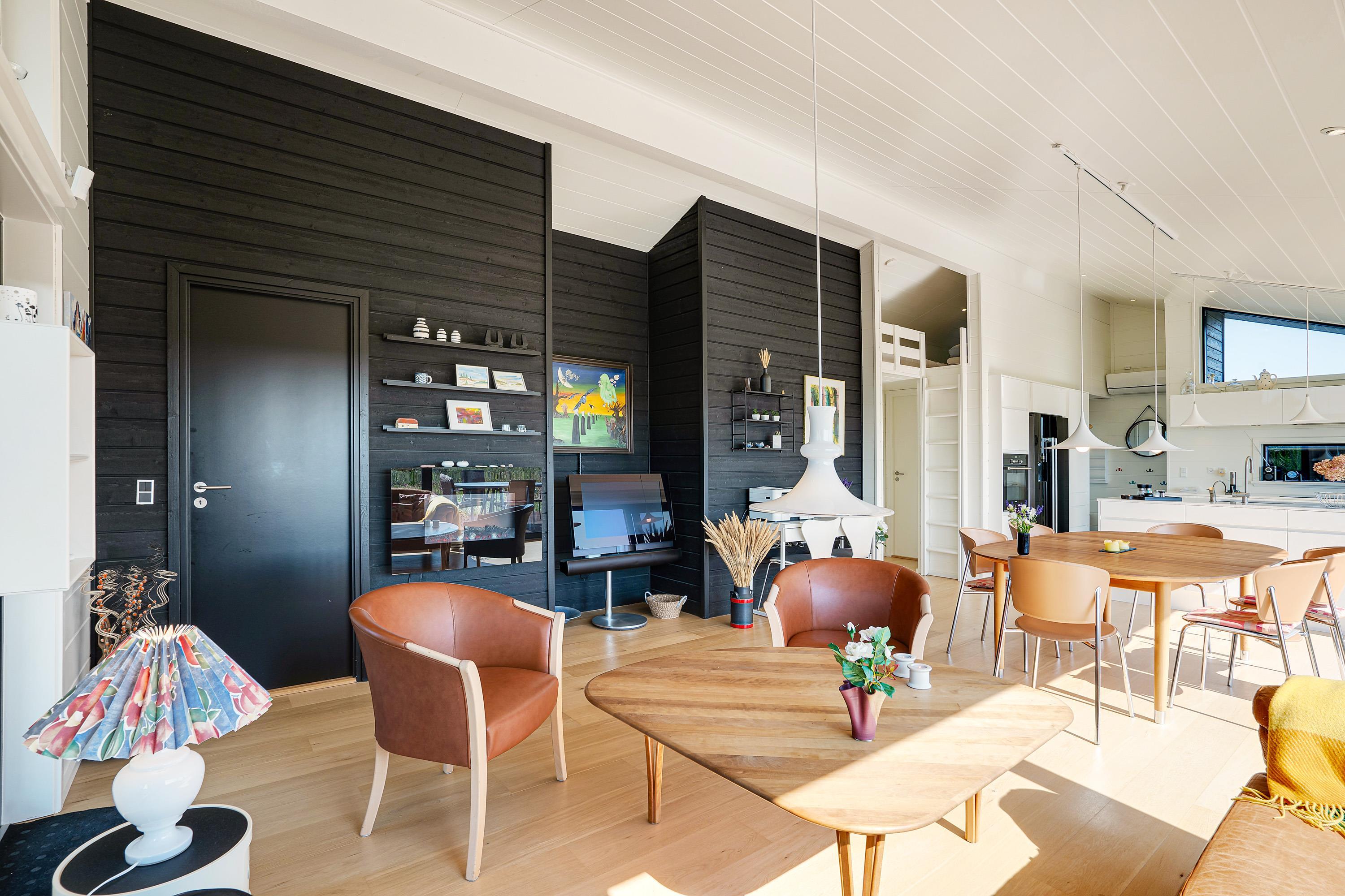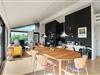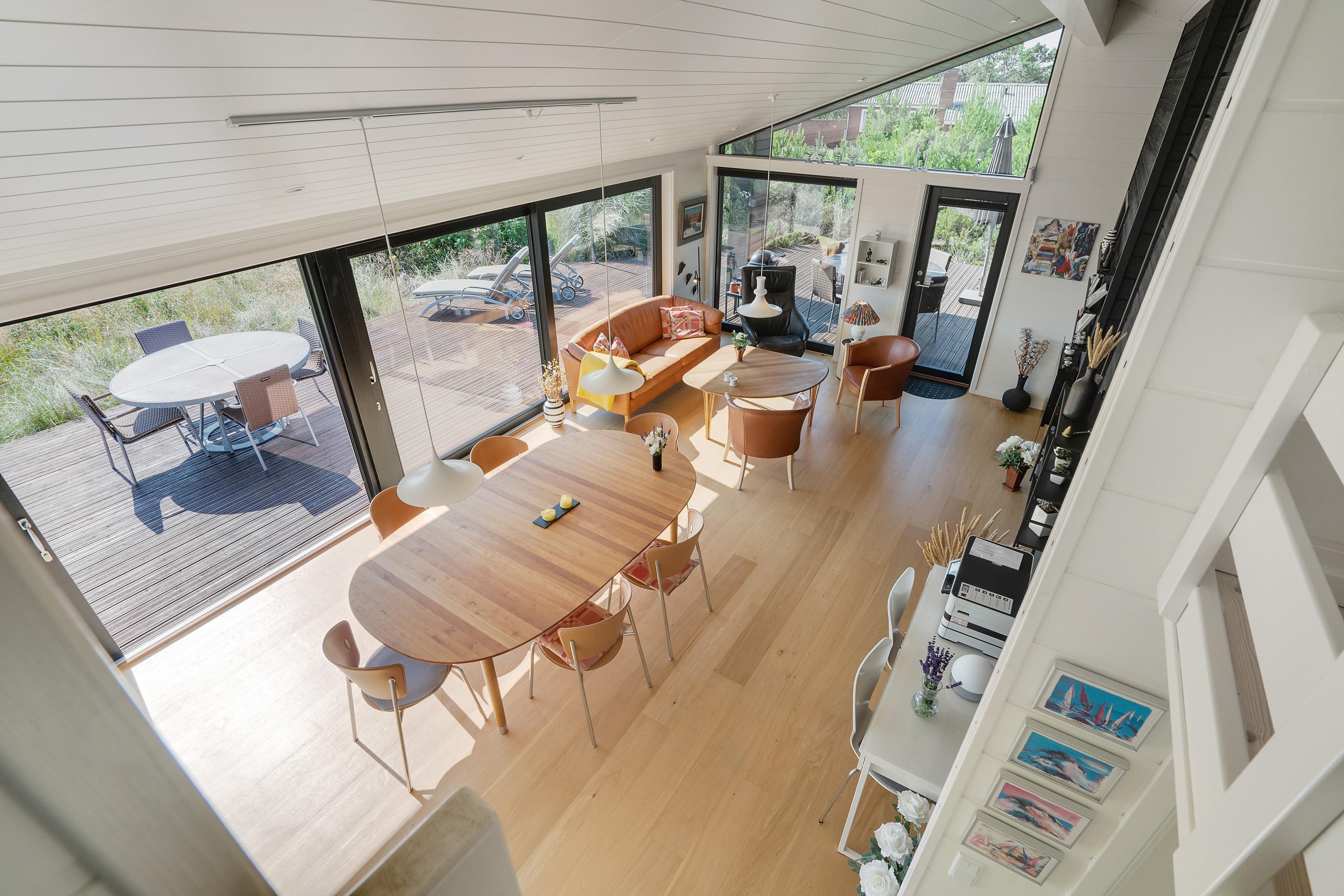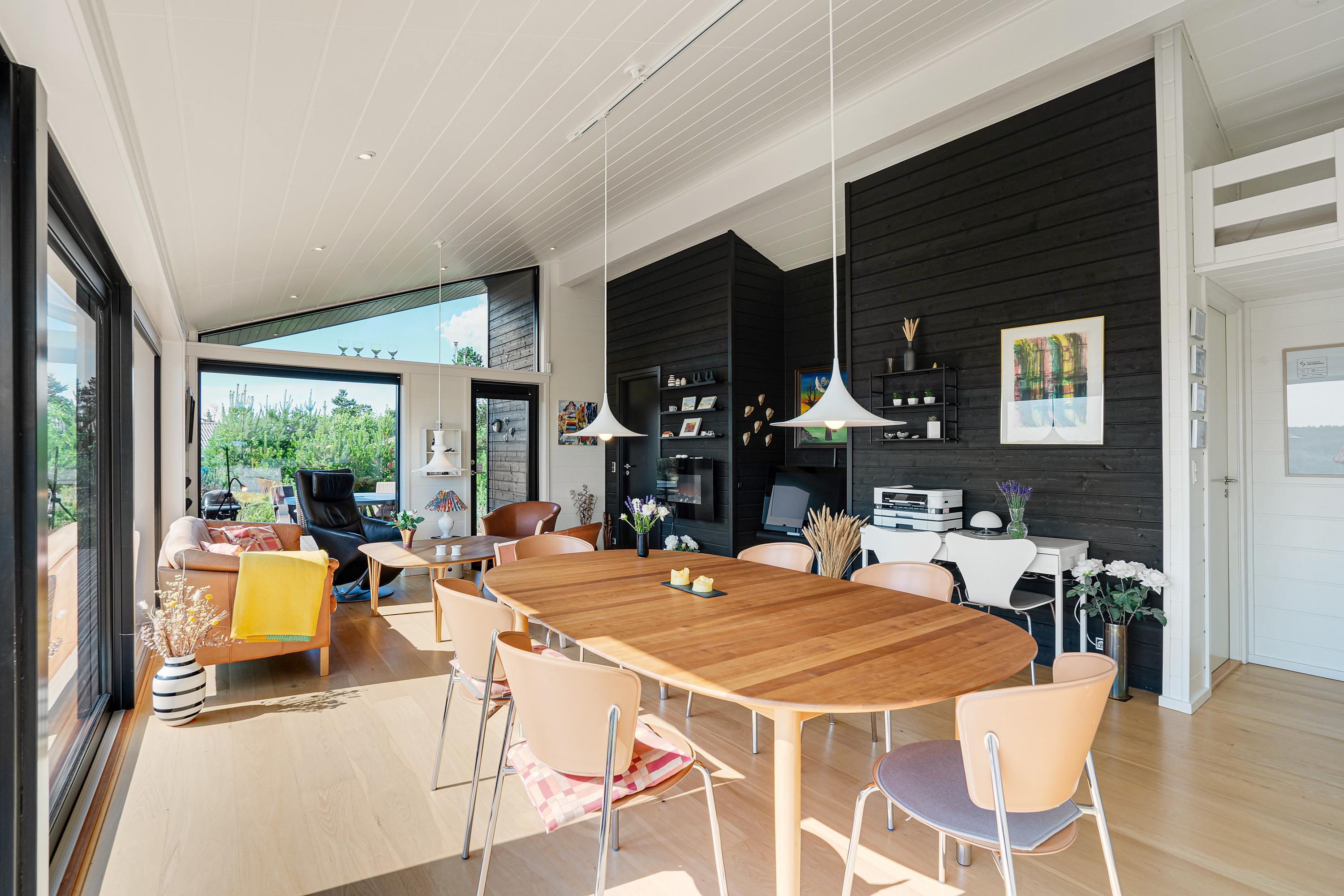 Køkken, stue og spisestue er ét stort rum, så I stadig kan være sammen, selvom nogle er i køkkenet og andre slapper af på sofaen. Derfra er der direkte adgang til terrassen, hvor I kan nyde morgensolen. Den vidunderlige udsigt over det store lyngområde kan både nydes fra terrassen og inde fra feriehuset.