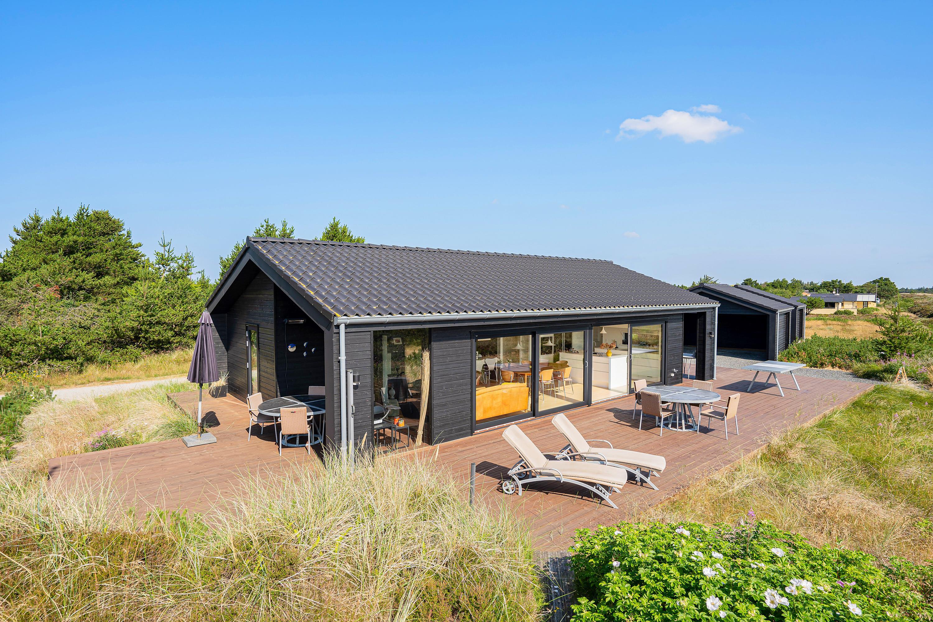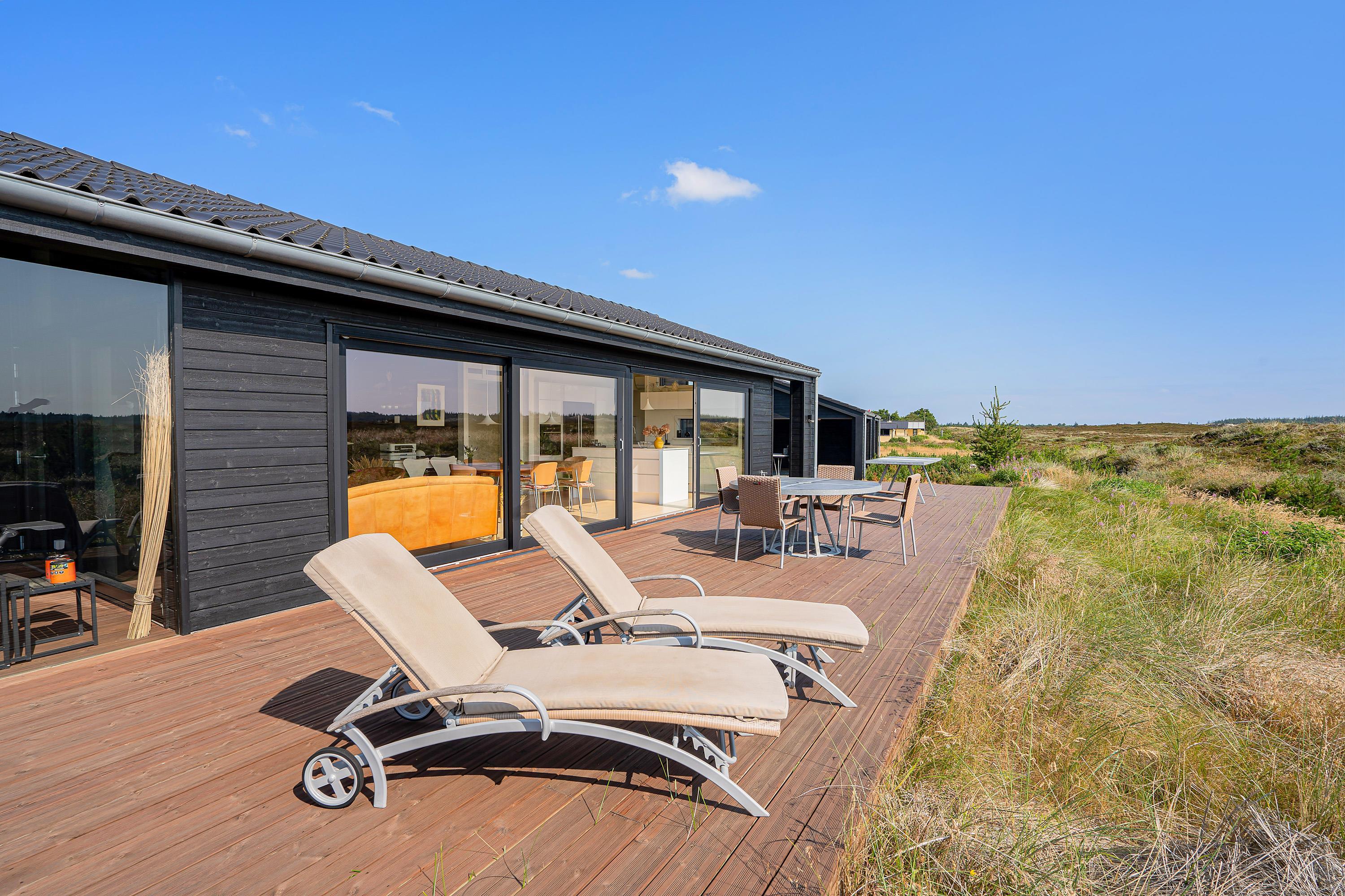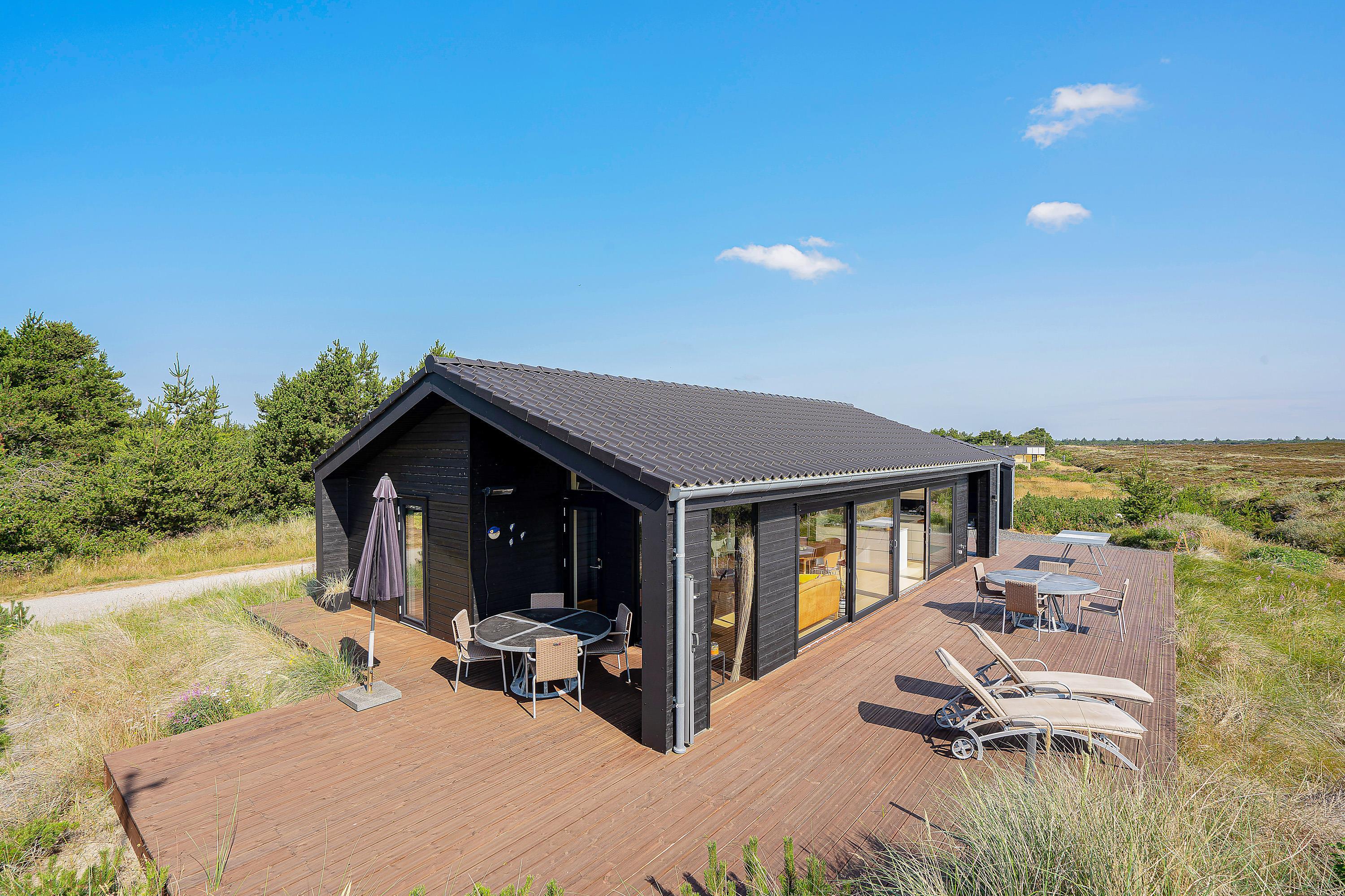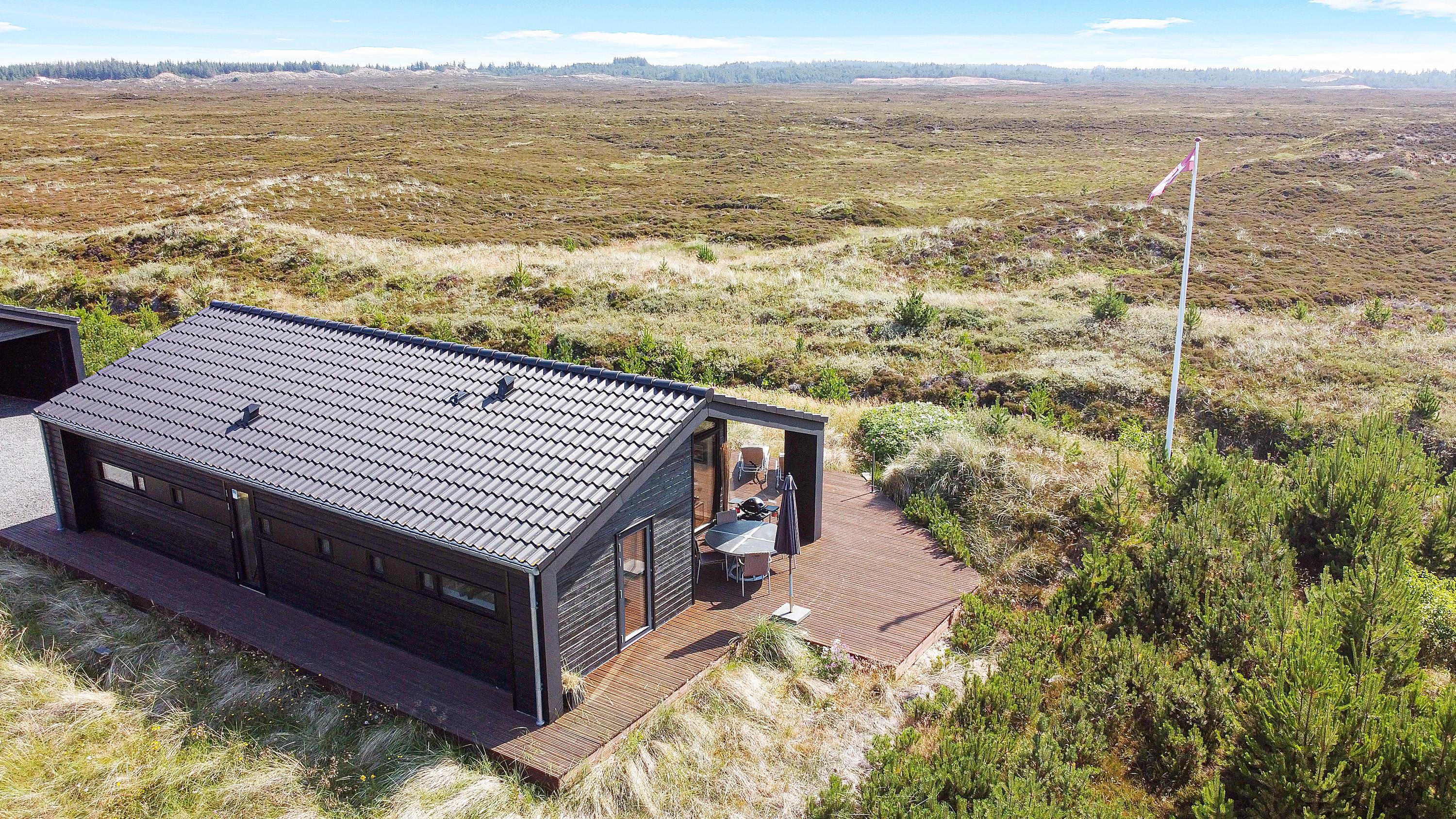 I den skønne badeby Henne Strand finder I på Gøgevej 34 dette moderne sommerhus med plads til 6 personer. Herfra er der ikke langt til hverken stranden eller butikkerne, for det hele er i gåafstand fra adressen. Samtidig er der heller ikke langt til det skønne hedeområde, for det starter allerede lige udenfor jeres dør. De store vinduer fra køkkenalrummet har en vidunderlig udsigt over det store åbne område, og i horisonten er der blot træer og skov.