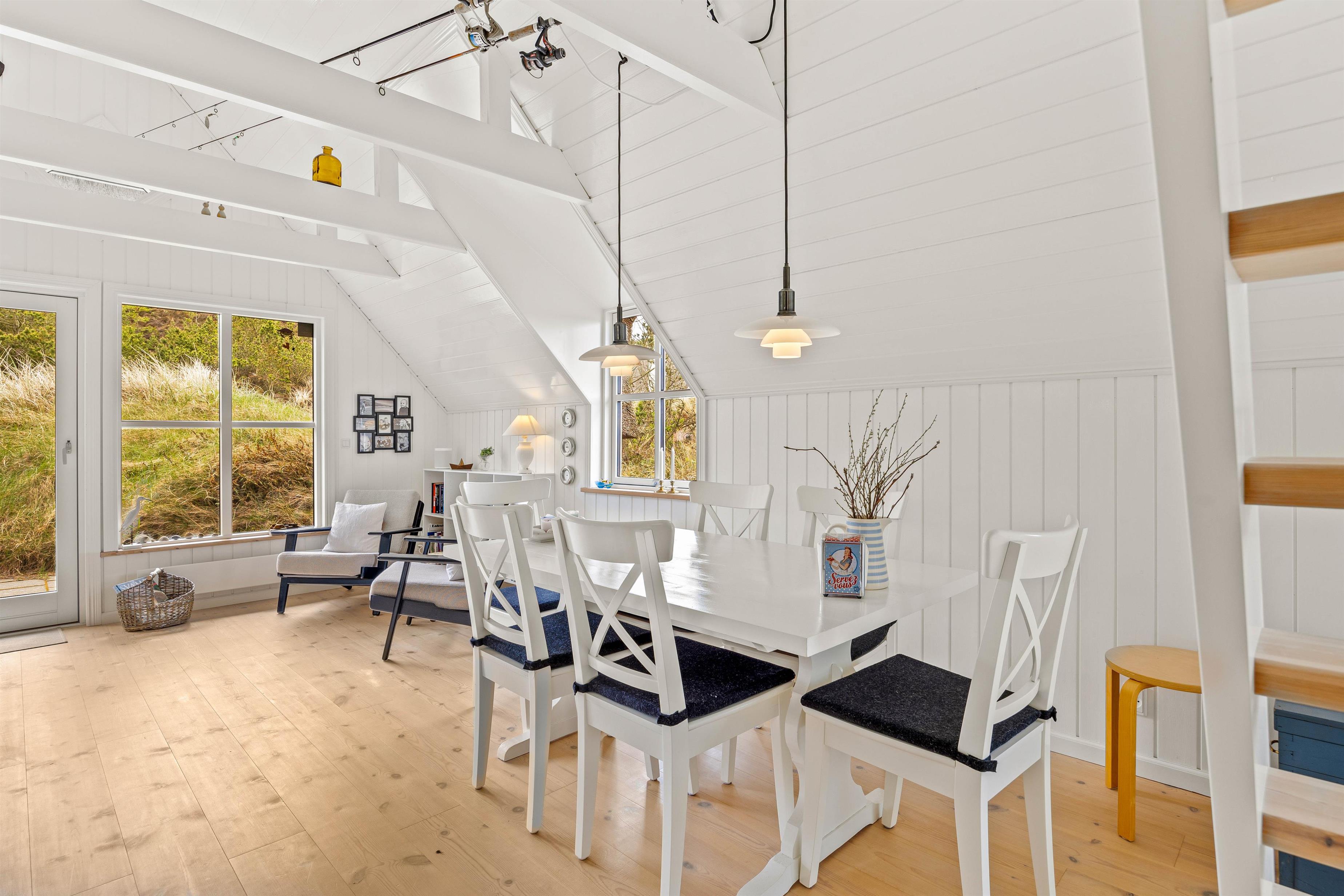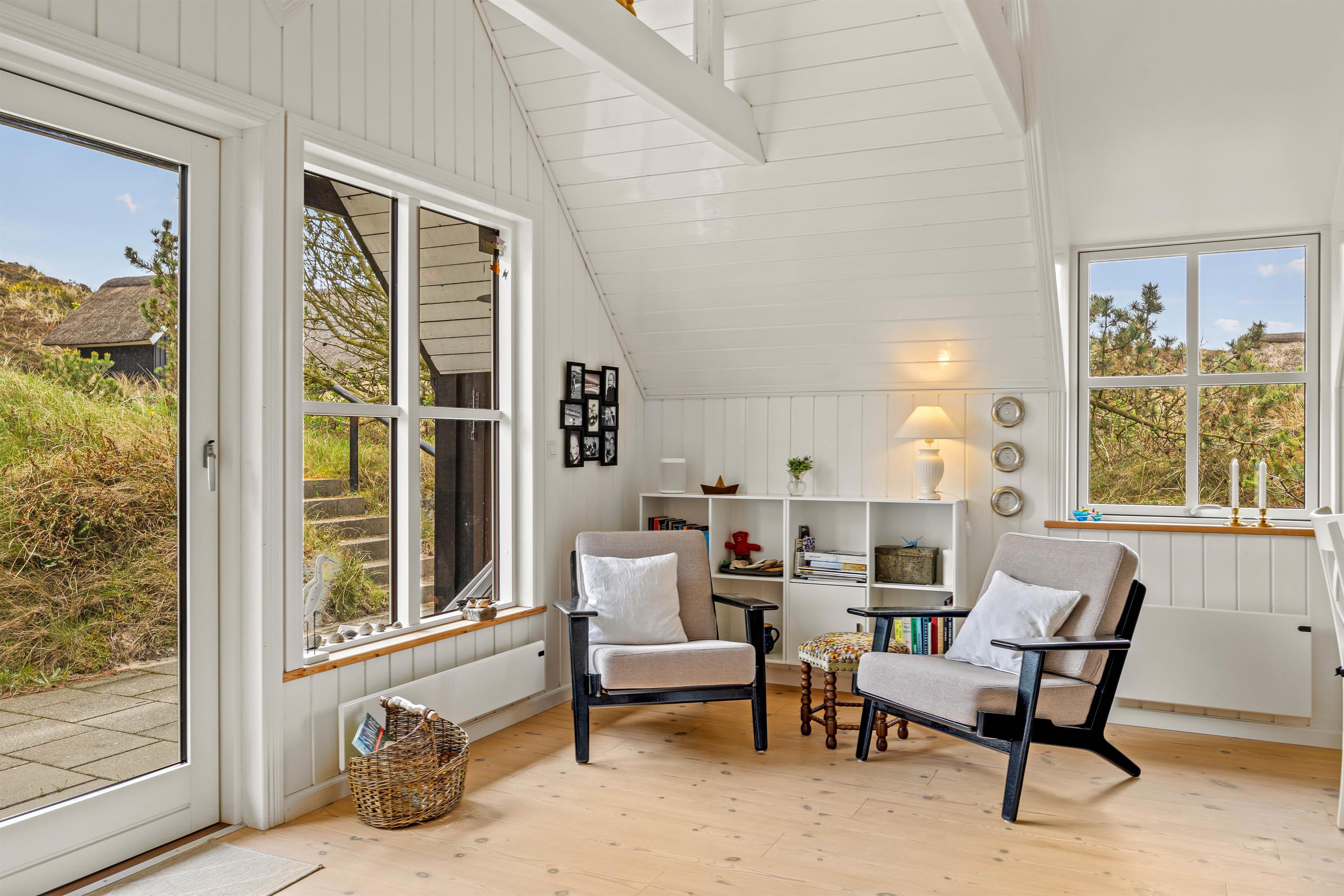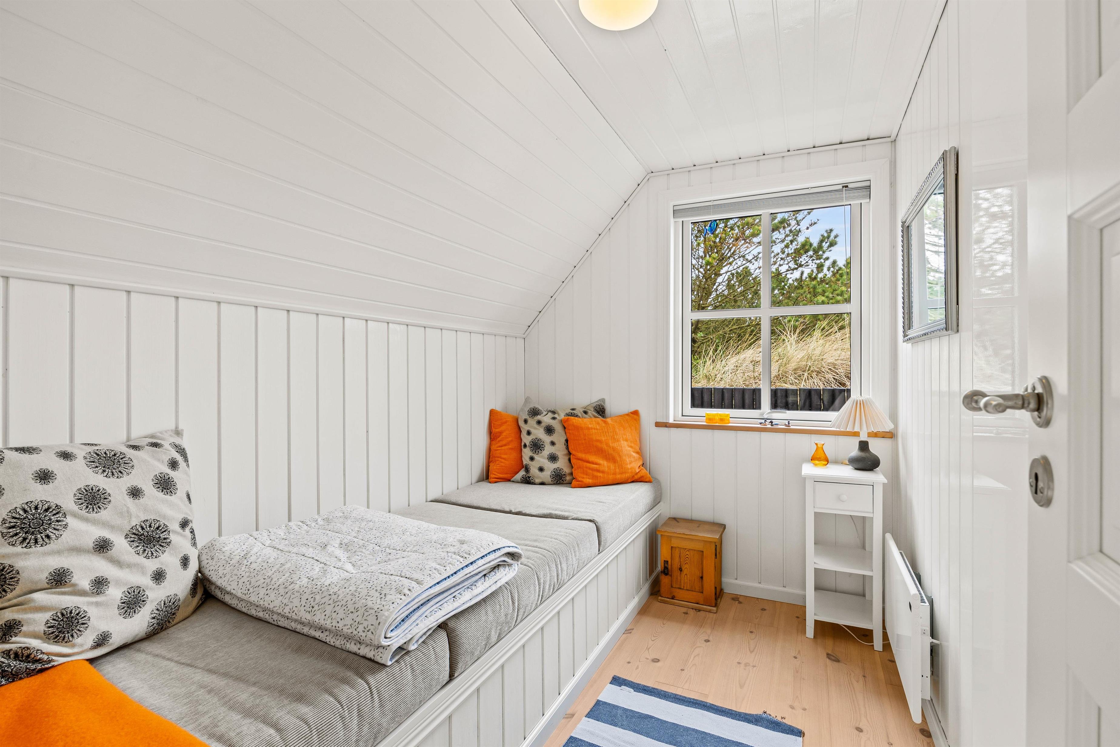 Dette dejlige sommerhus på 59m2 er indrettet yderst praktisk, lyst og med de mange detaljer, kan det ikke undgås, at I under hele jeres ophold vil blive mindet om, at I bor tæt på Vesterhavet. De store vinduer i stuen giver det skønneste lysindfald, også til spisestuen og det veludstyrede køkken. De 3 sovepladser, som dette sommerhus rummer, er fordelt over en dobbeltseng i det ene soveværelse og en enkelseng i det andet soveværelse. Begge soveværelser indeholder et rummeligt højskab til den medbragte garderobe. En trappe i stueetagen fører jer op på hemsen.