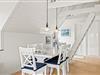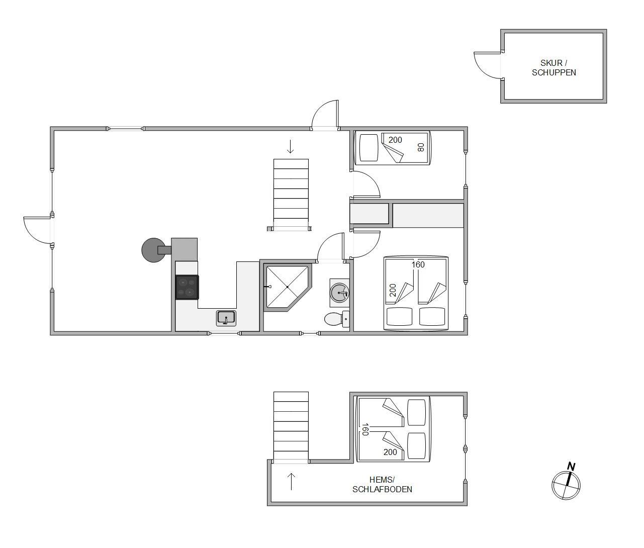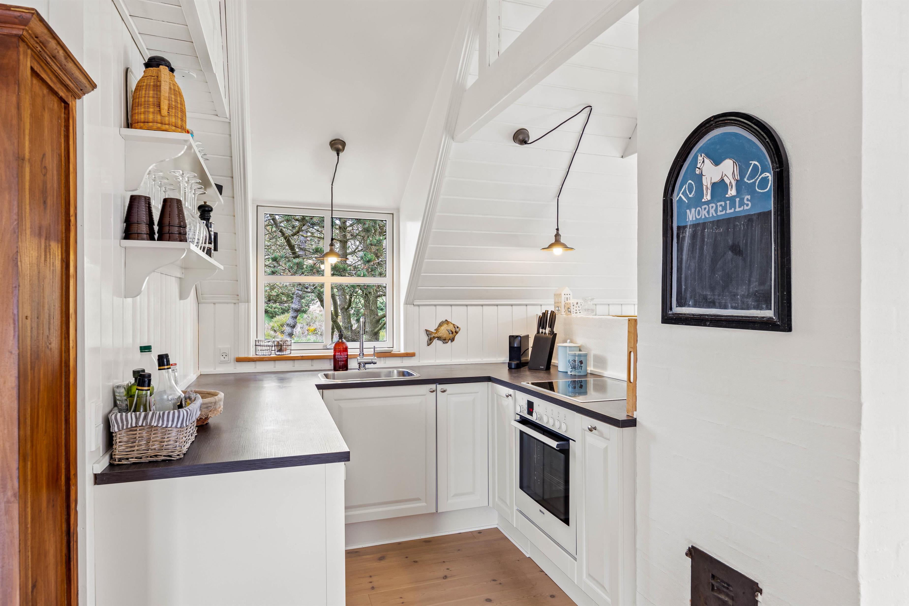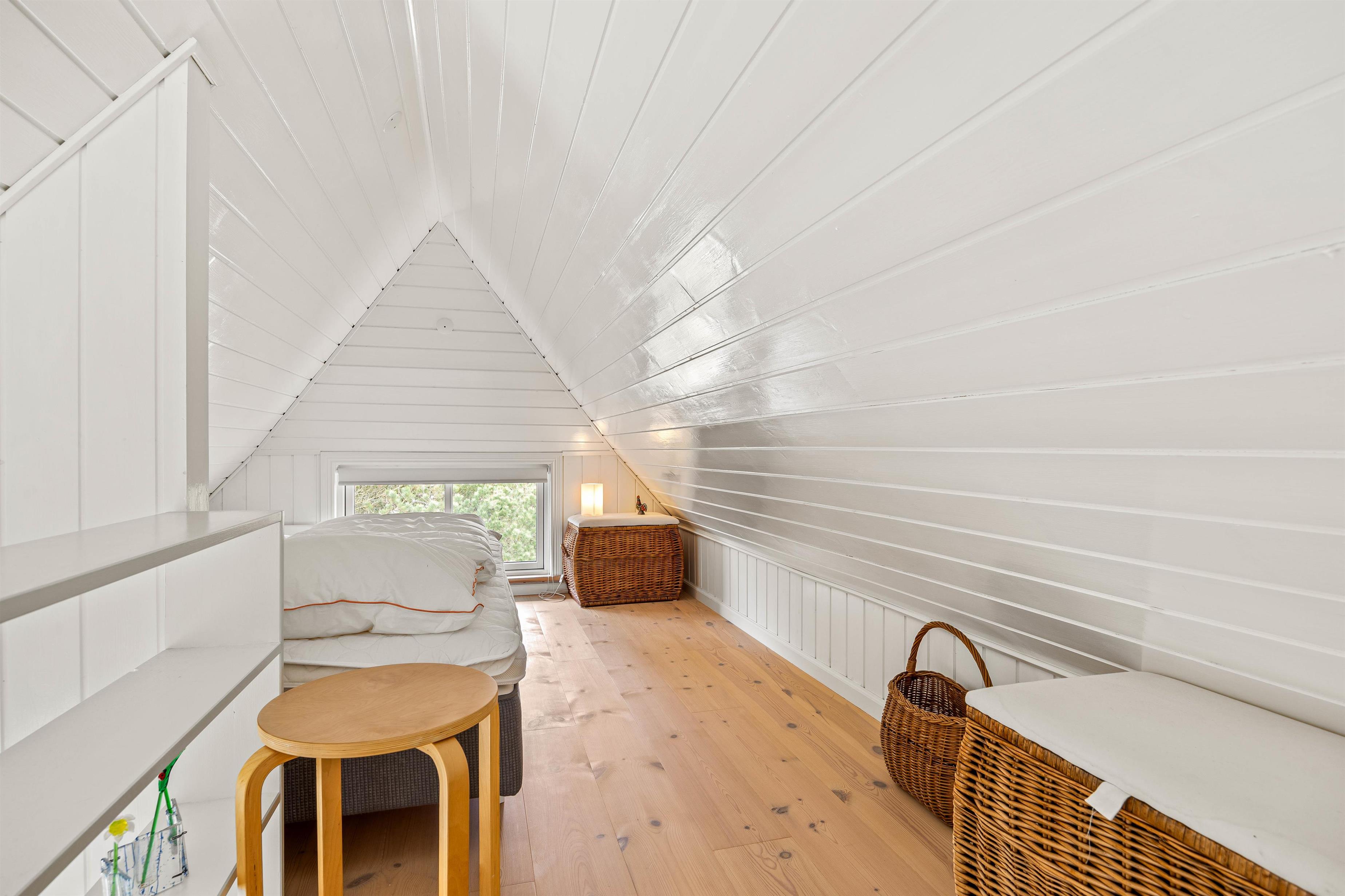 Dette dejlige sommerhus på 59m2 er indrettet yderst praktisk, lyst og med de mange detaljer, kan det ikke undgås, at I under hele jeres ophold vil blive mindet om, at I bor tæt på Vesterhavet. De store vinduer i stuen giver det skønneste lysindfald, også til spisestuen og det veludstyrede køkken. De 3 sovepladser, som dette sommerhus rummer, er fordelt over en dobbeltseng i det ene soveværelse og en enkelseng i det andet soveværelse. Begge soveværelser indeholder et rummeligt højskab til den medbragte garderobe. En trappe i stueetagen fører jer op på hemsen.