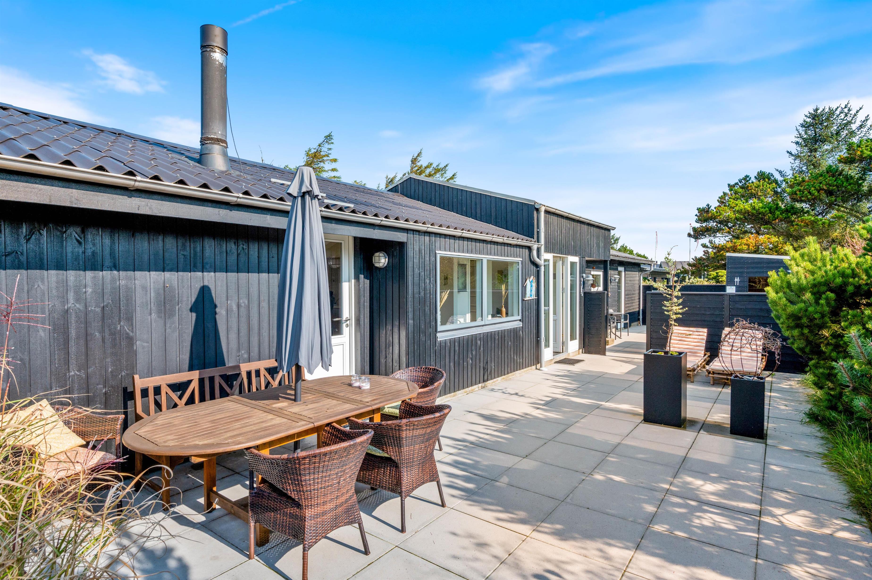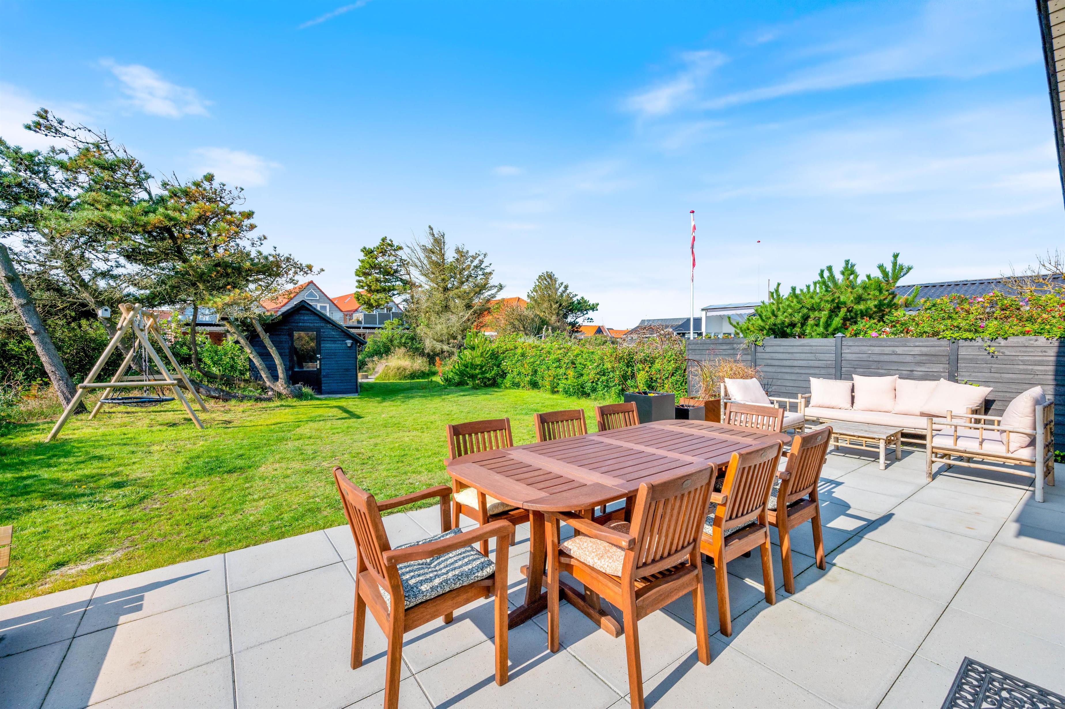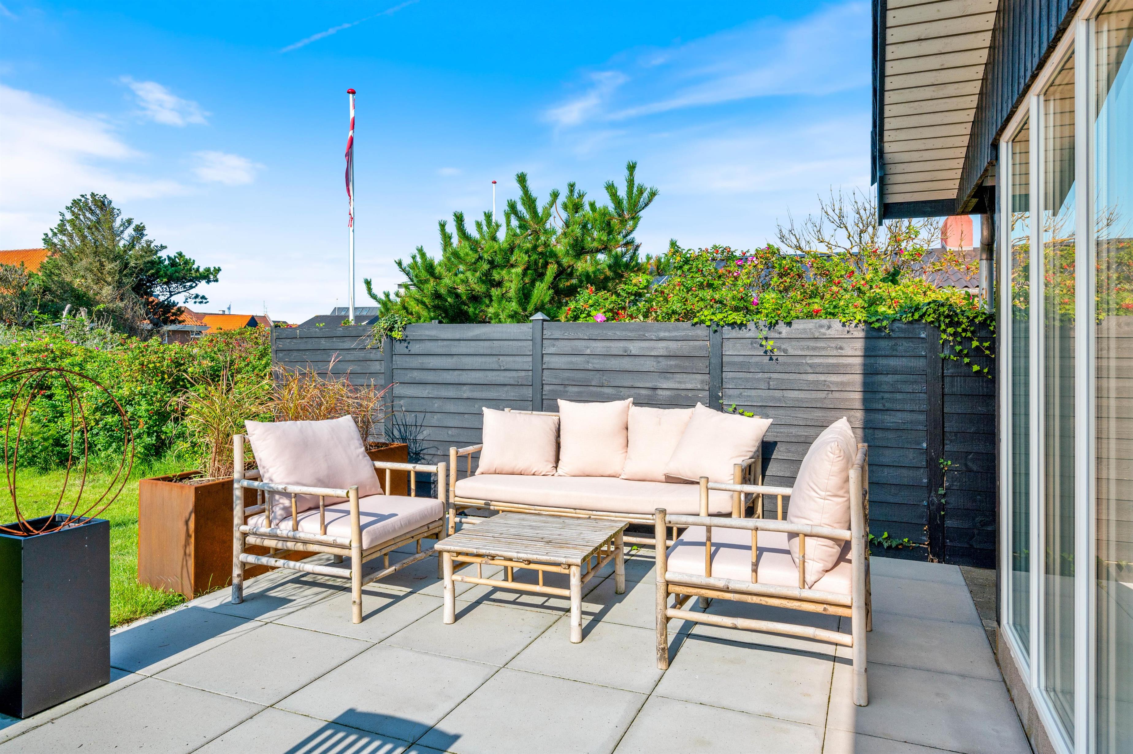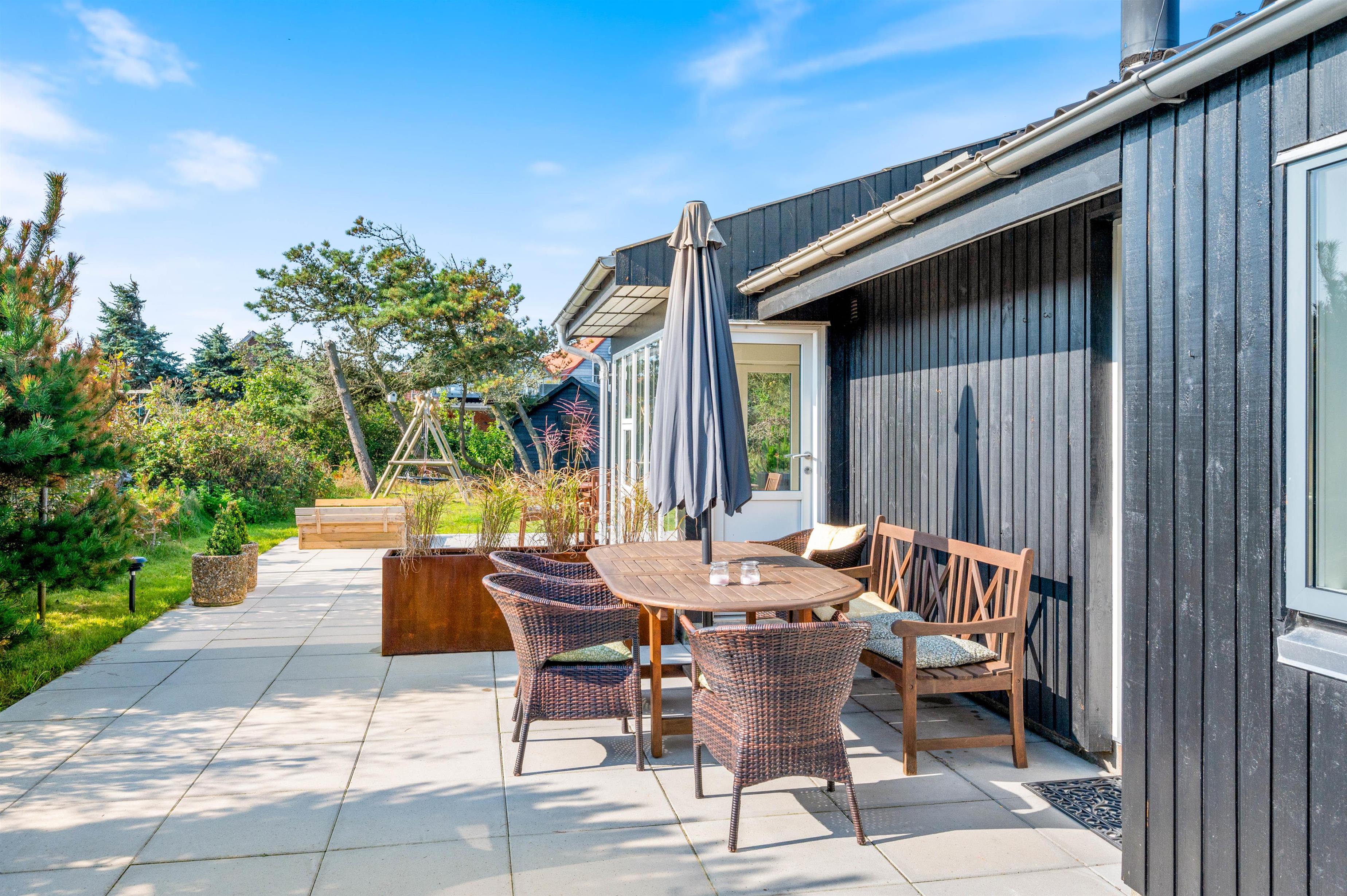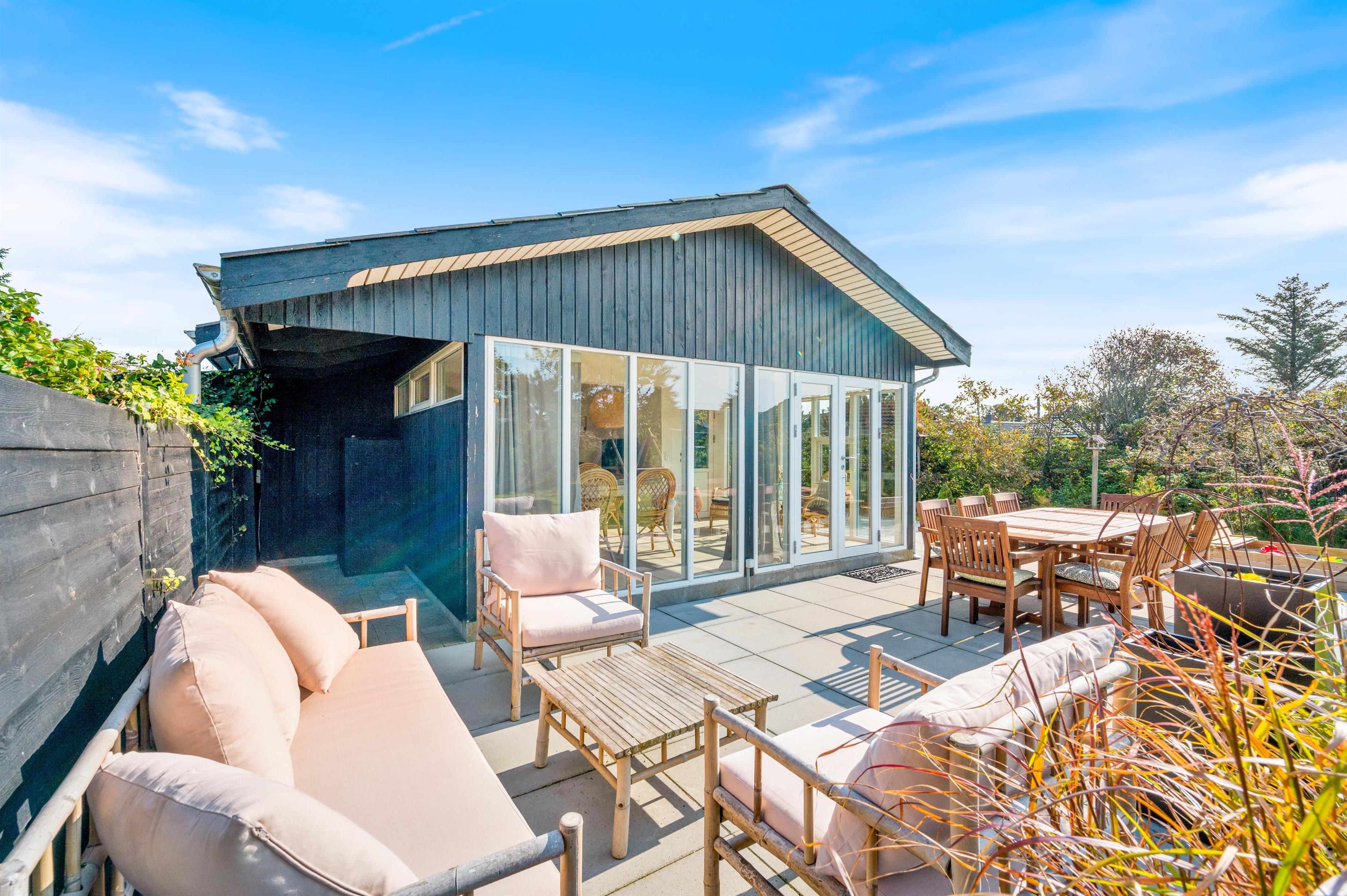 Fra sommerhusets alrum kan I træde ud på sommerhusets skønne, delvist afskærmet terrasse. Her har I både havemøbler og liggestole til rådighed, som I kan sætte jer godt til rette i på en plads i solen. På terrassen kan I også samles til aftensmaden, som I kan tilberede på grillen.