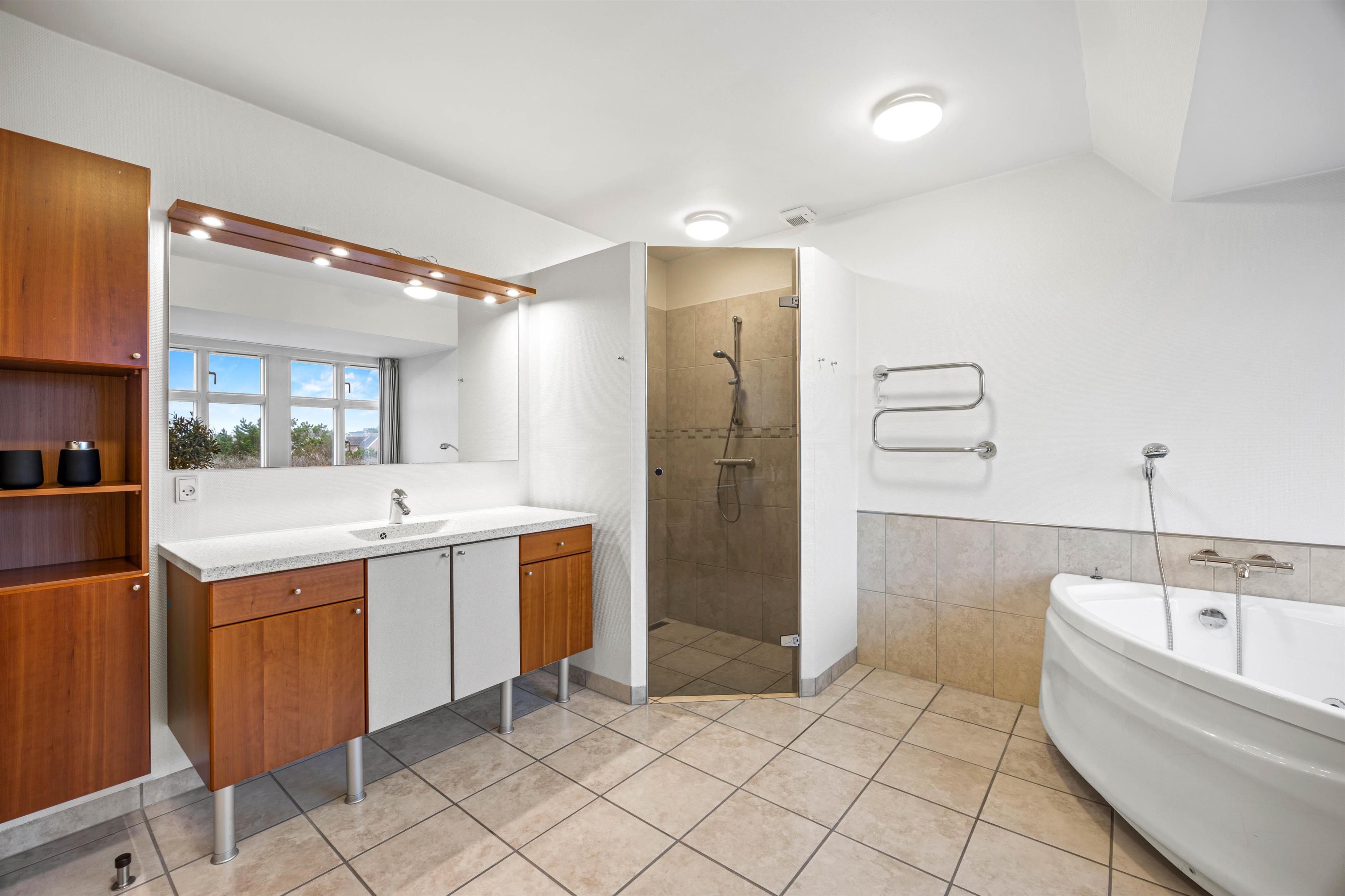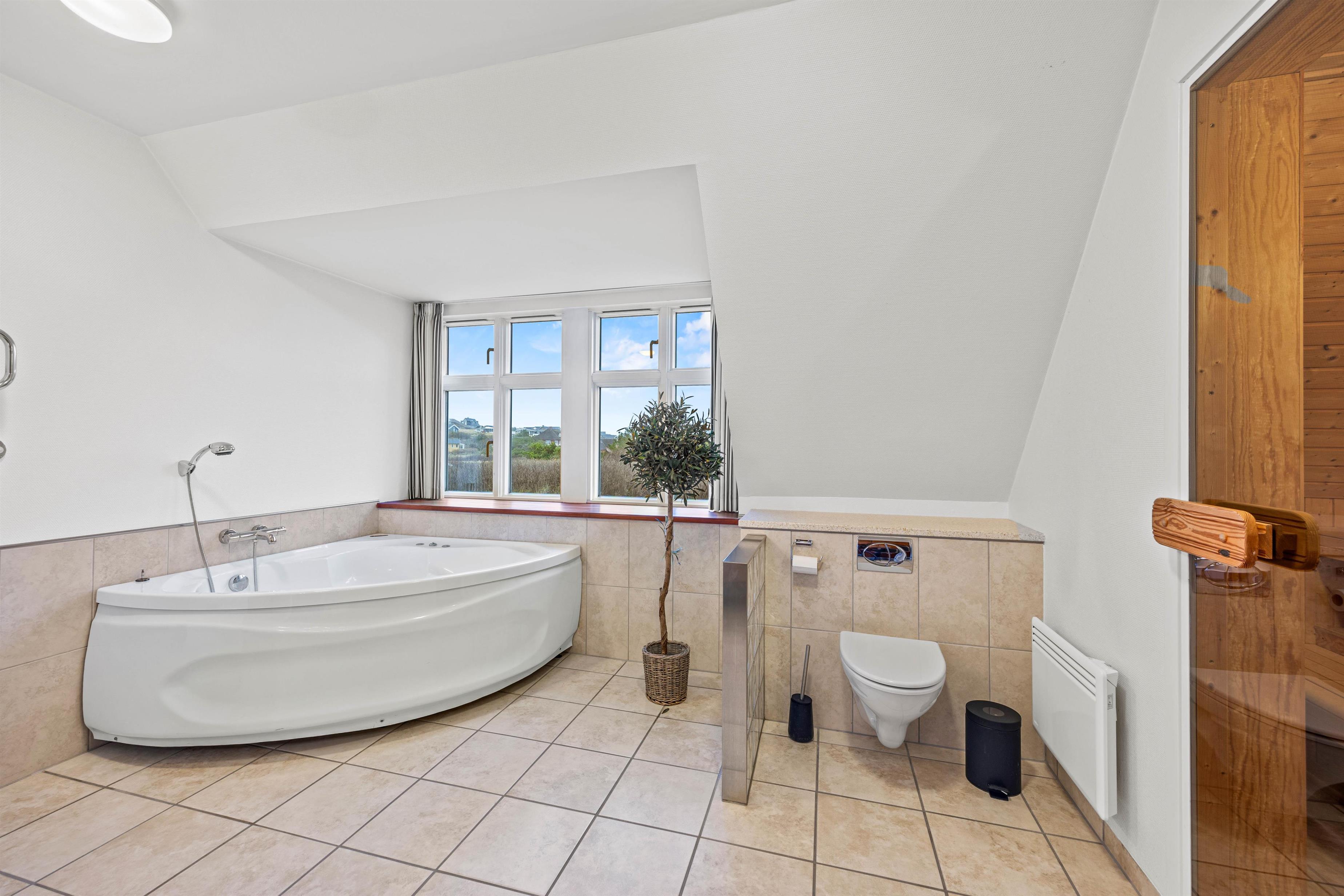 Feriehjemmets to badeværelser er begge smagfuldt indrettet og udstyret med både WC og brusebad. I det største finder I også en sauna og et spabad - jeres helt egen lille wellnessoase efter en lang dag ved det brusende Vesterhav.