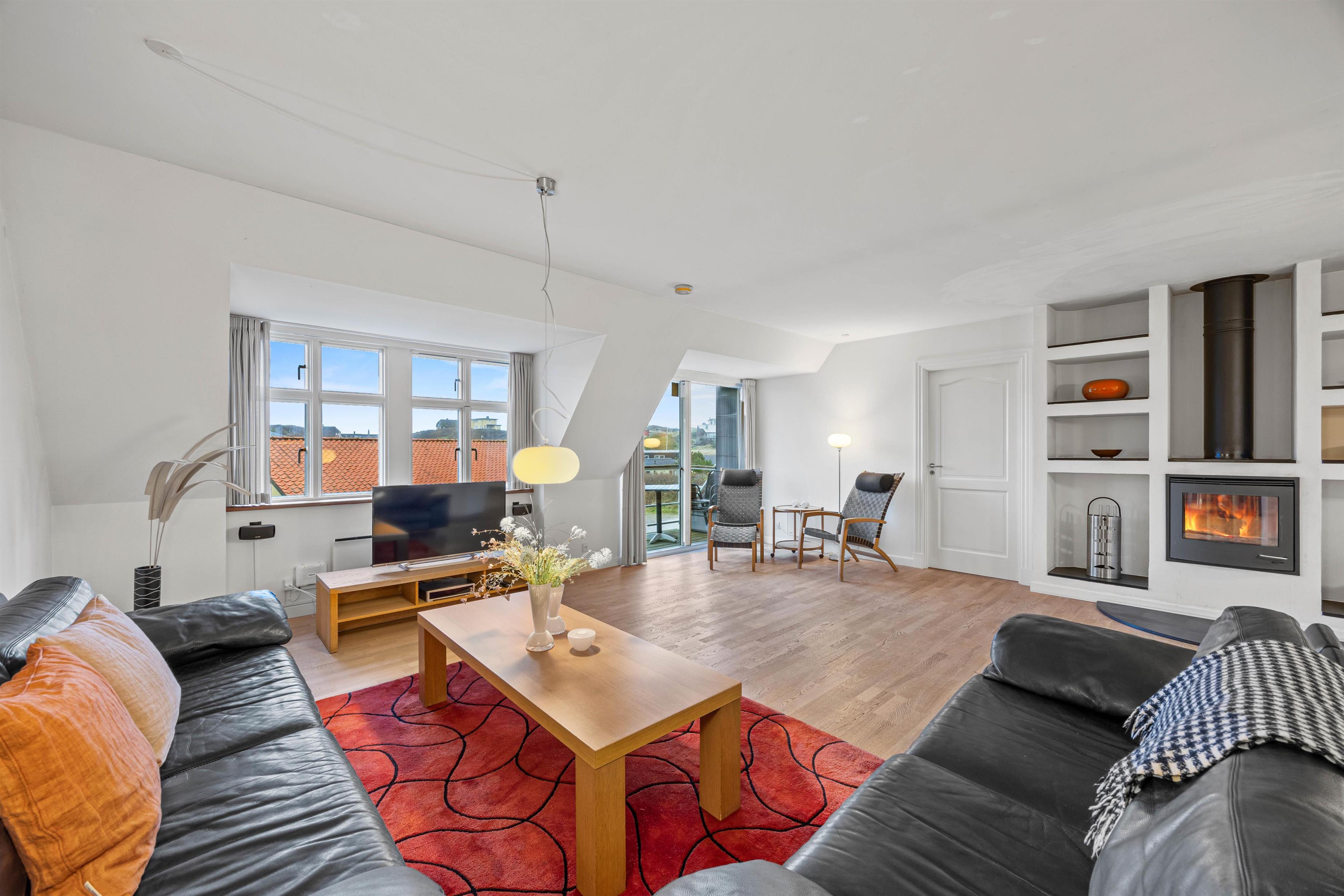 Denne store og flotte ferielejlighed ligger i hjertet af Henne Strand på Strandvejen 456 C. Med til lejligheden hører en fin tagterrasse med god udsigt ud over den lille ferieby, og derudover får I både en fantastisk beliggenhed midt i centrum og tæt på stranden samt en lækker indretning med både sauna og spabad.