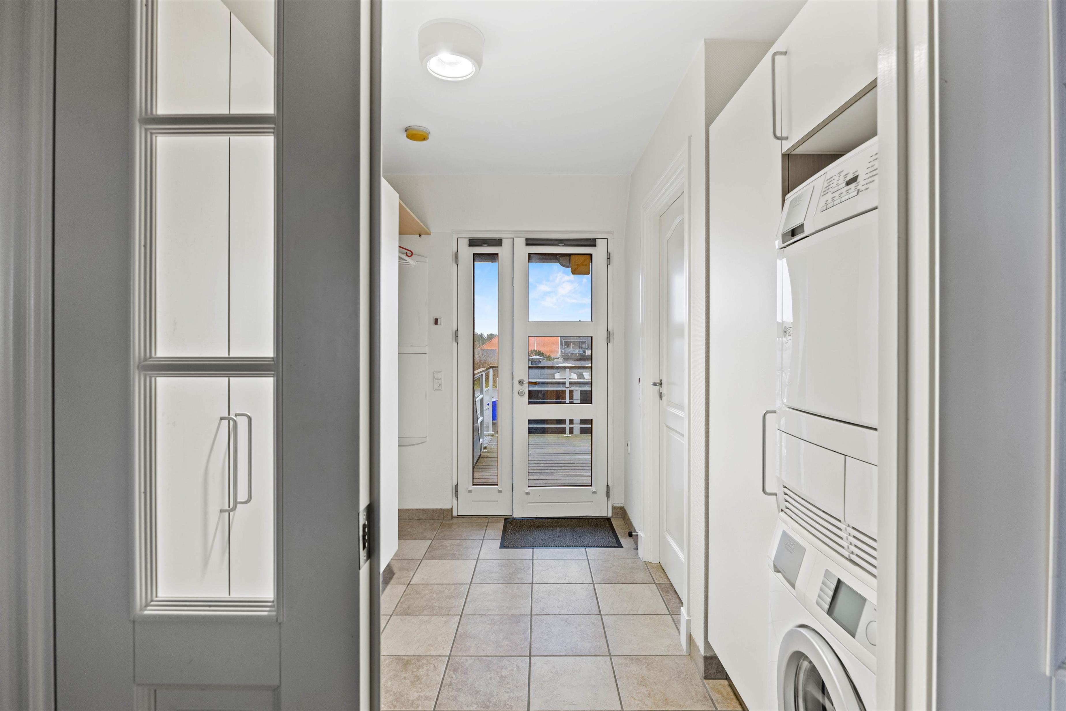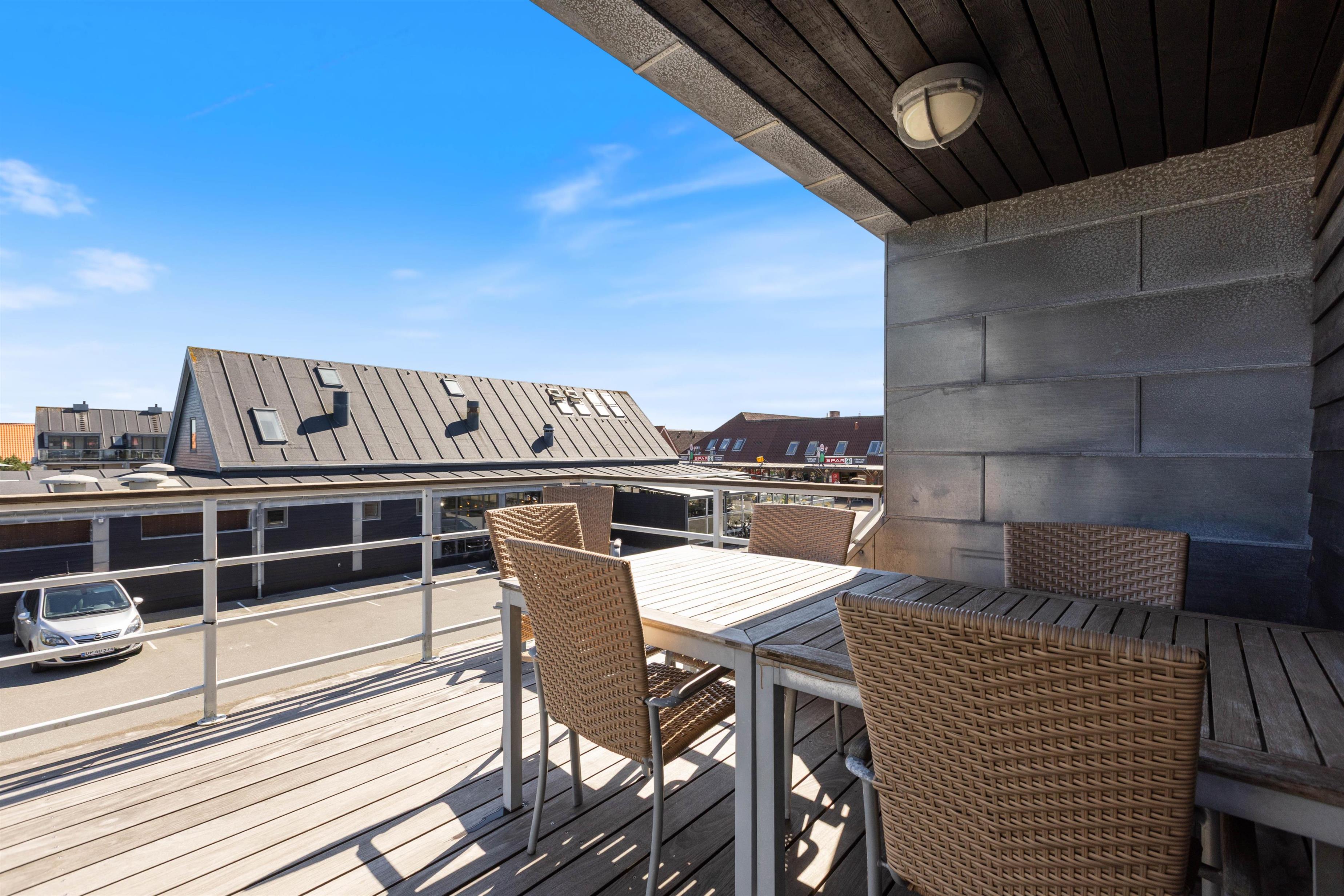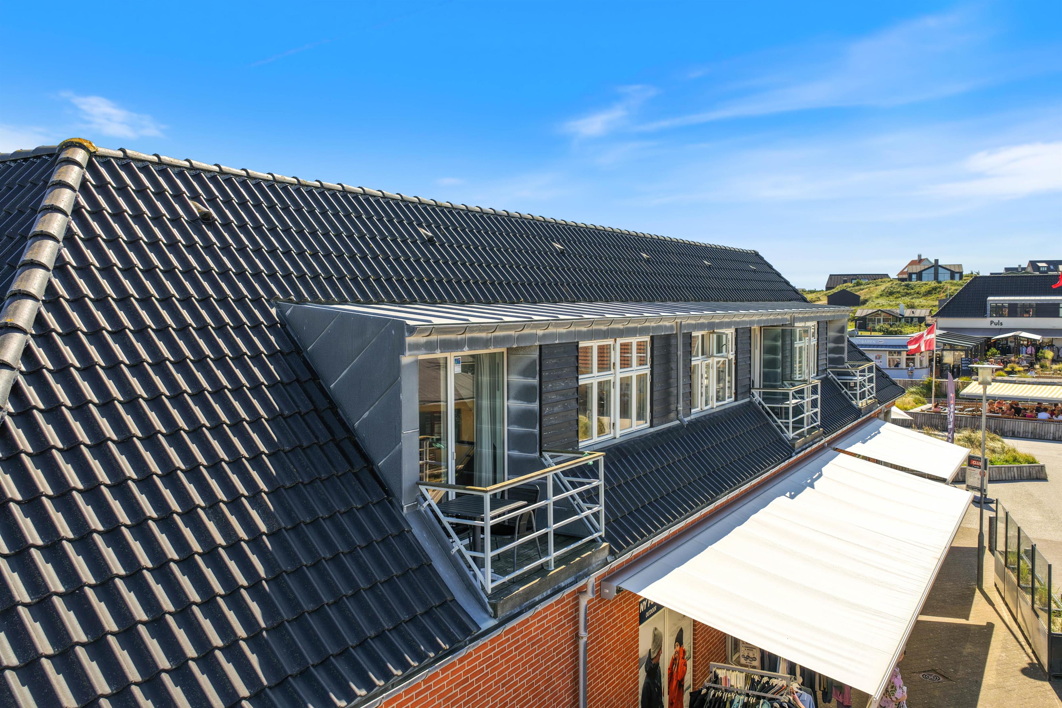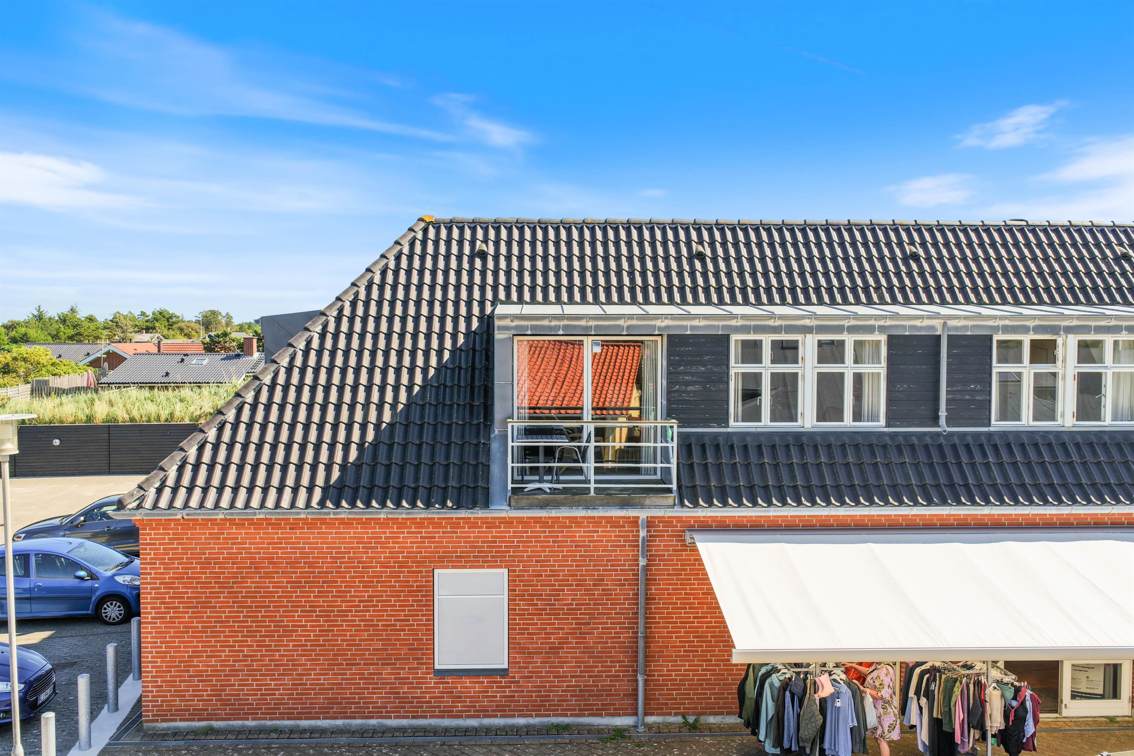 Fra den lille tagterrasse, der hører til lejligheden, har I udsigt ud over Henne Strands hyggelige indkøbsgade og med en fantastisk beliggenhed midt i centrum, skal I blot træde ud ad døren for at være fremme. Den lille ferieby byder på masser af god atmosfære, feriestemning og forretninger og caféer i massevis.
