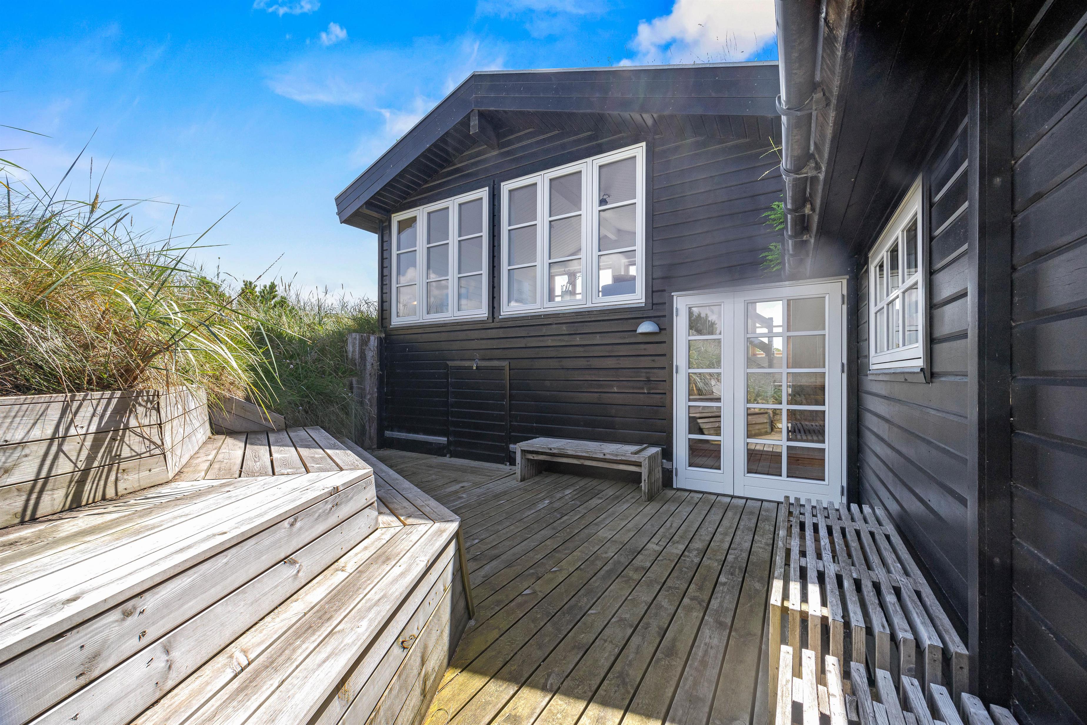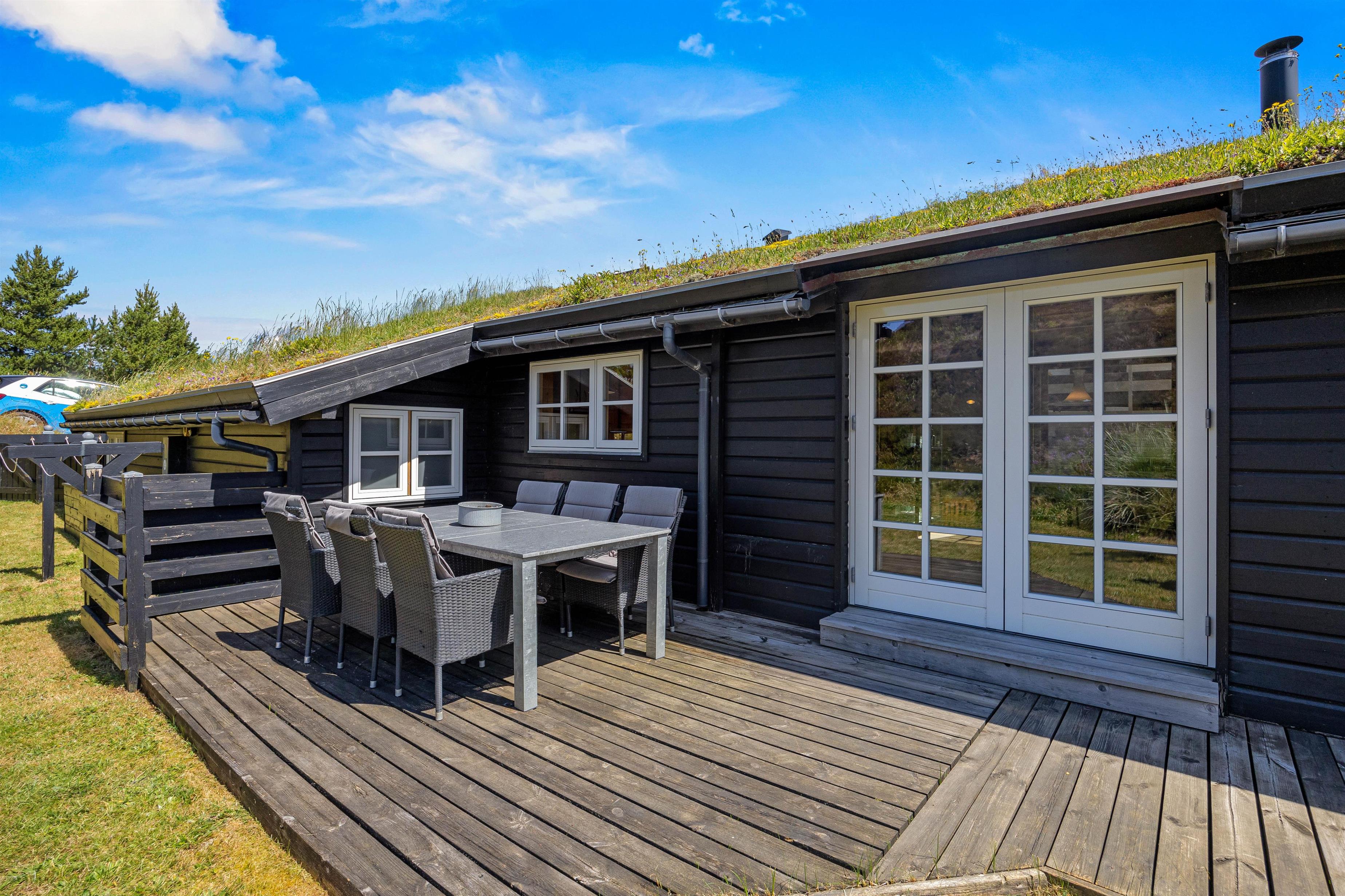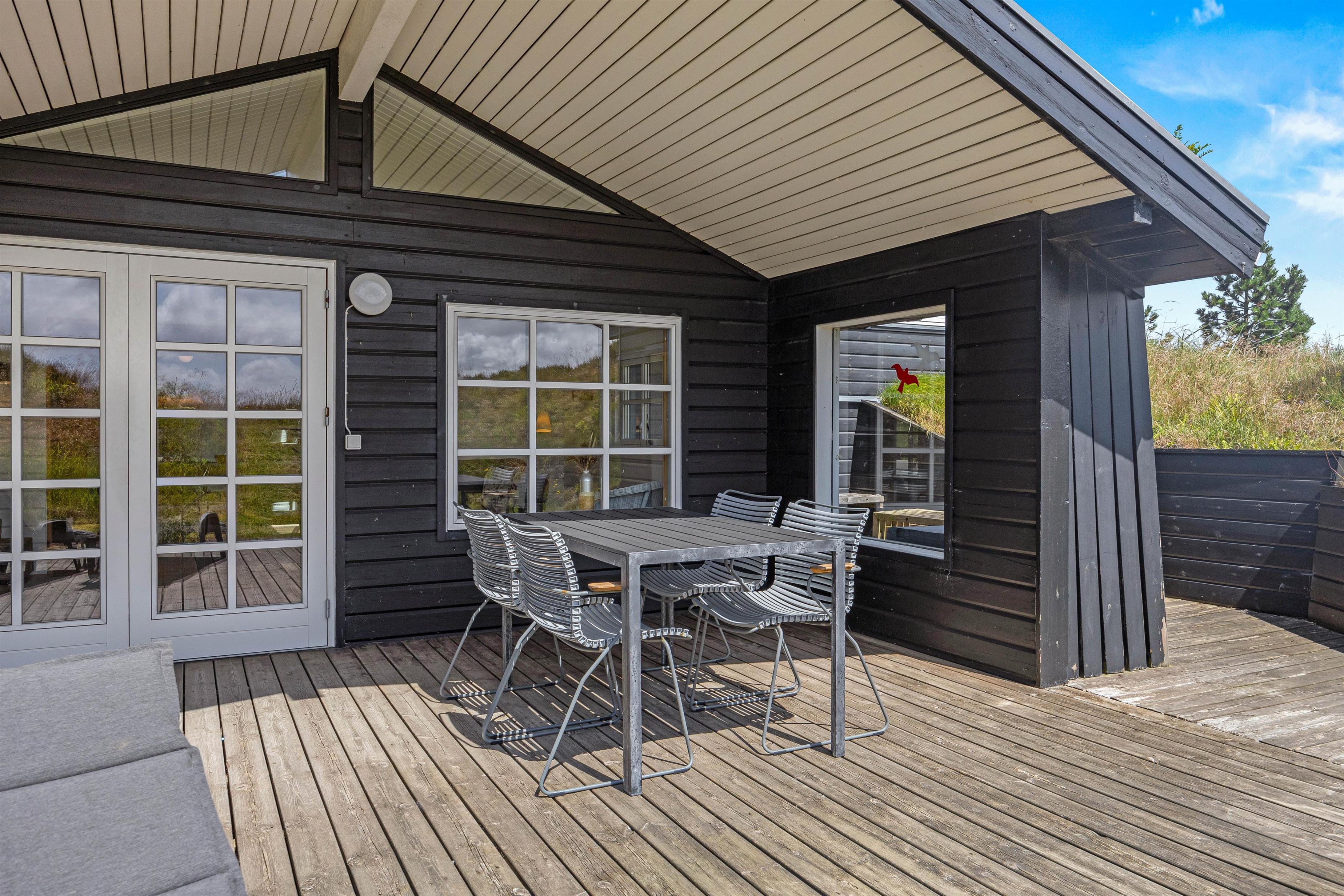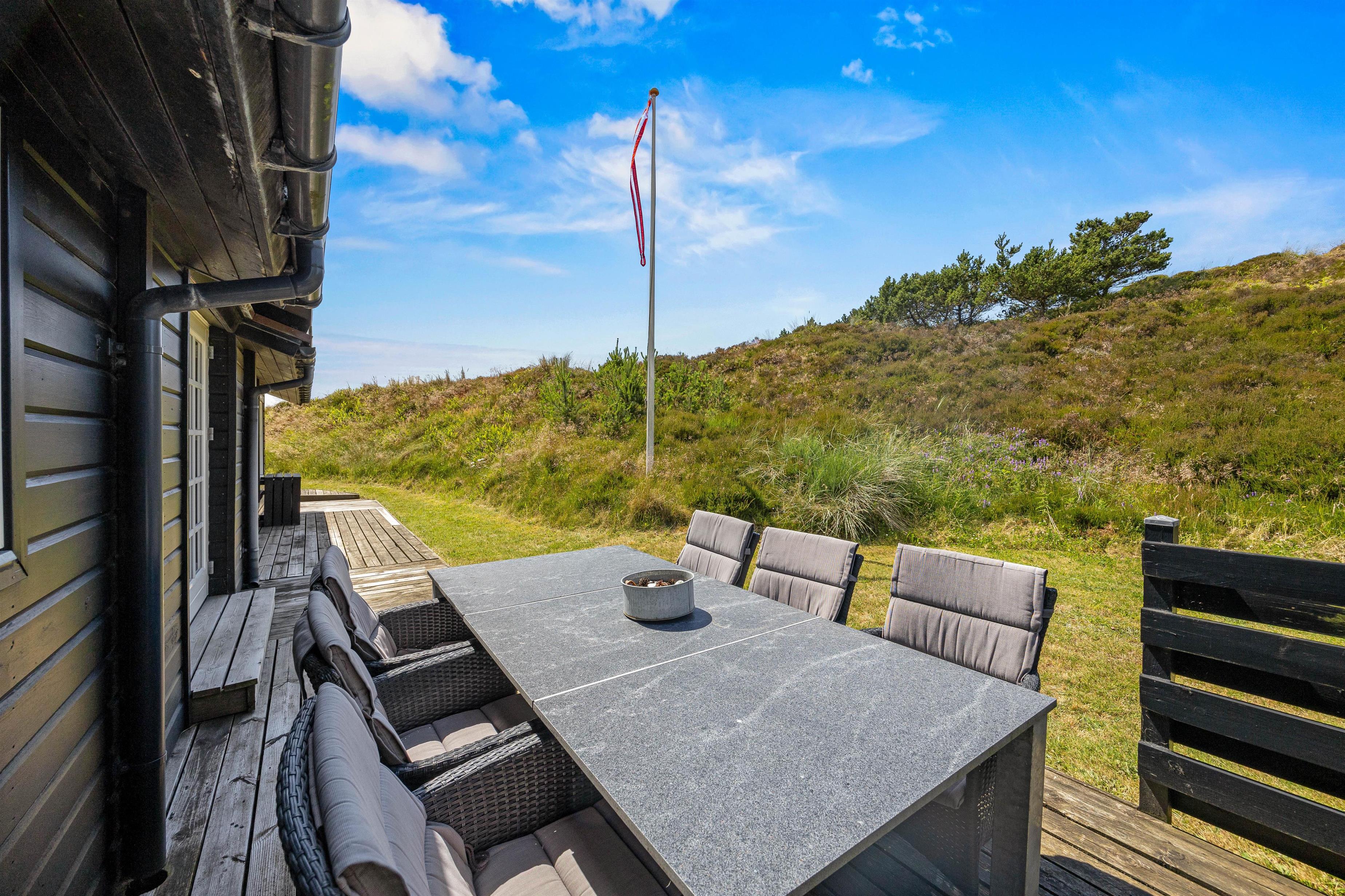 Feriehuset på Tjurvej 44 er beliggende på en storslået naturgrund, og de omkringliggende klitter skærmer for vinden. Udenfor venter jer en dejlig træterrasse, som kan tilgås fra stuen. Terrassen er delvist overdækket – perfekt til de lune sommeraftner, hvor der naturligvis skal grilles - her står en kulgrill til rådighed, og I kan nemt tilberede et lækkert måltid og nyde et køligt glas rosé hertil.