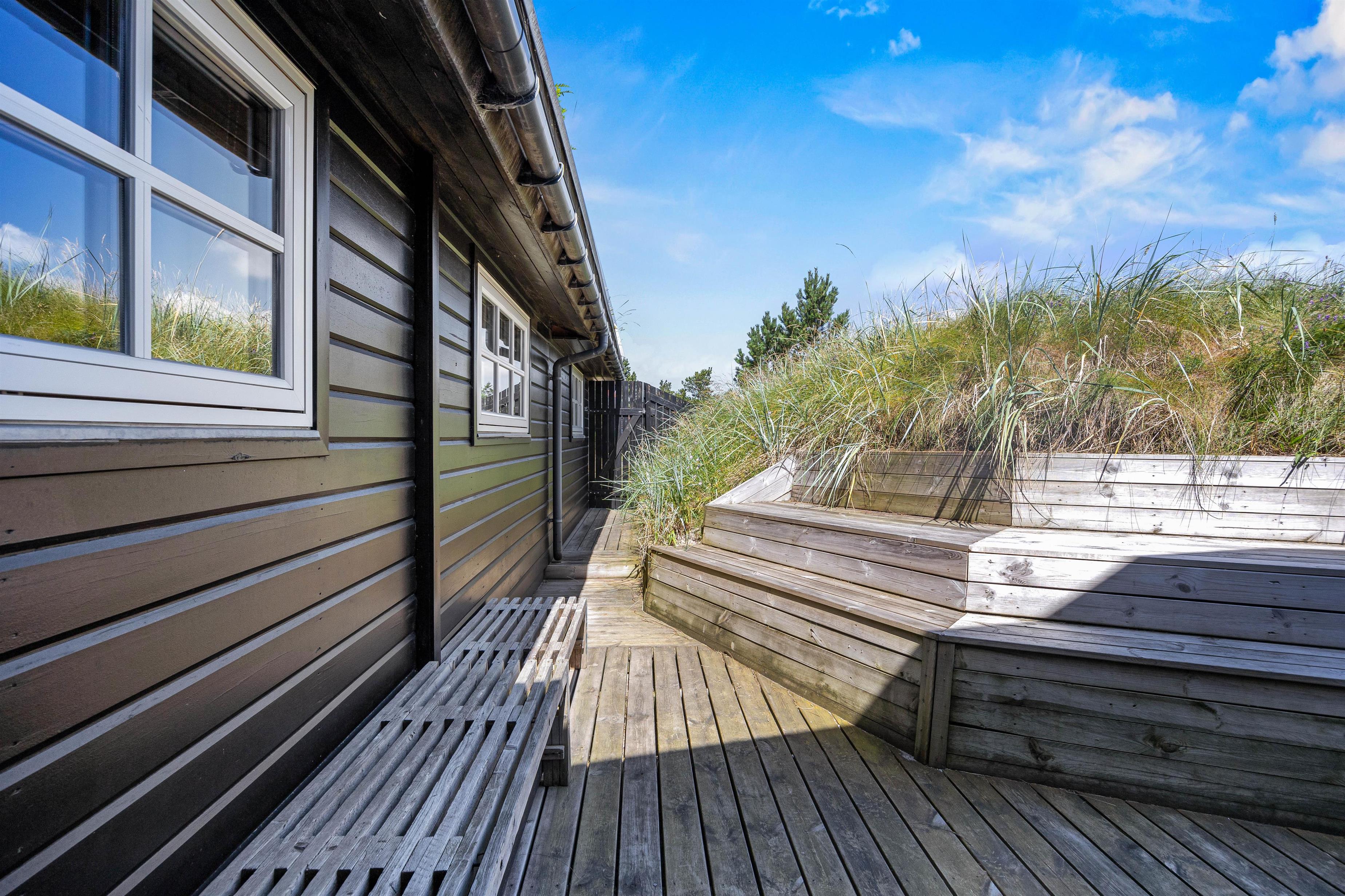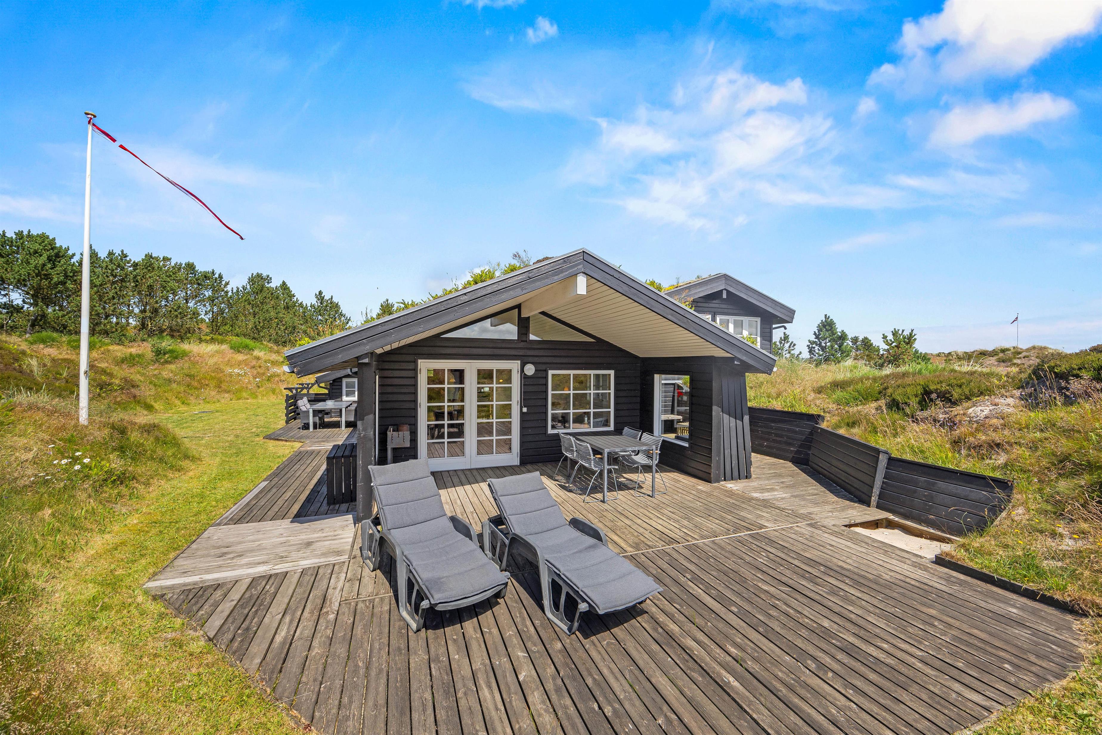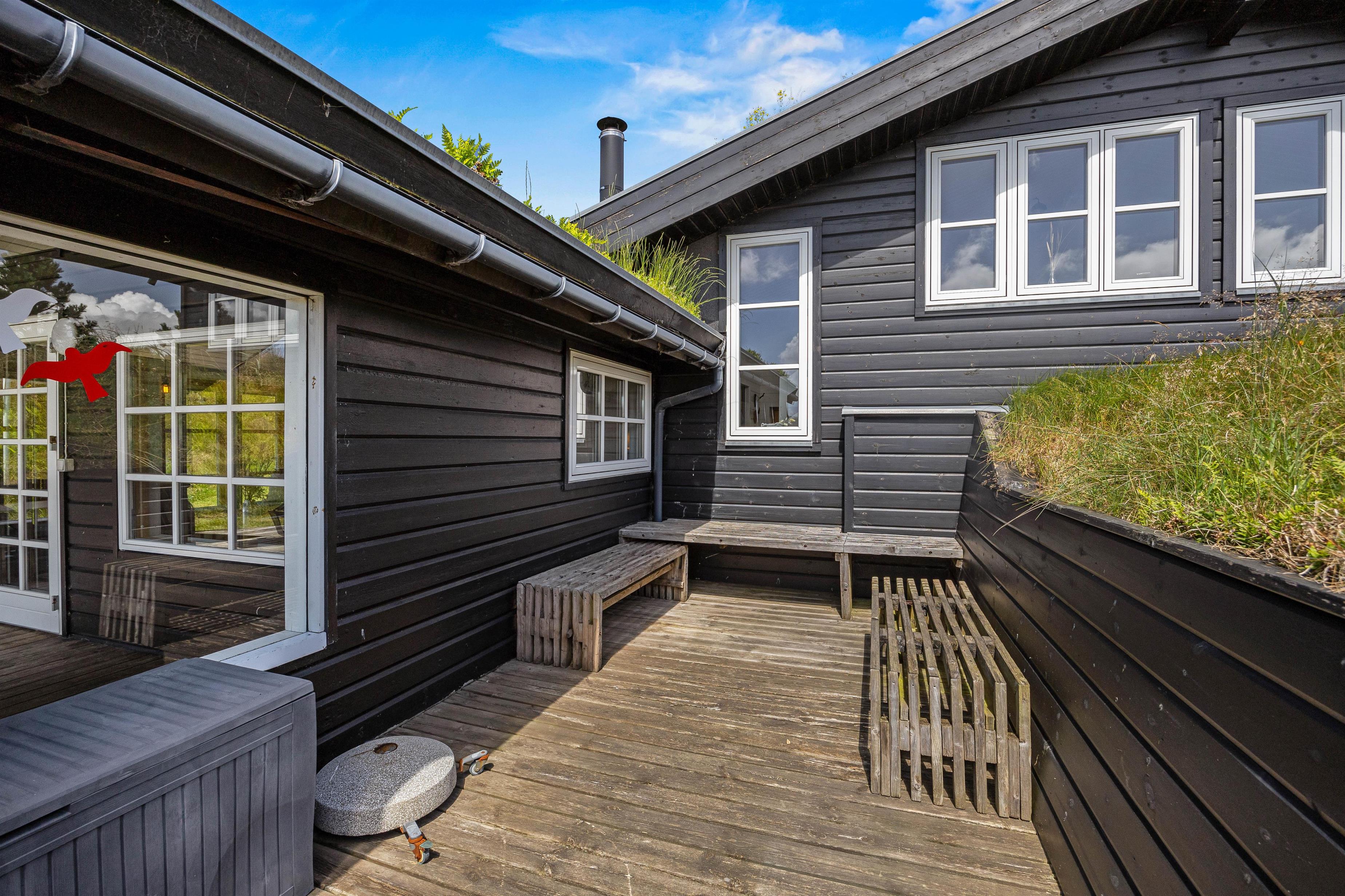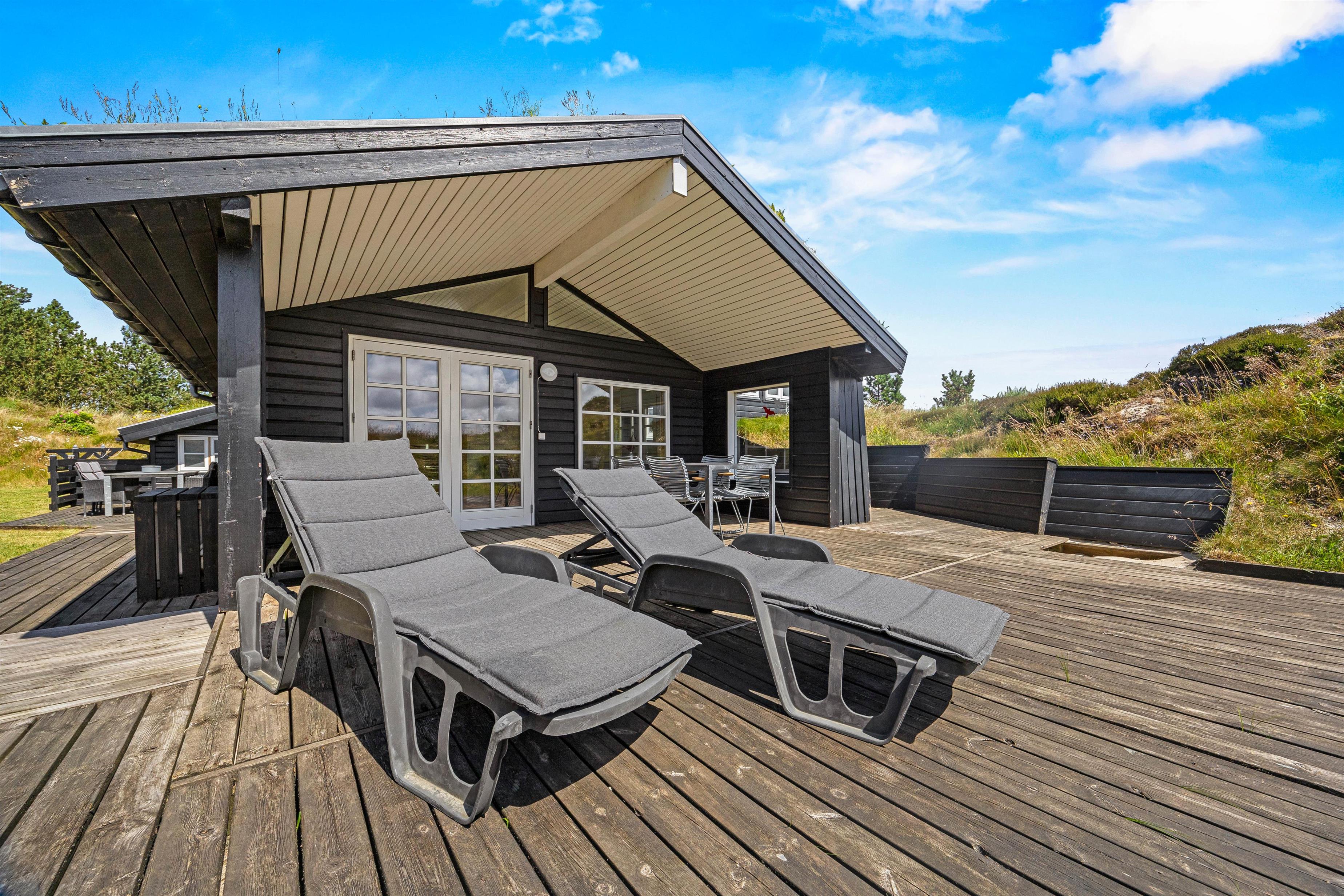 Feriehuset på Tjurvej 44 er beliggende på en storslået naturgrund, og de omkringliggende klitter skærmer for vinden. Udenfor venter jer en dejlig træterrasse, som kan tilgås fra stuen. Terrassen er delvist overdækket – perfekt til de lune sommeraftner, hvor der naturligvis skal grilles - her står en kulgrill til rådighed, og I kan nemt tilberede et lækkert måltid og nyde et køligt glas rosé hertil.