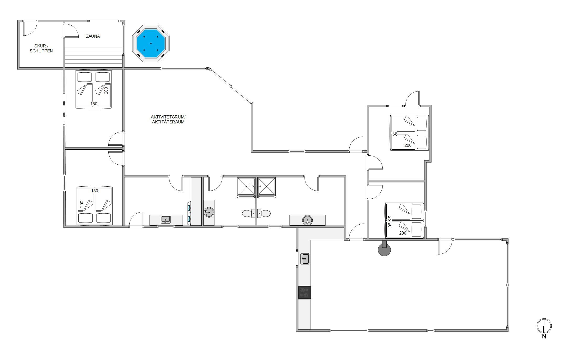Det flotte aktivitetshus råder over hele 160 kvadratmeter og har mere end god plads til 8 personer. Feriehuset har i 2021 gennemgået en renovering, og i den moderne indretning finder I selvfølgelig alle praktiske nødvendigheder.