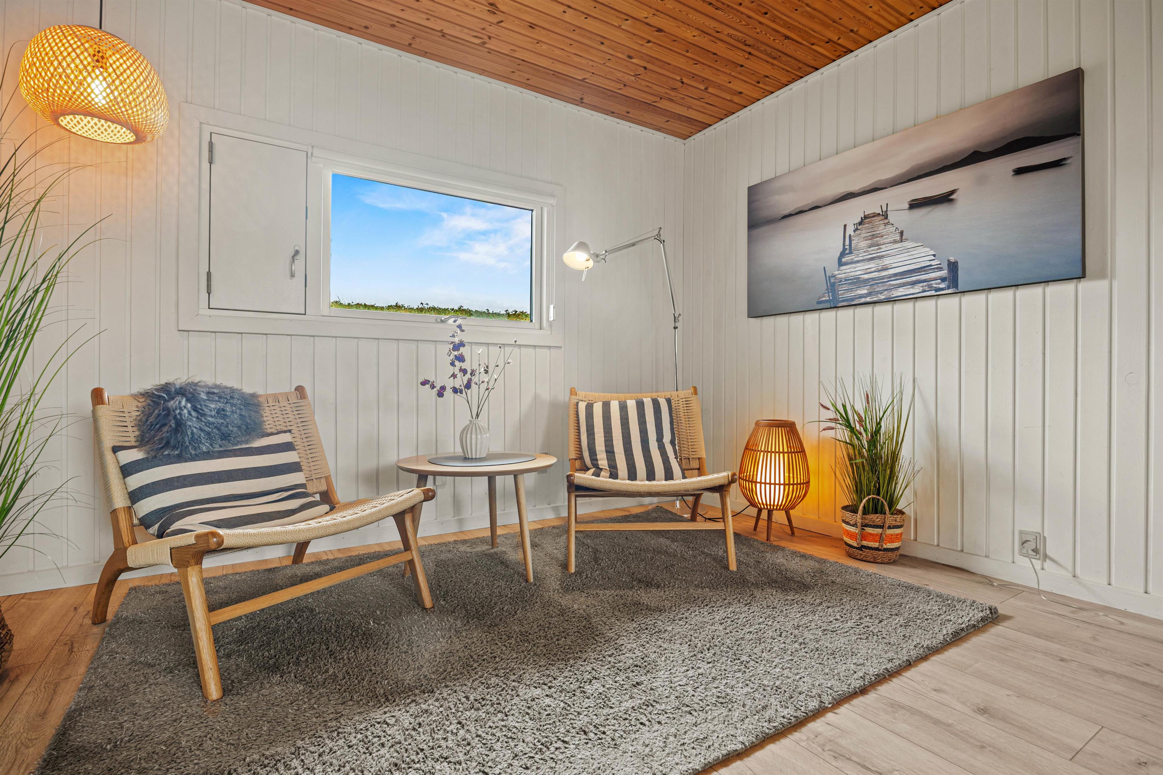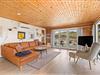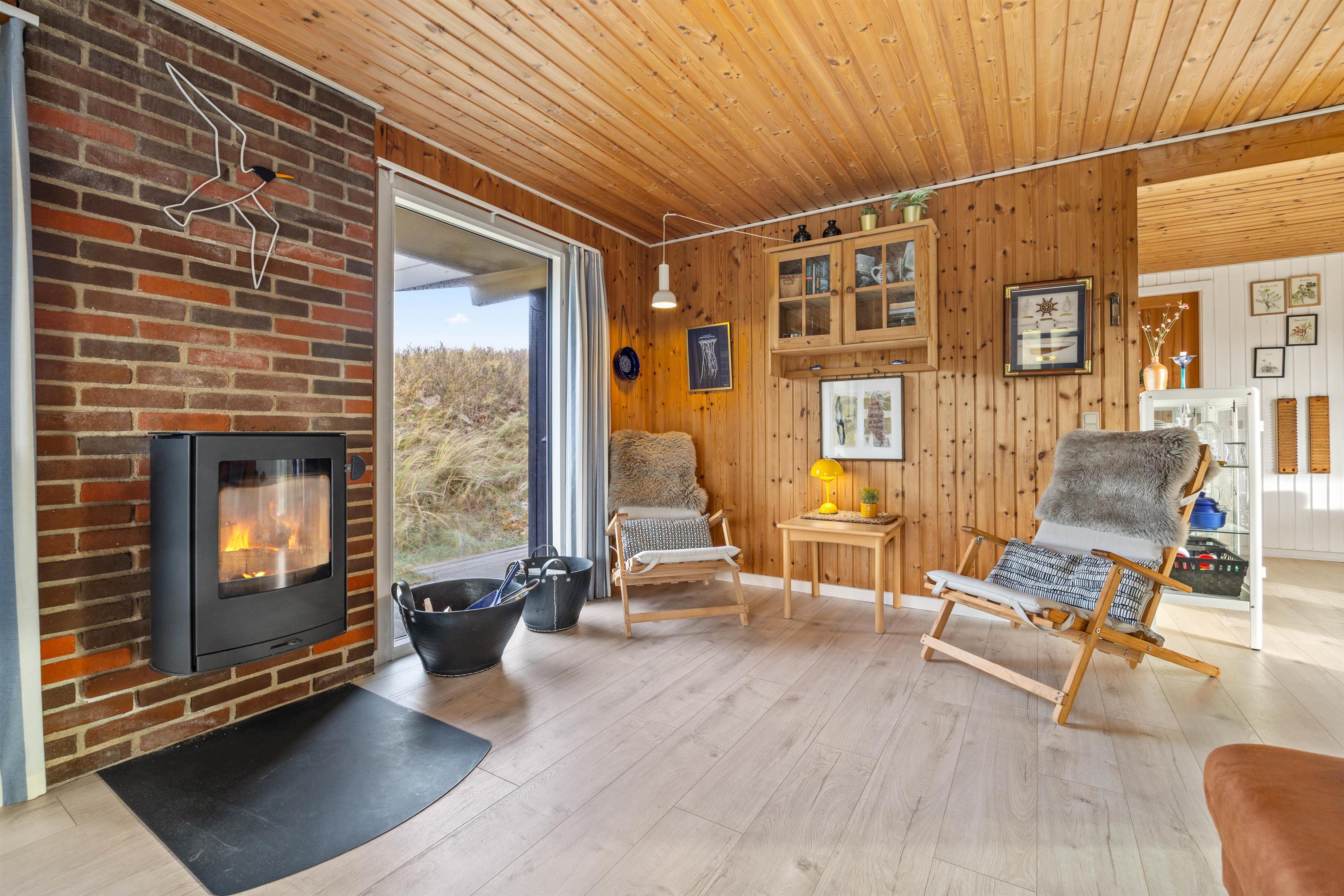 I sommerhusets stue kan I samle hele familien til hyggelige feriestunder med spil og film: feriehusets 55"" fjernsyn med indbygget Apple TV og Google Chrome byder på mange timers underholdning. I stuen sørger brændeovnen for at sætte prikken over i’et for feriestemningen med sin knitren i baggrunden og varme. Ellers er her også en varmepumpe, der sørger for gode temperaturer i sommerhuset.