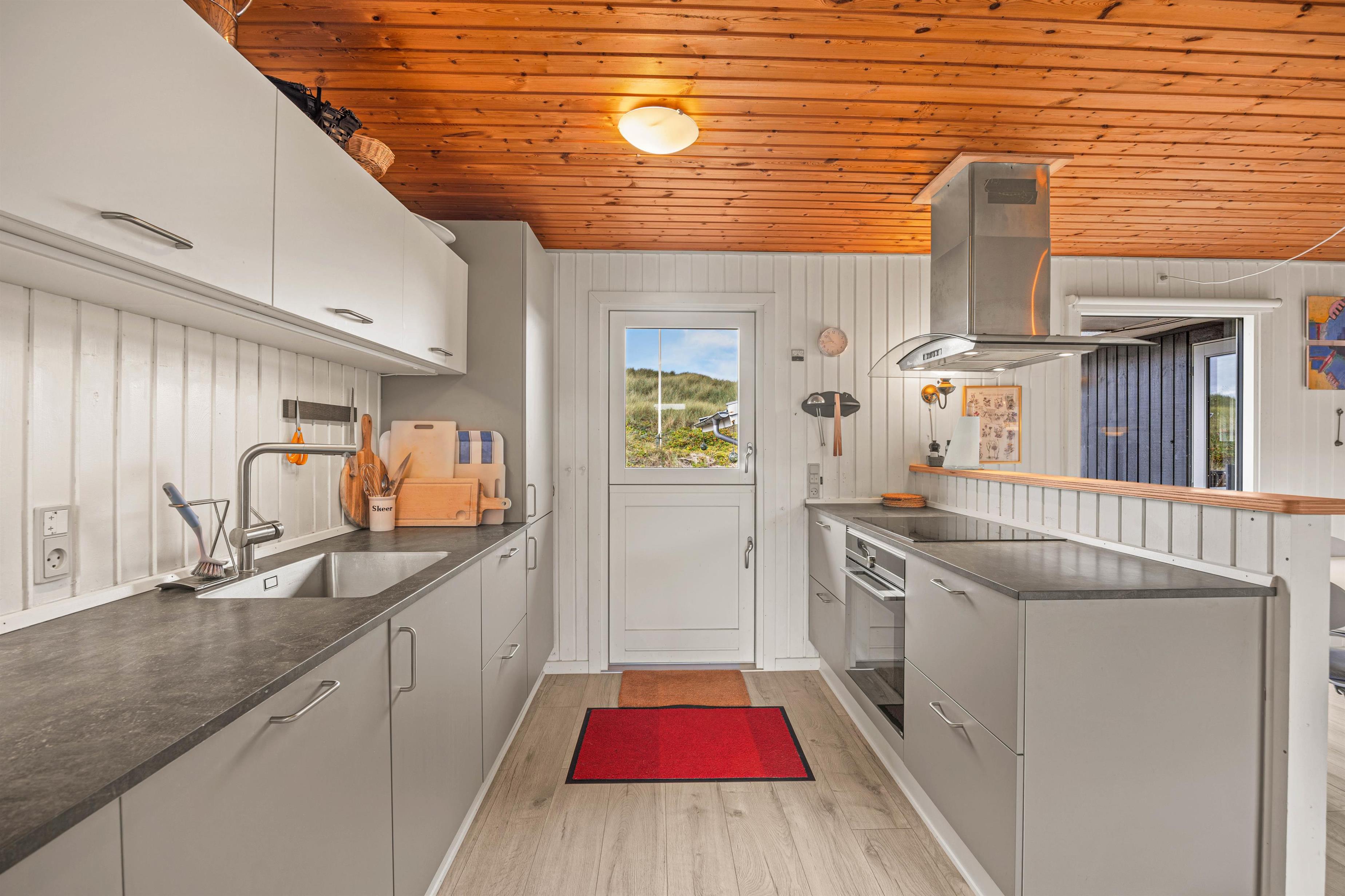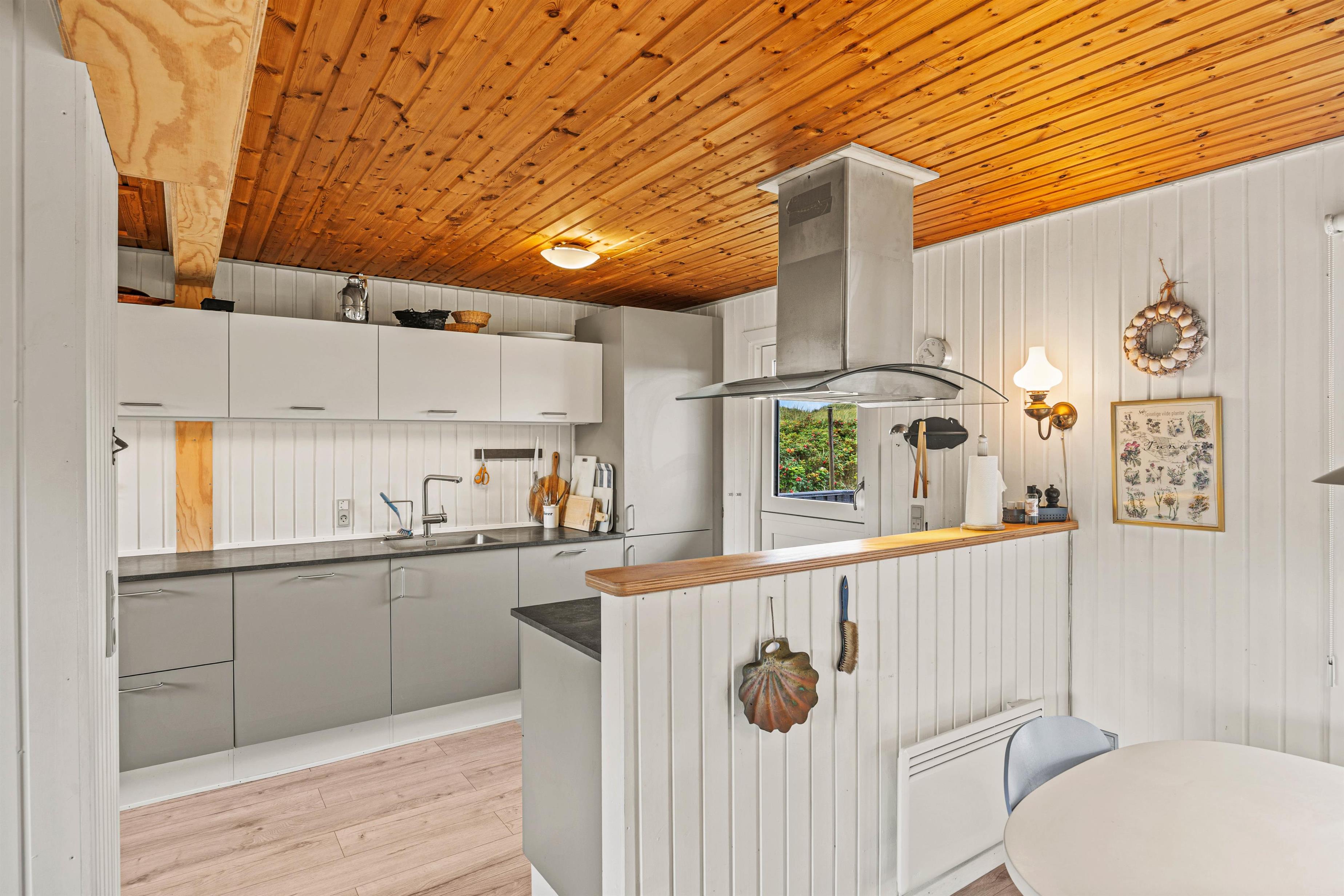 Sommerhuset køkken og bryggers er veludstyret, og her findes der bl.a en vaskemaskine, en bageovn med integreret mikrobølgeovn og opvaskemaskine. En fryser på 80l er også tilrådighed i sommerhuset.