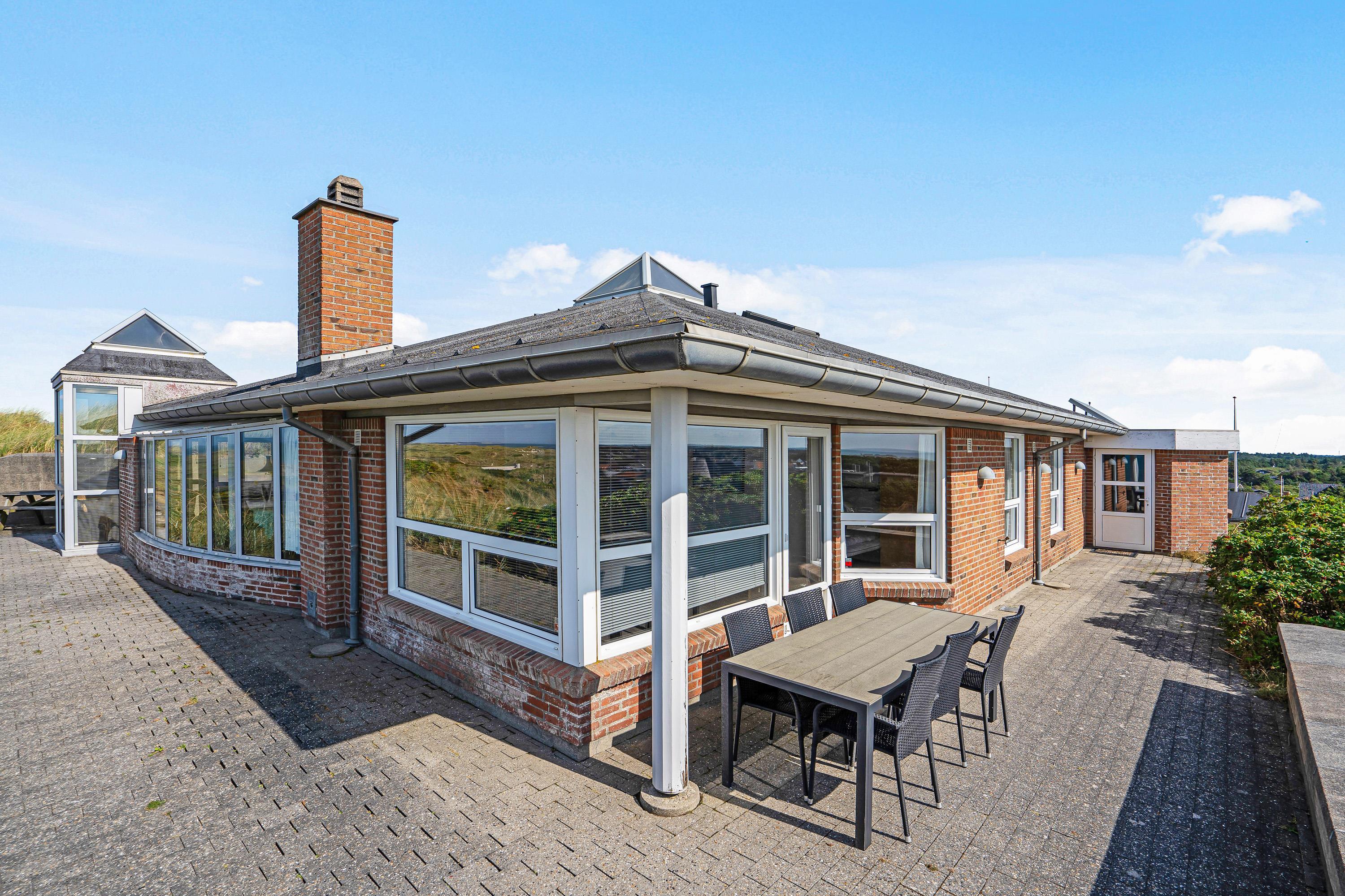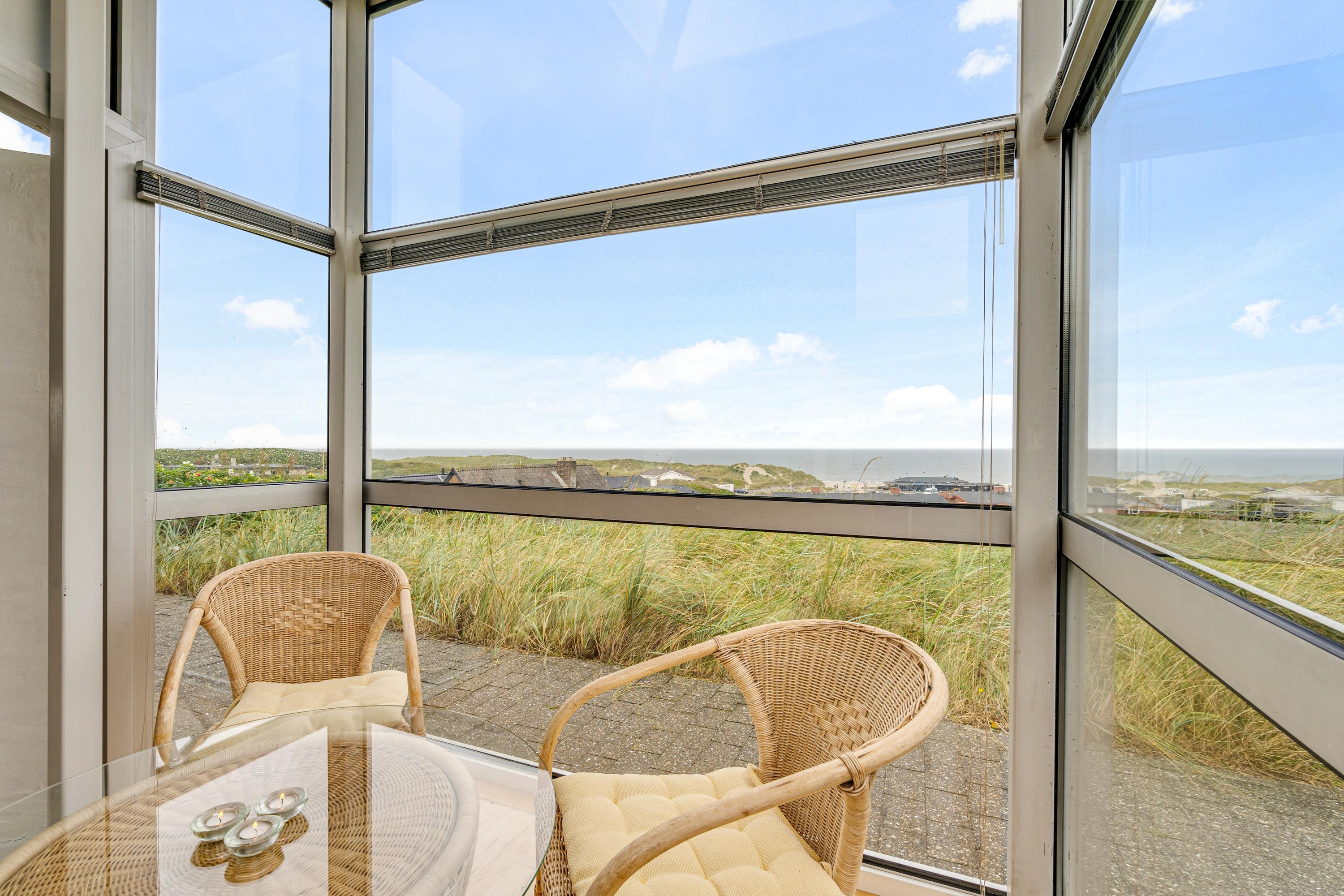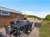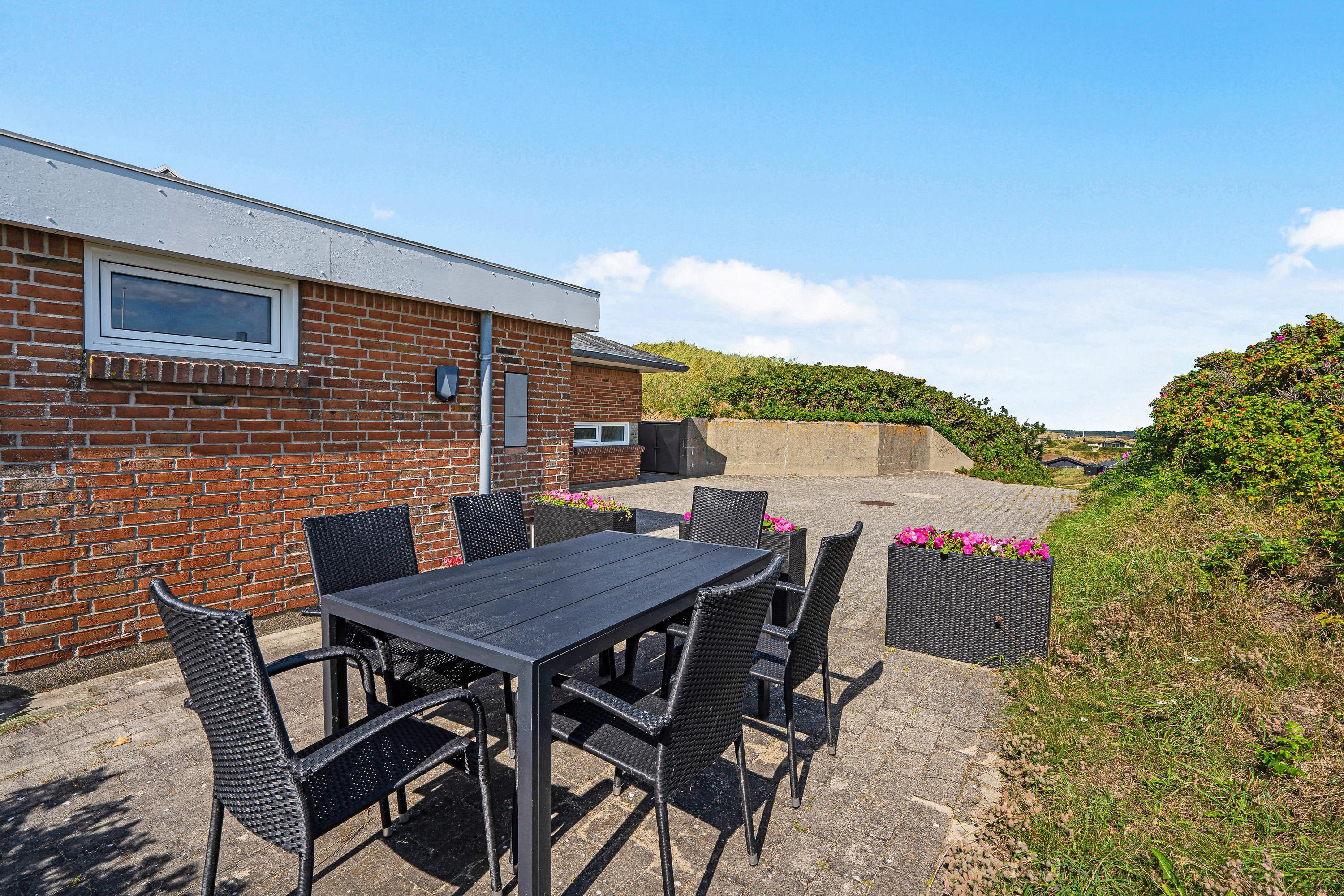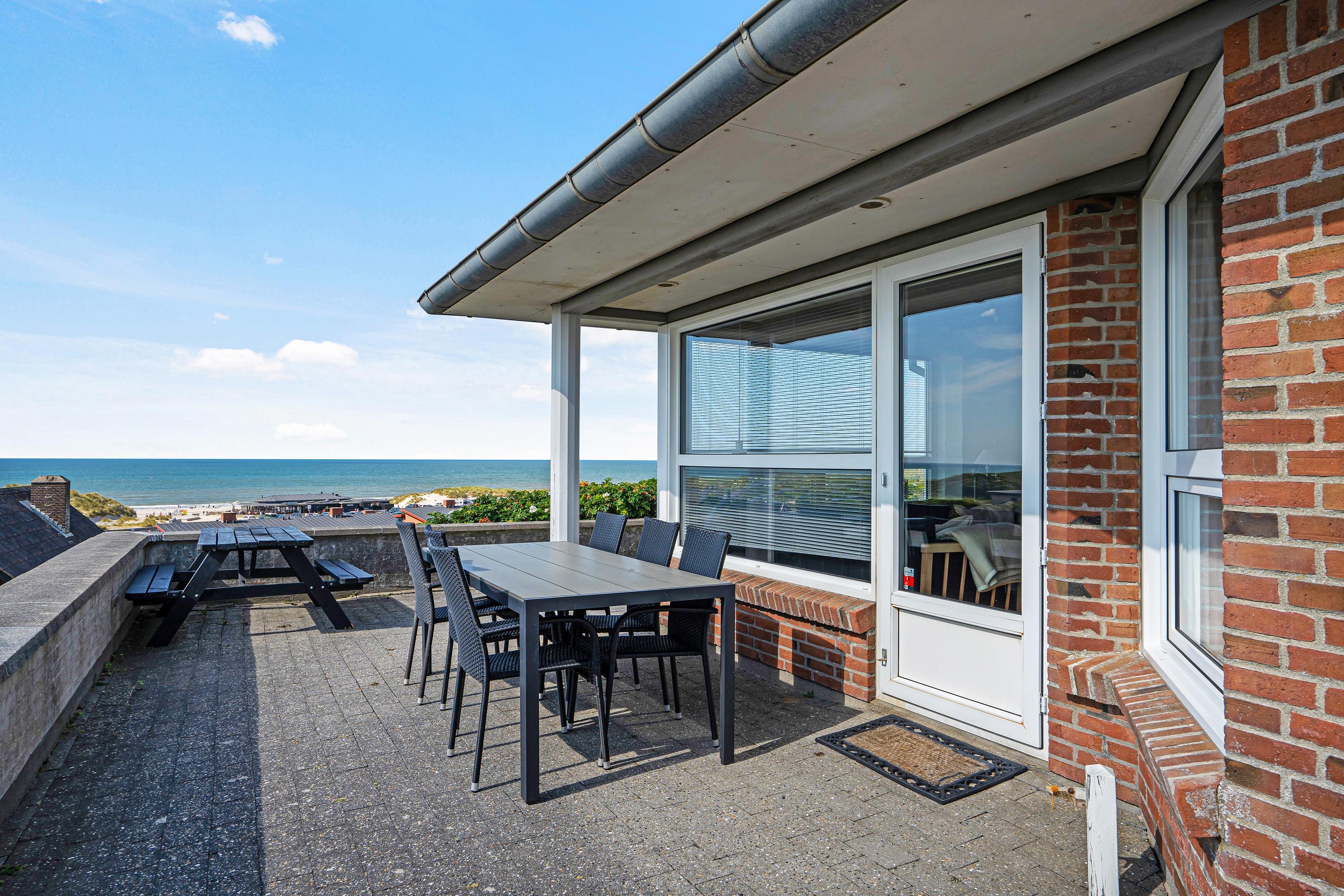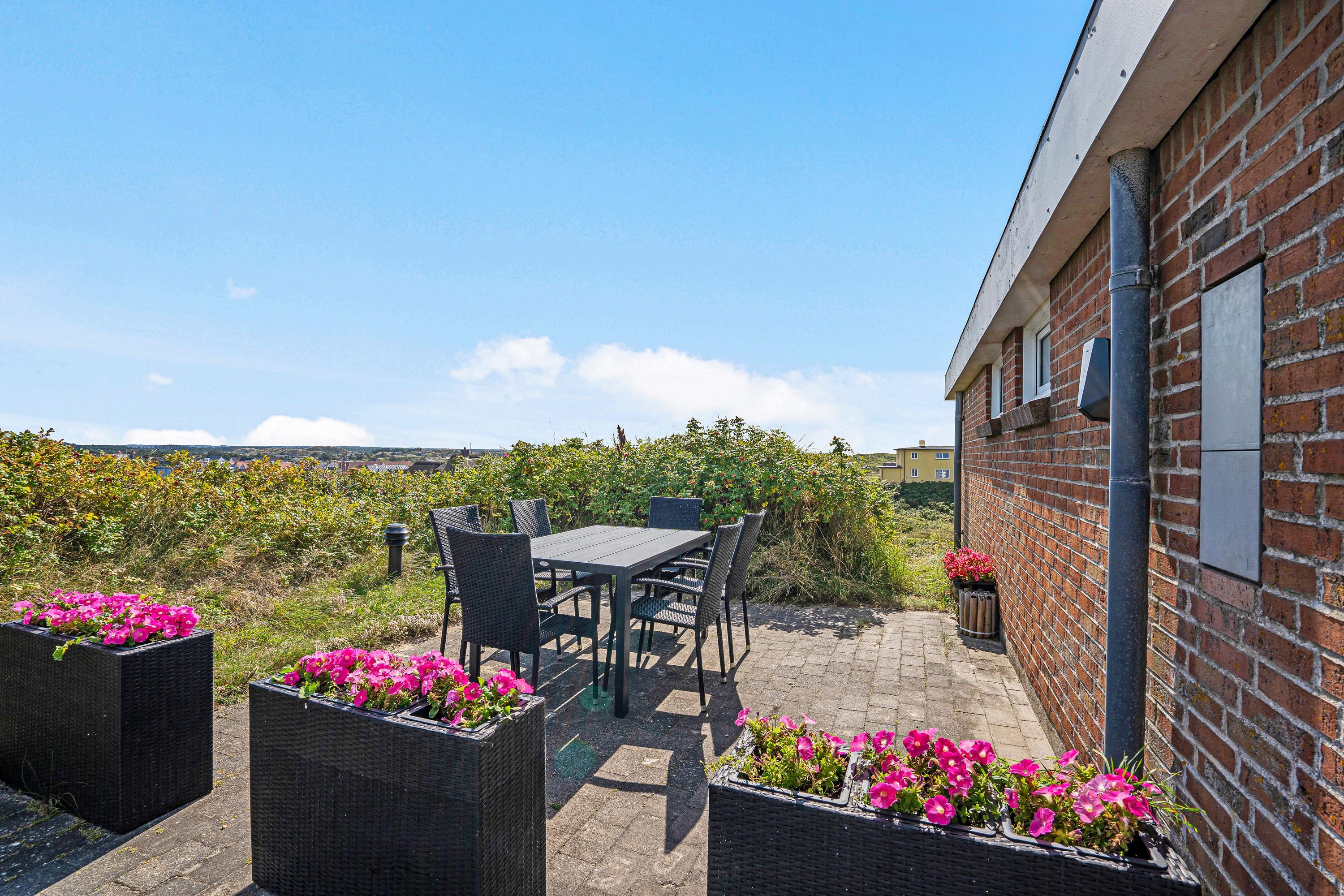 Udsigten til Vesterhavet og landskabet kan I også nyde fra sommerhusets terrasse. Terrassen er afskærmet og her står både havemøbler og liggestole klar til jer, så I kan få så meget som muligt ud af de varme feriedage.