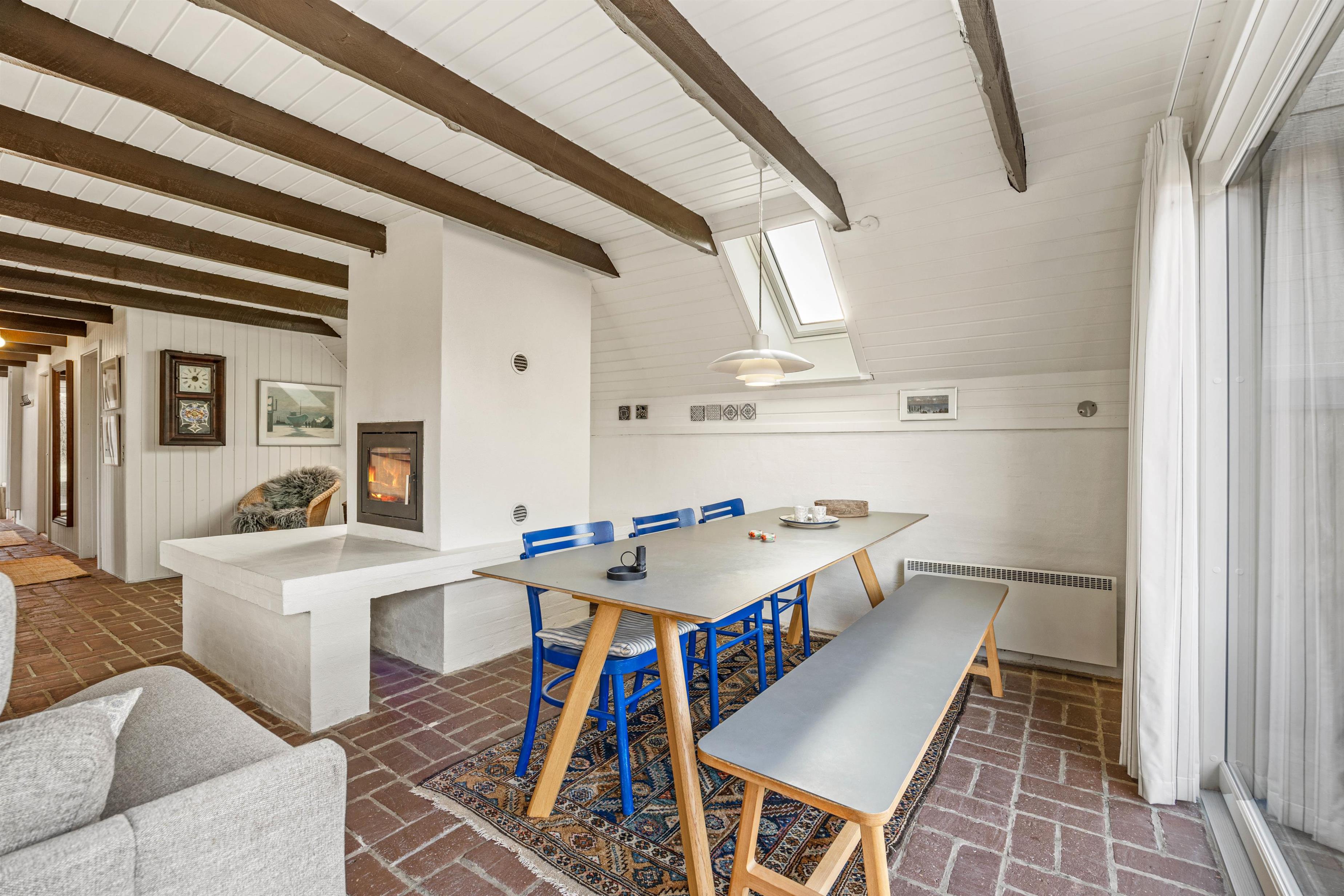 Det fine sommerhus på 84 m2 er meget indbydende med sine gode, lyse rum. Her er kredset for hyggen, og den centralplaceret brændeovn er prikket over i´et. Her er et åbent opholds- og spiseområde til familielivet, hvor den varmende brændeovn også fungerer som rumdeler.