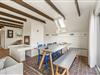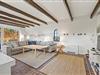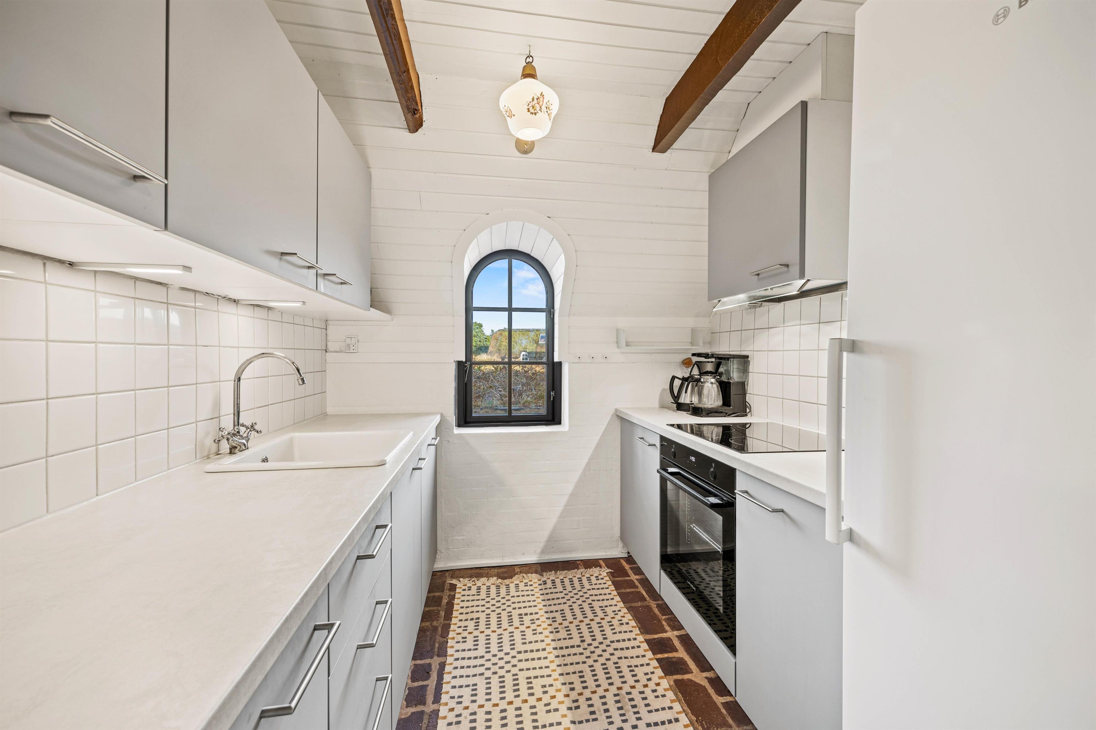 Opholdsrummet er hyggeligt indrettet med komfortable møbler, smukke, mørke loftsbjælker, og det store vindue mod vest inviterer lyset indenfor. Her kan I planlægge feriedagenes program, læse en god bog og tilberede lækre retter i køkkenet. I det velholdte køkken finder I en separat fryser, 50 L, samt en opvaskemaskine, der klarer det kedelige arbejde.