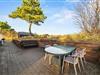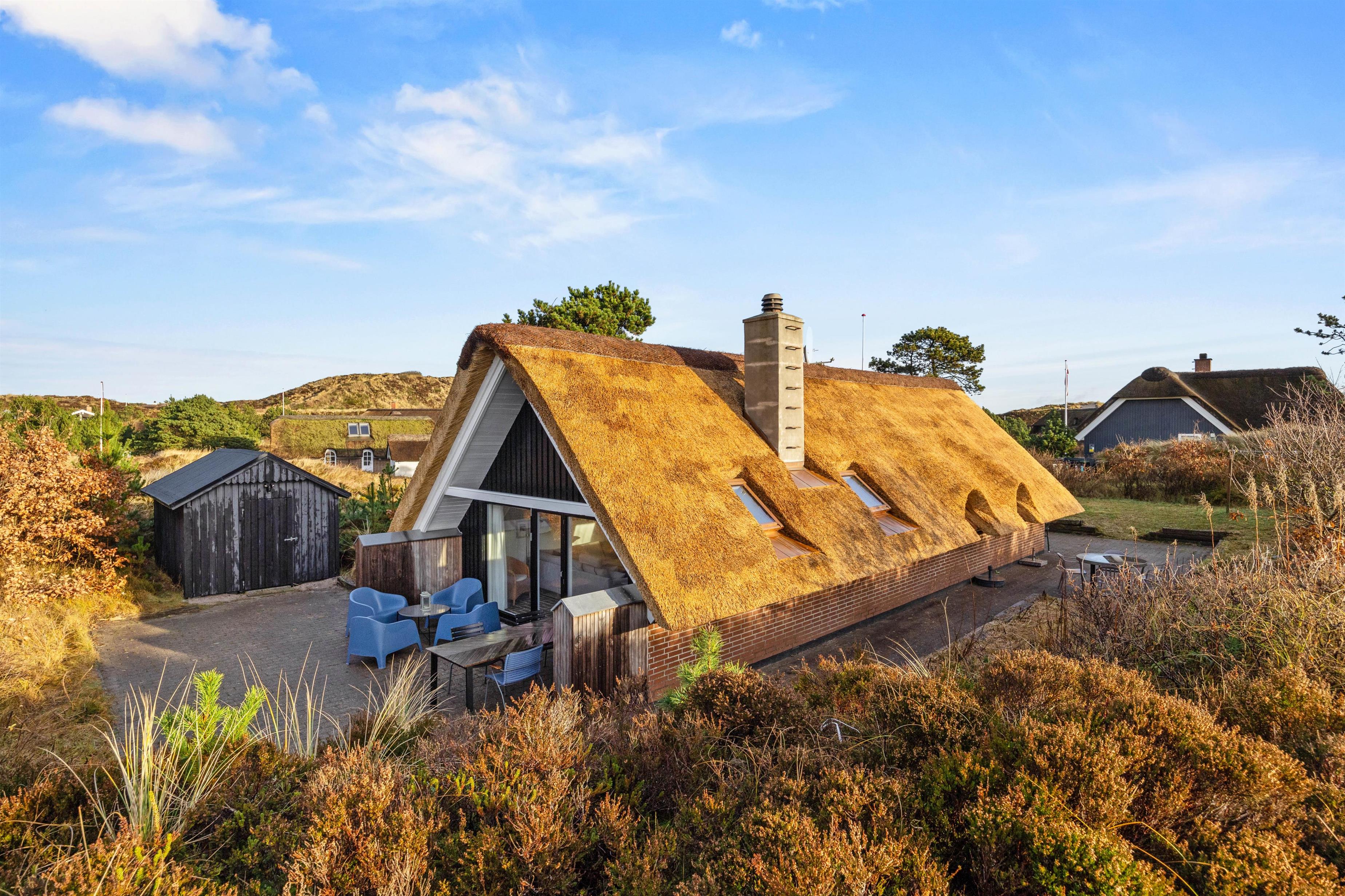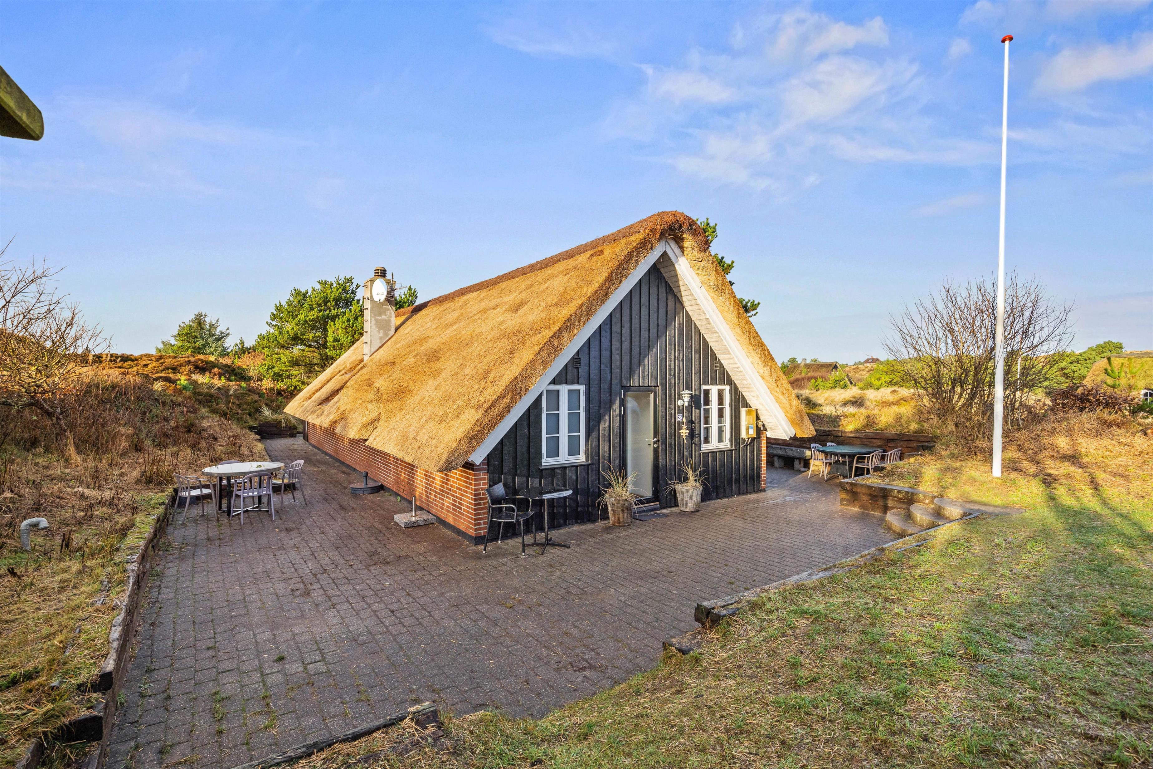 Sommerhuset er beliggende på en smuk lyngbeklædt naturgrund. Fra stuen er der direkte udgang til den ene af feriehusets dejlige fliseterrasser mod vest. Mod øst er der også anlagt terrasse, så I kan placere jer alt efter vind og solens placering. Om aftenen skal der tændes op i grillen, så I kan få lidt ekstra godt at spise. Mens grillen varmer, kan I spille et spil kort eller nyde et glas vin i fred og ro. Afslut den lune sommeraften ved stranden, hvor I kan se solnedgangen bade himlen i farver. Vesterhavet er nemlig små 800 meter herfra.