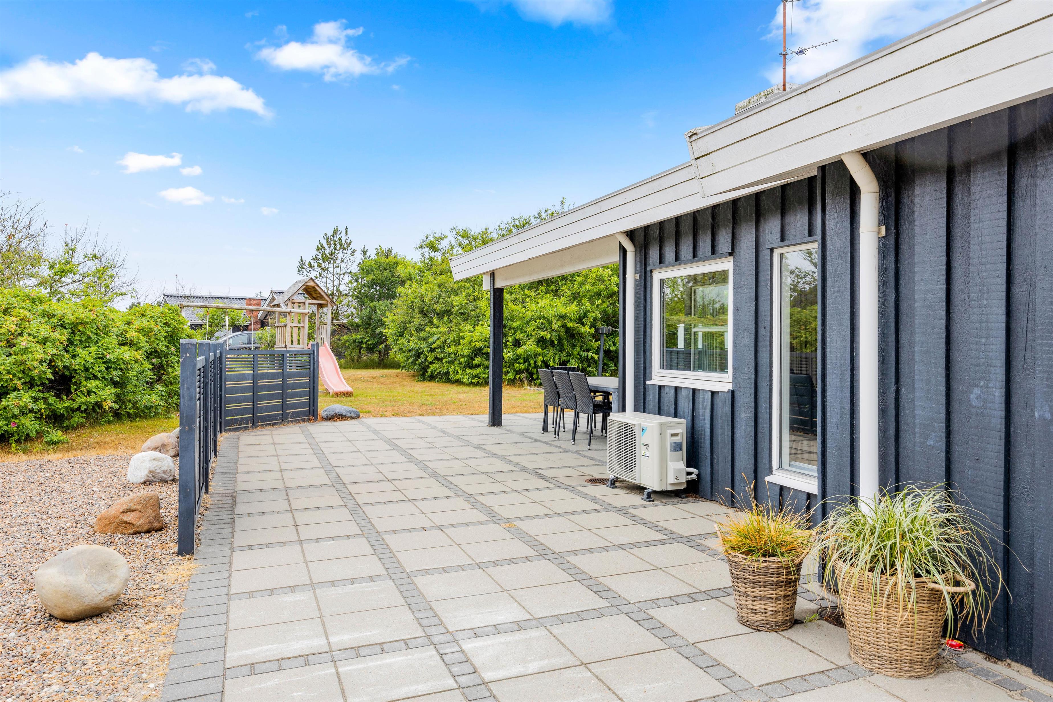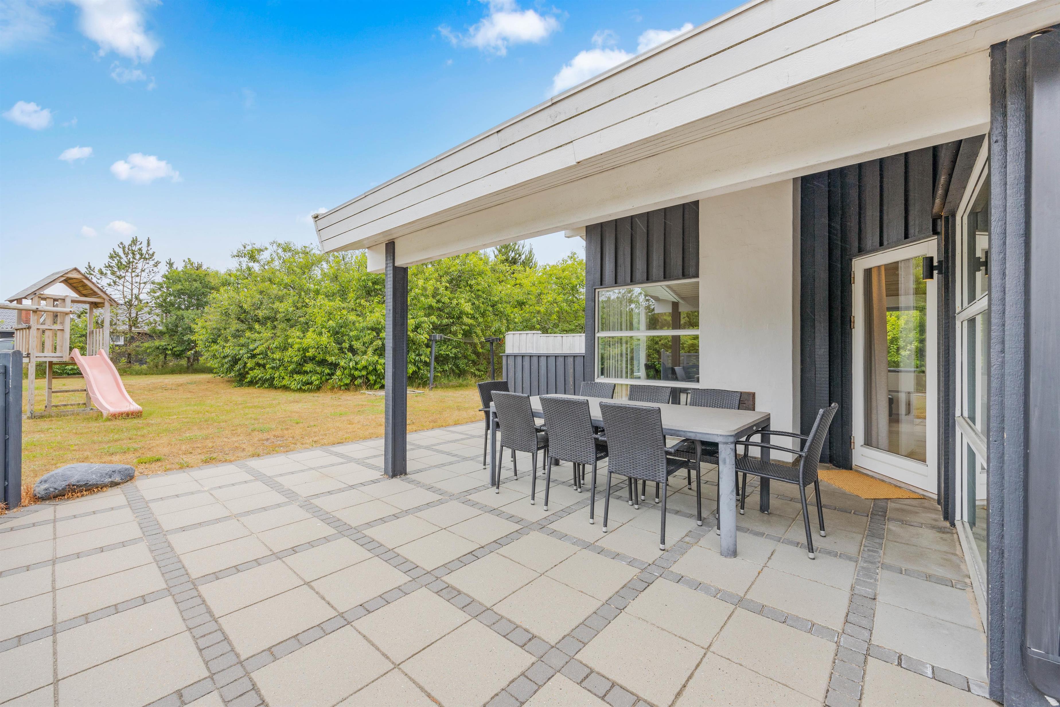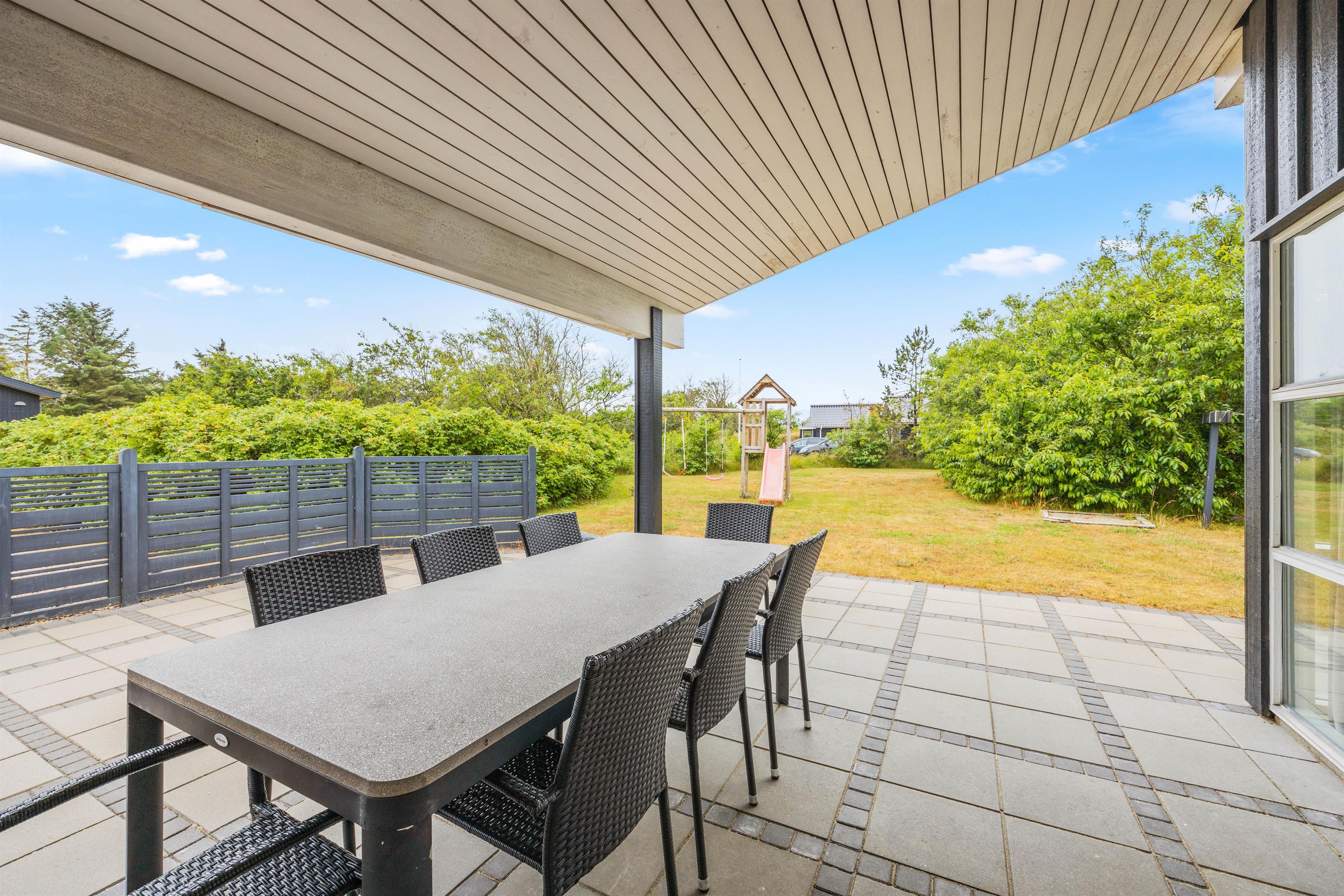 Fra alrummet er der udgang til feriehusets sydvendte terrasse. Her kan I sidde overdækket og i læ. Terrassen er åben ud til den grønne plæne, hvor de mindste kan lege frit på gyngestativet, mens I kan slå jer ned i havemøblerne eller sole jer på solvognene. Om aftenen kan I hive grillen frem og tilberede en dejlig middag herpå.