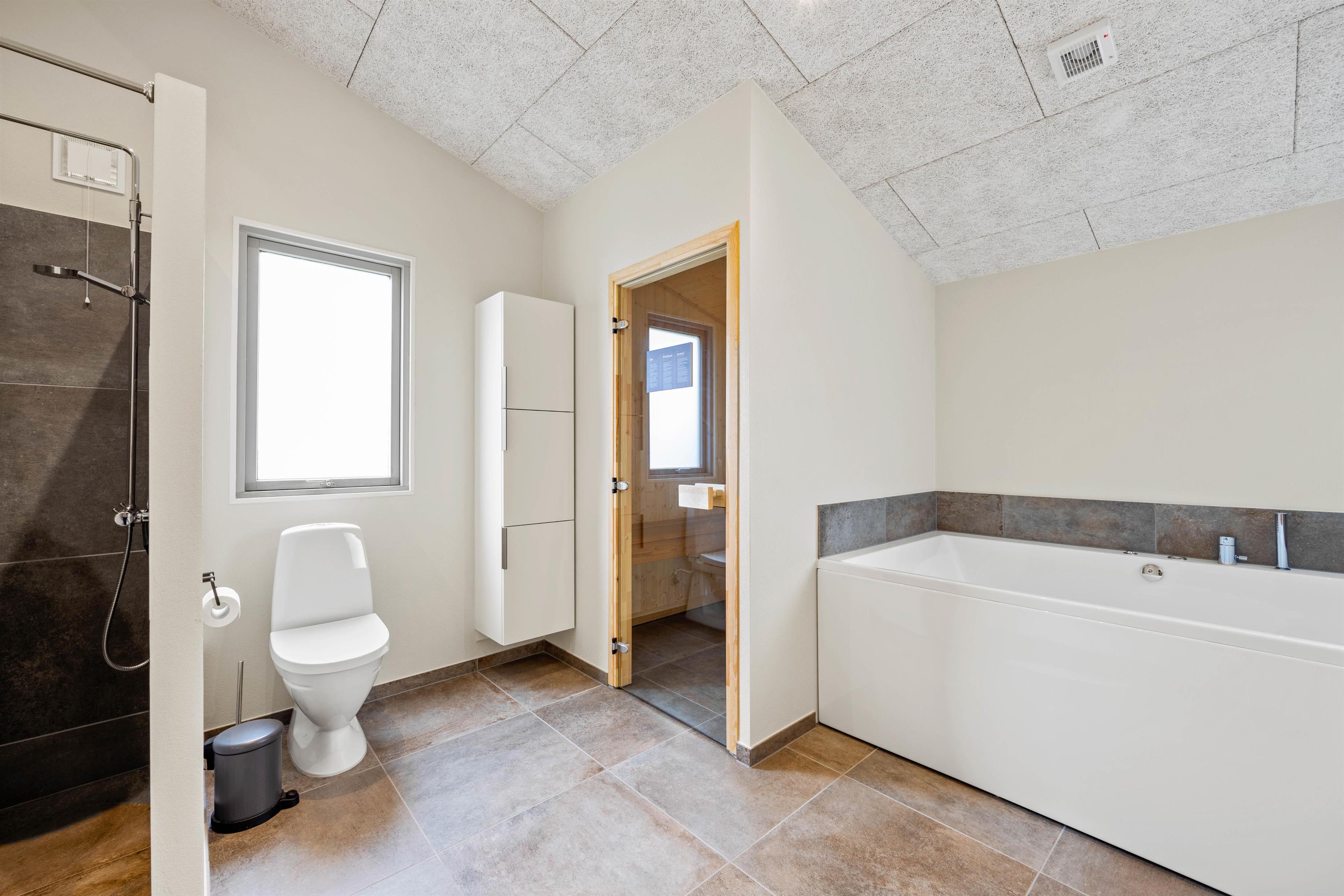 Fra feriehusets entré møder I som det første på højre hånd det store og flotte badeværelse med bruseniche, spa og sauna. Her er plads til ægte afslapning. Så tænd op for saunaen eller fyld vand op i spaen og læn jer så tilbage. Feriehuset har i alt 2 badeværelser med bruseniche, så der behøver aldrig være kø om morgenen. I skal heller ikke tænke på kolde tæer, da begge badeværelser er udstyret med gulvvarme.